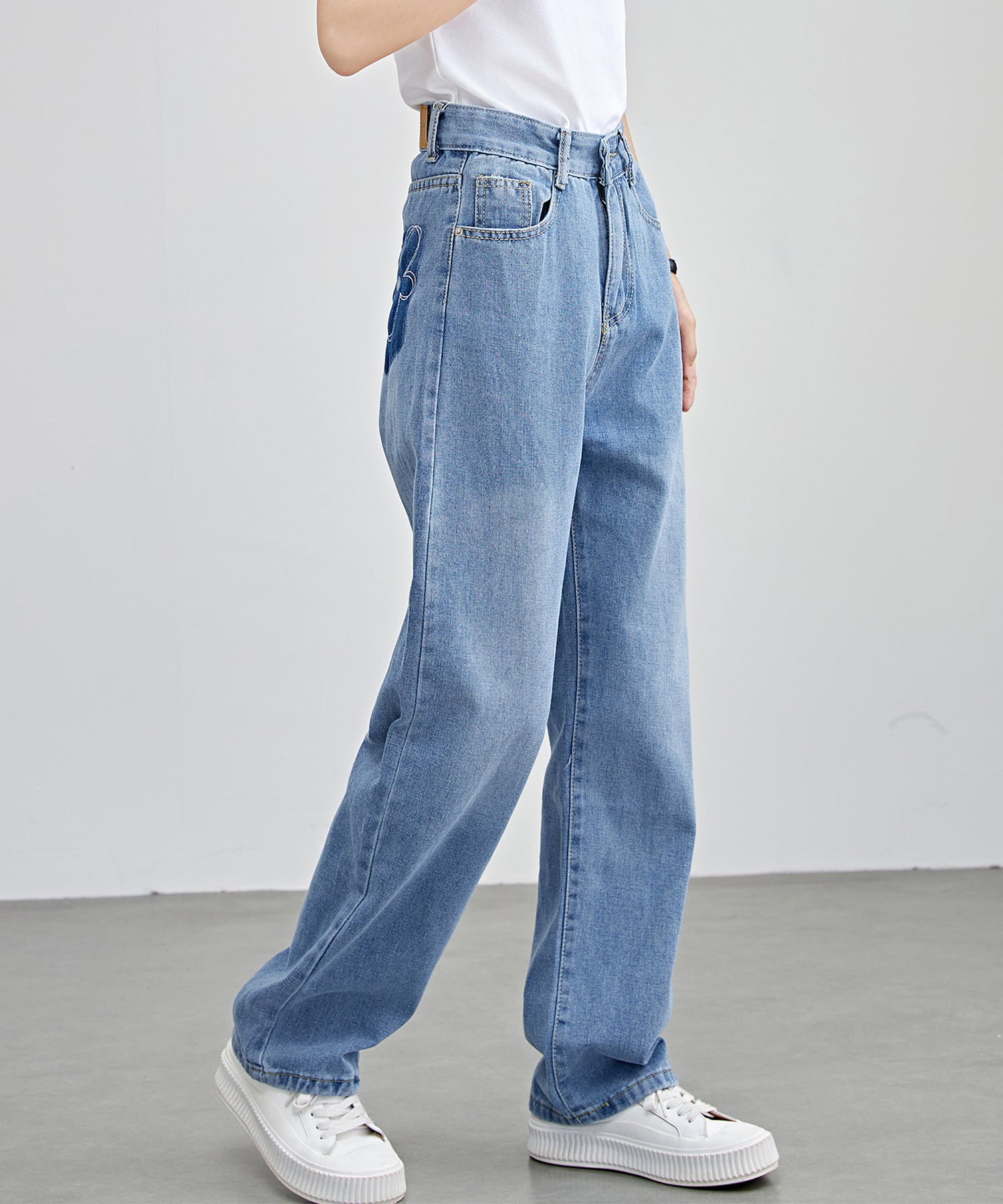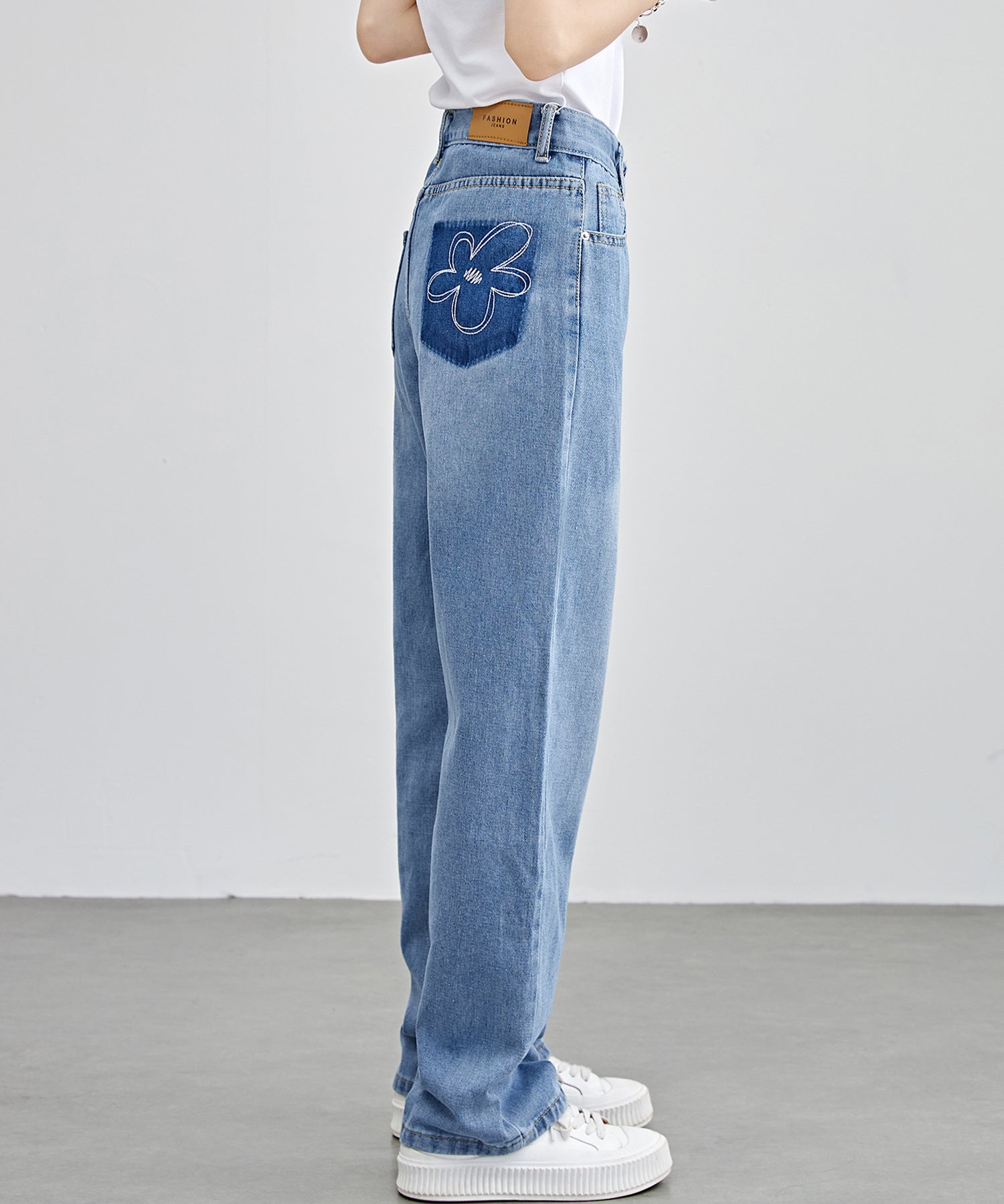 フラワー柄 ポケット付き ハイウエスト ストレート デニムパンツ