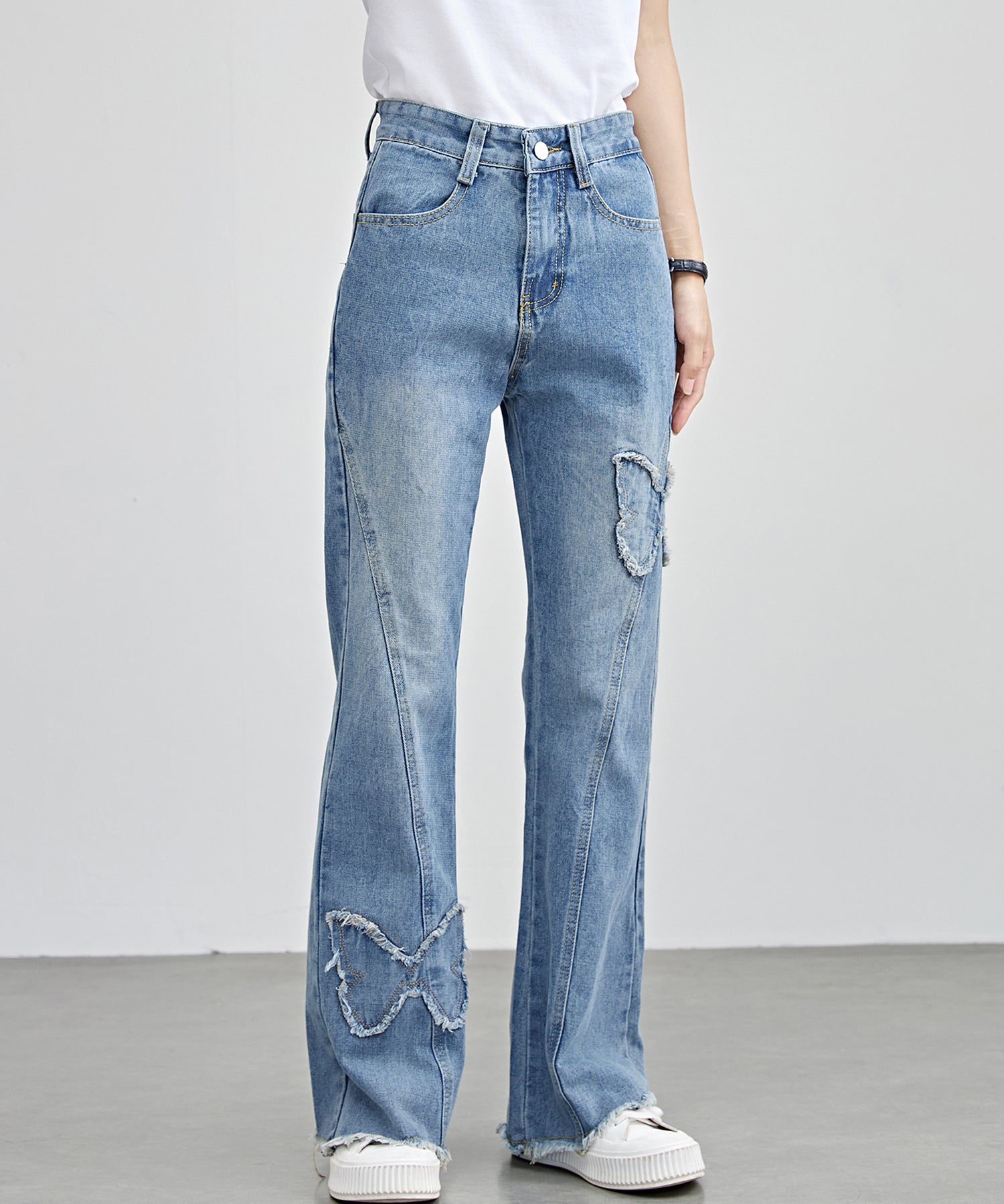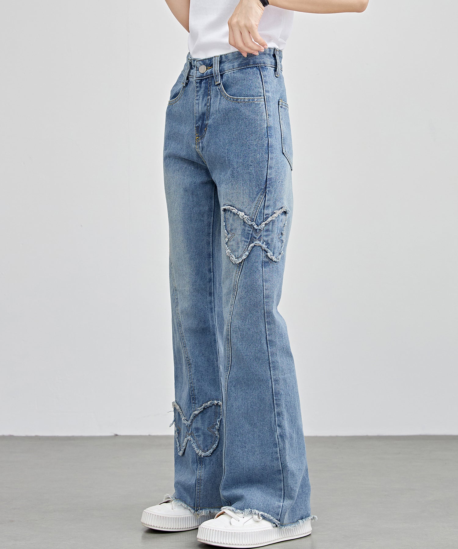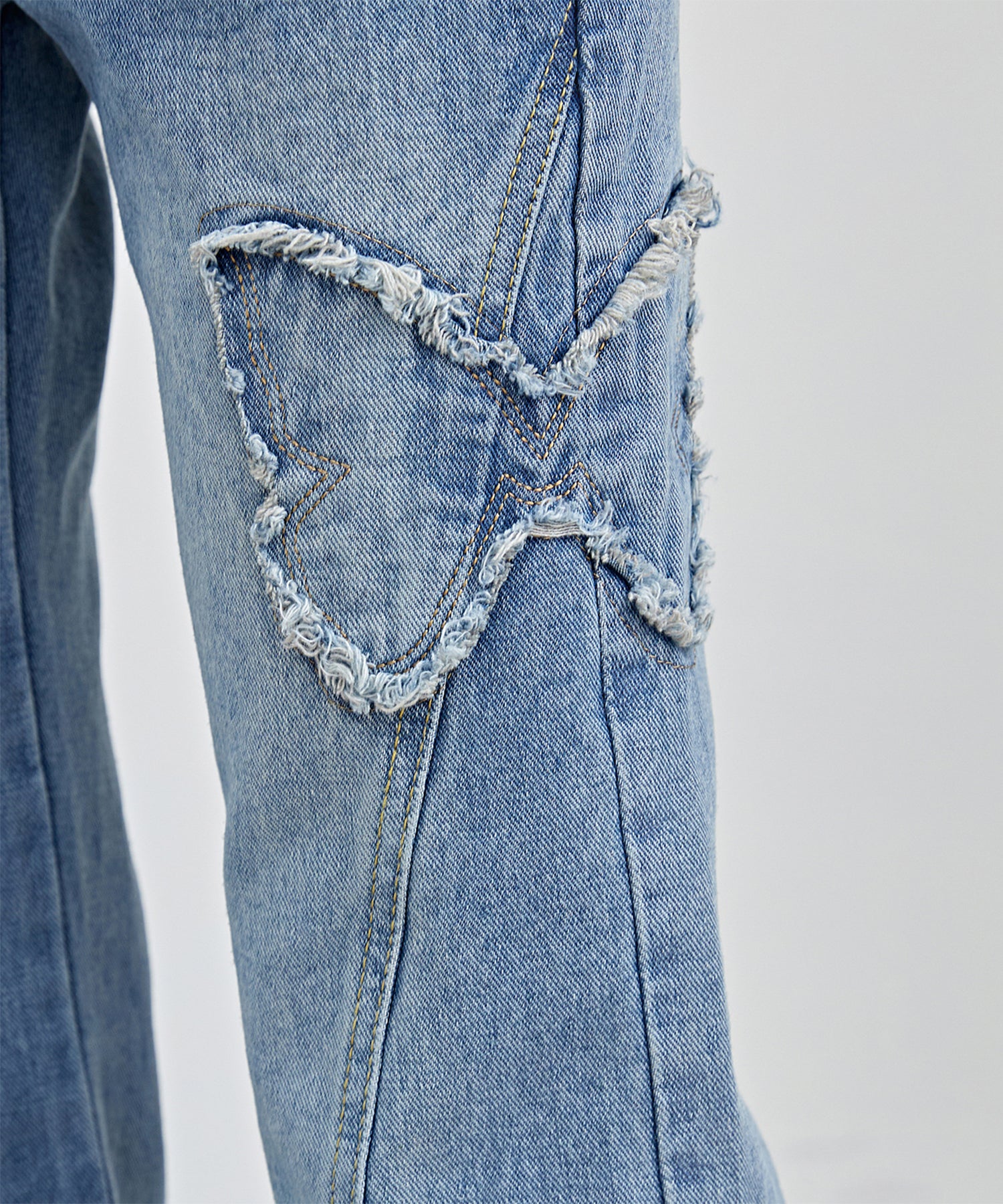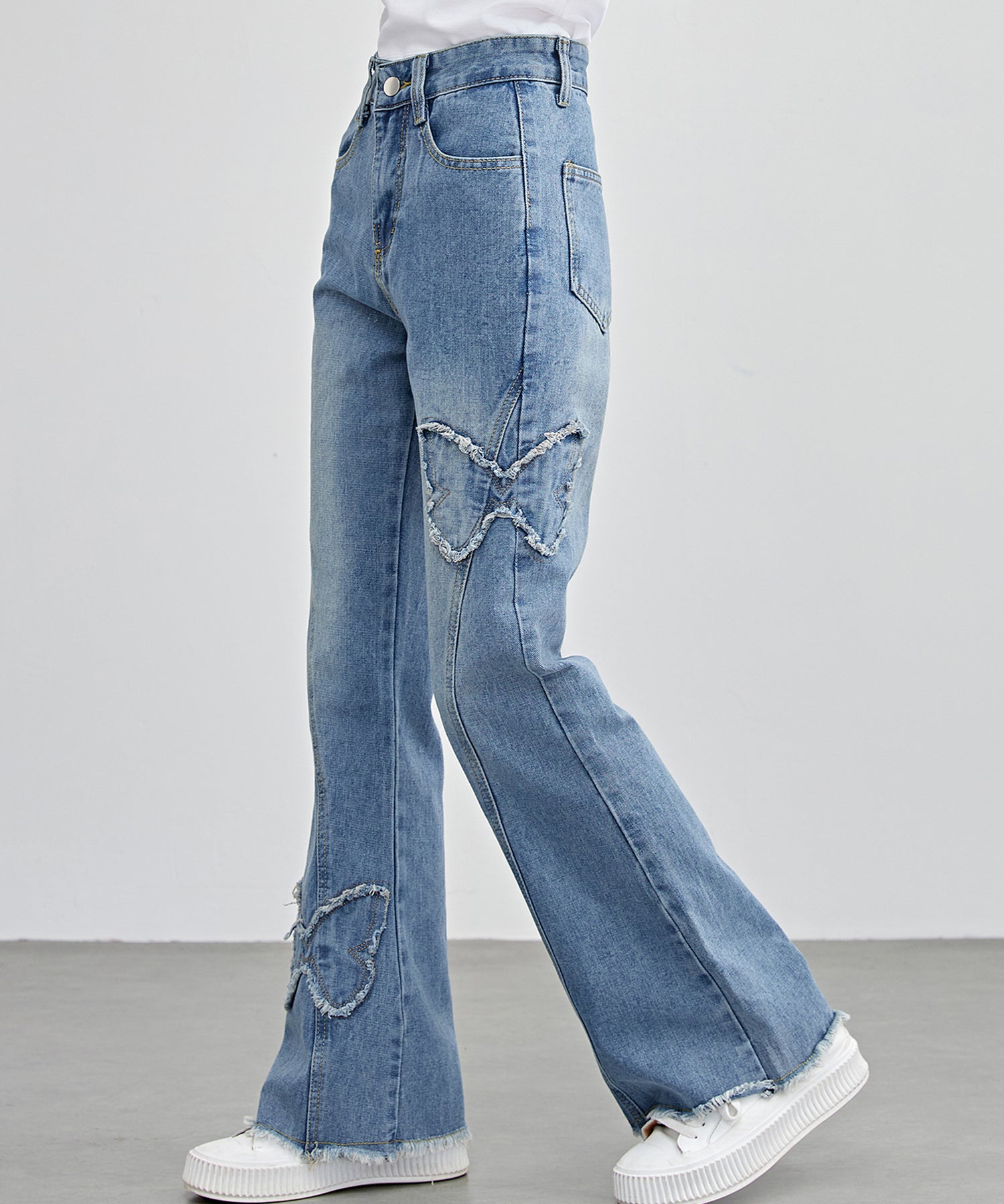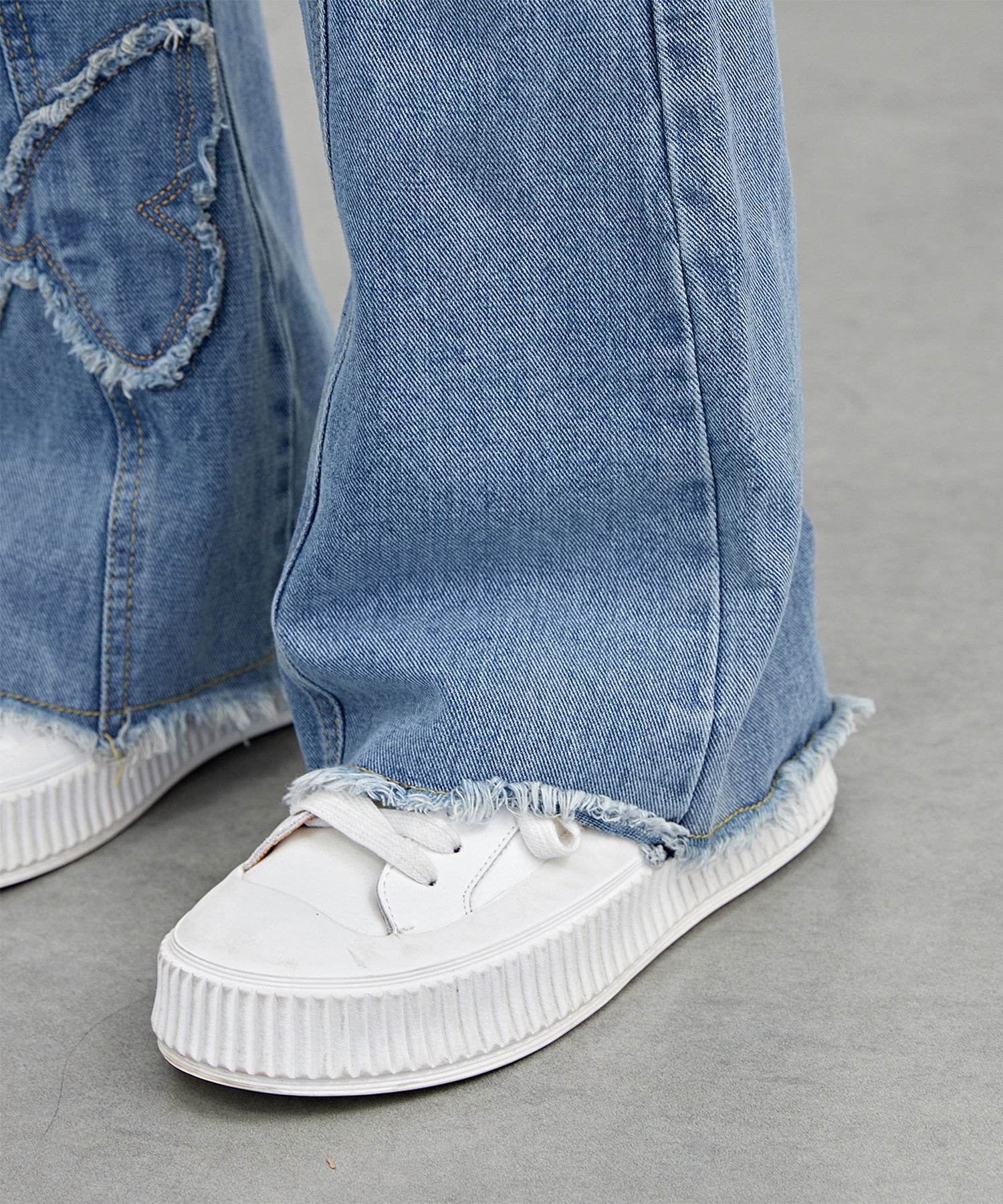 バタフライ フリンジ 刺繍 フレア デニム パンツ