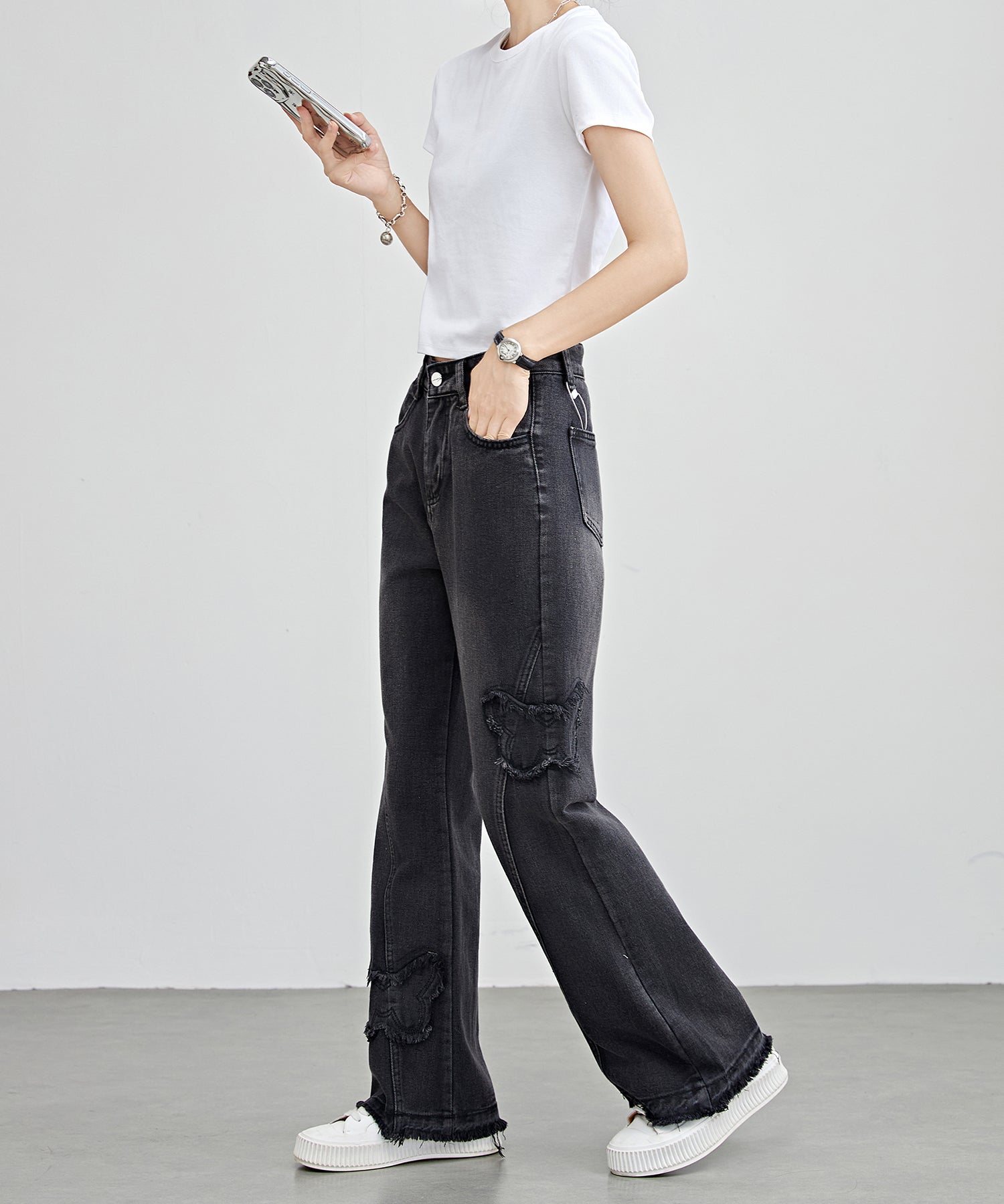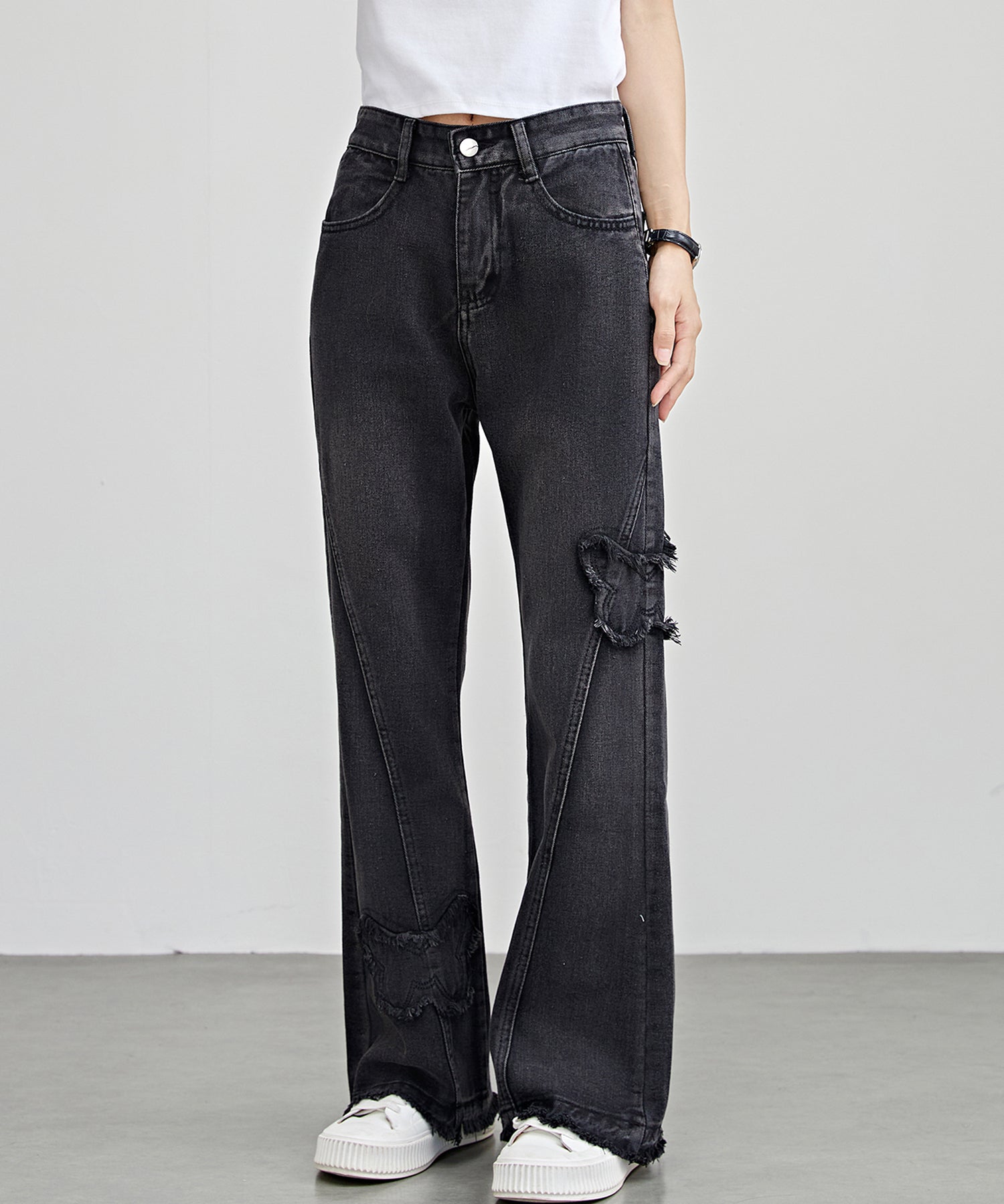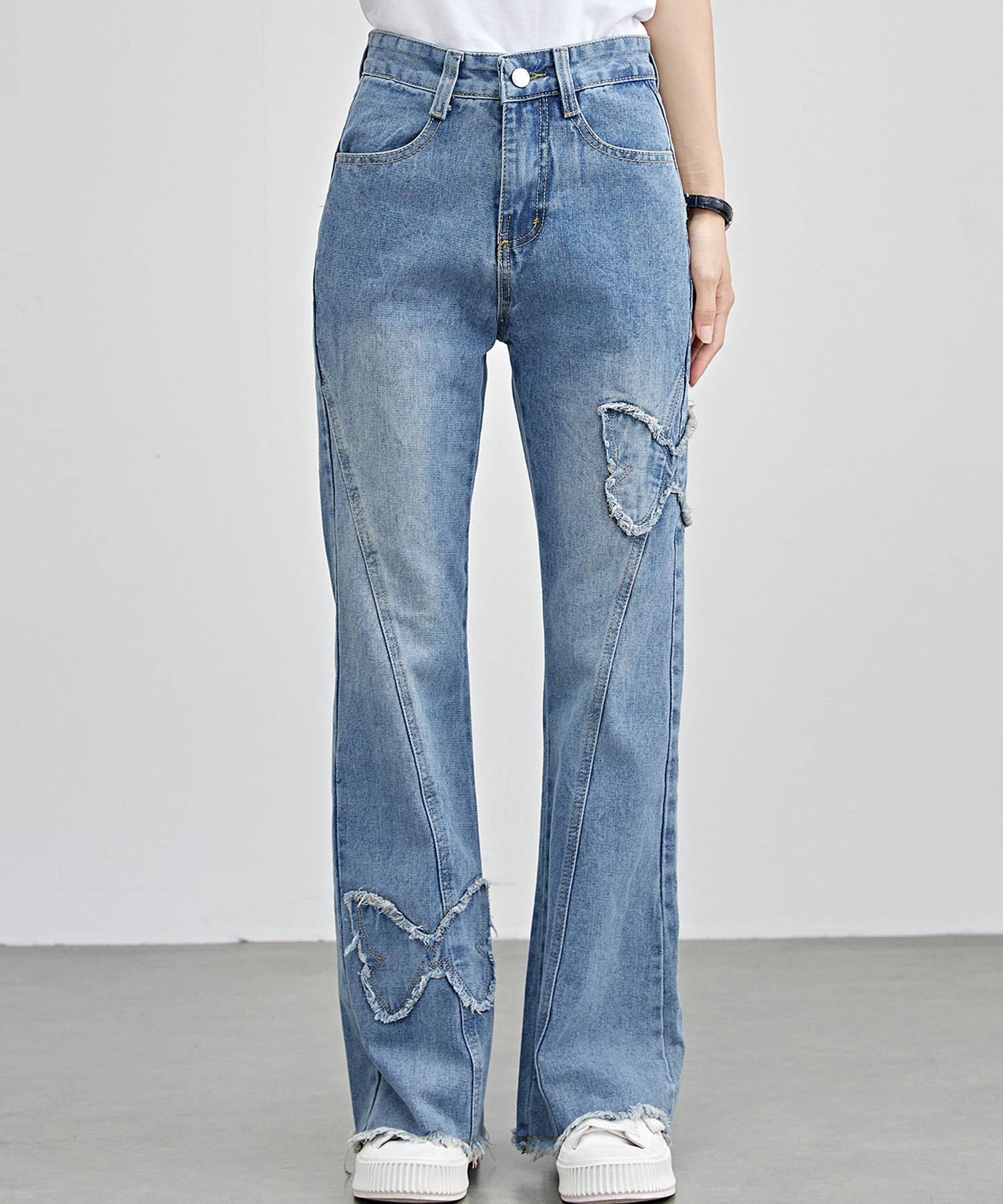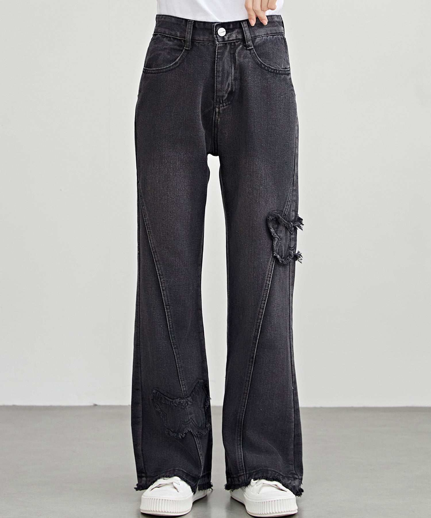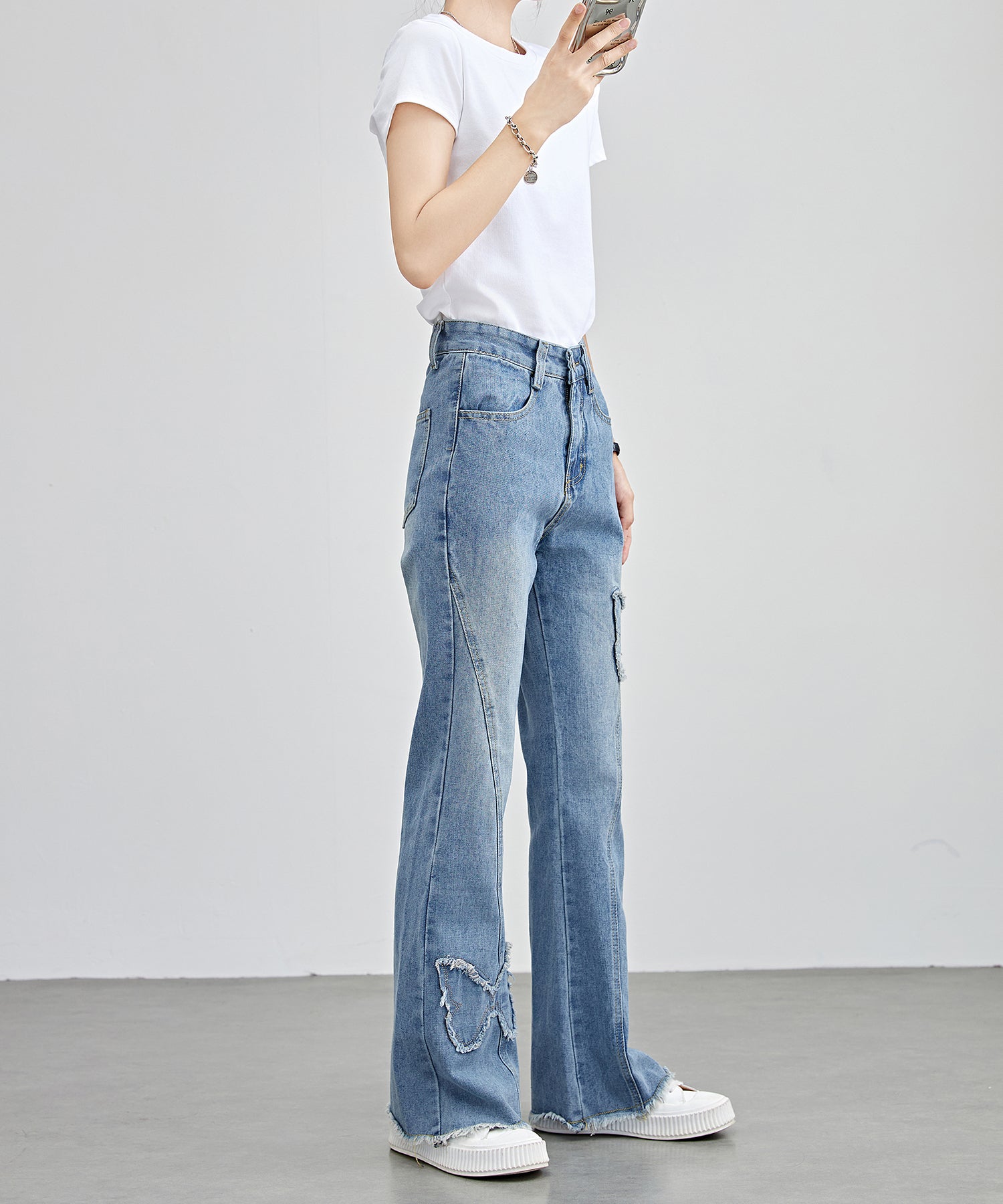 バタフライ フリンジ 刺繍 フレア デニム パンツ