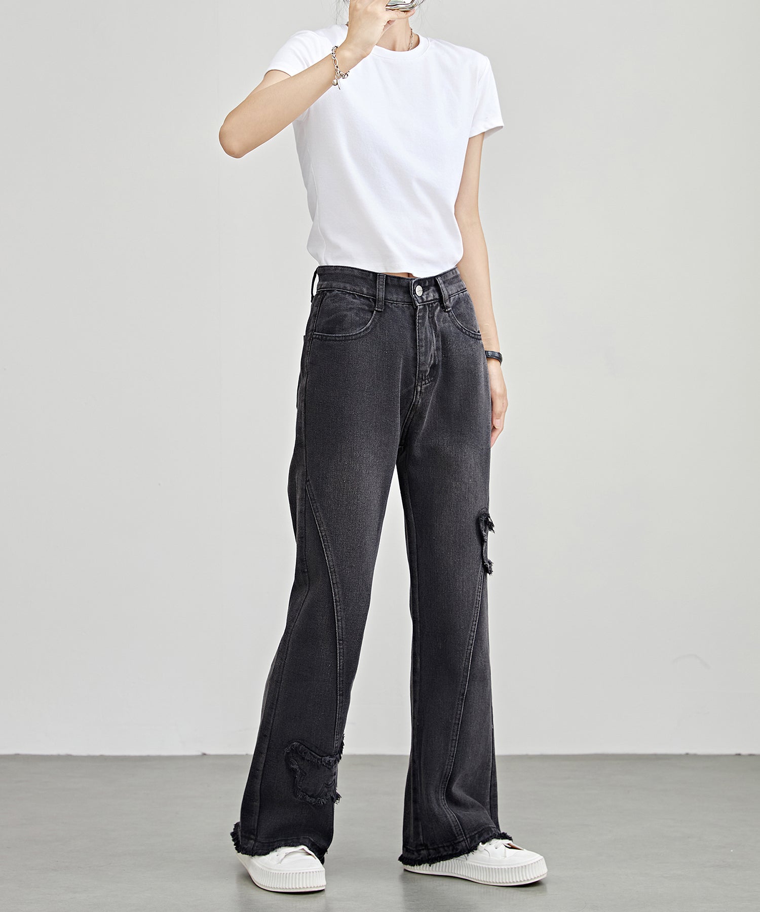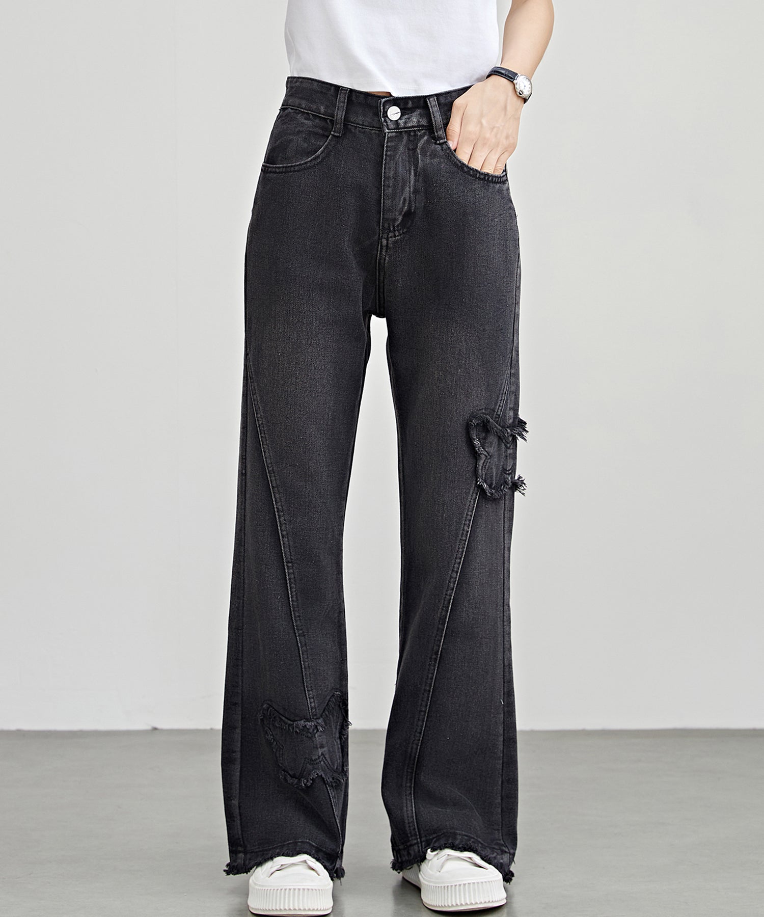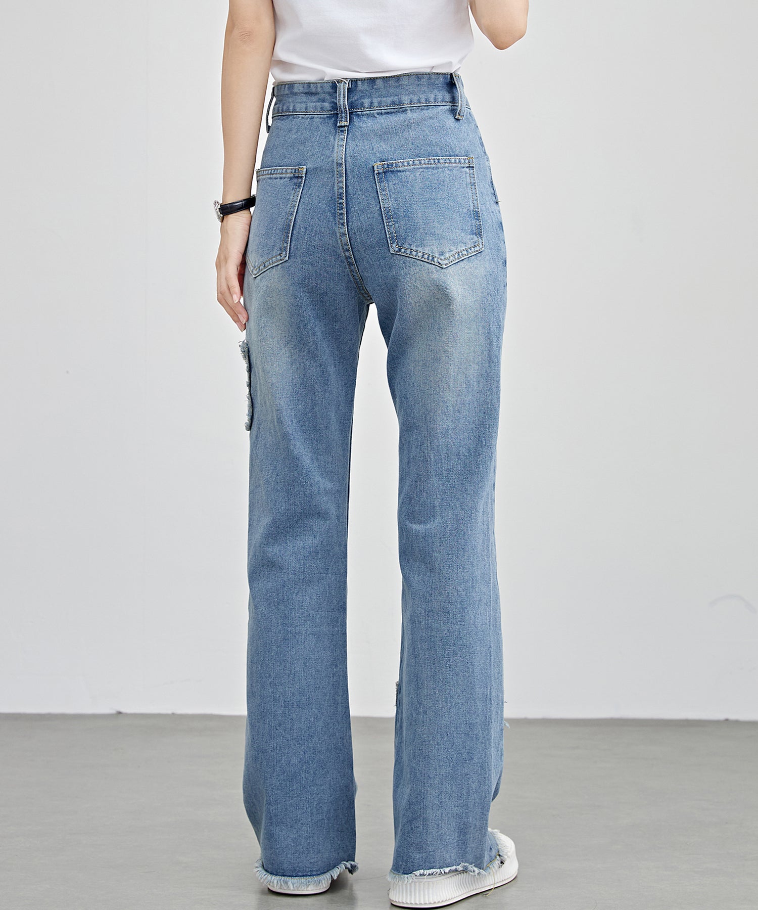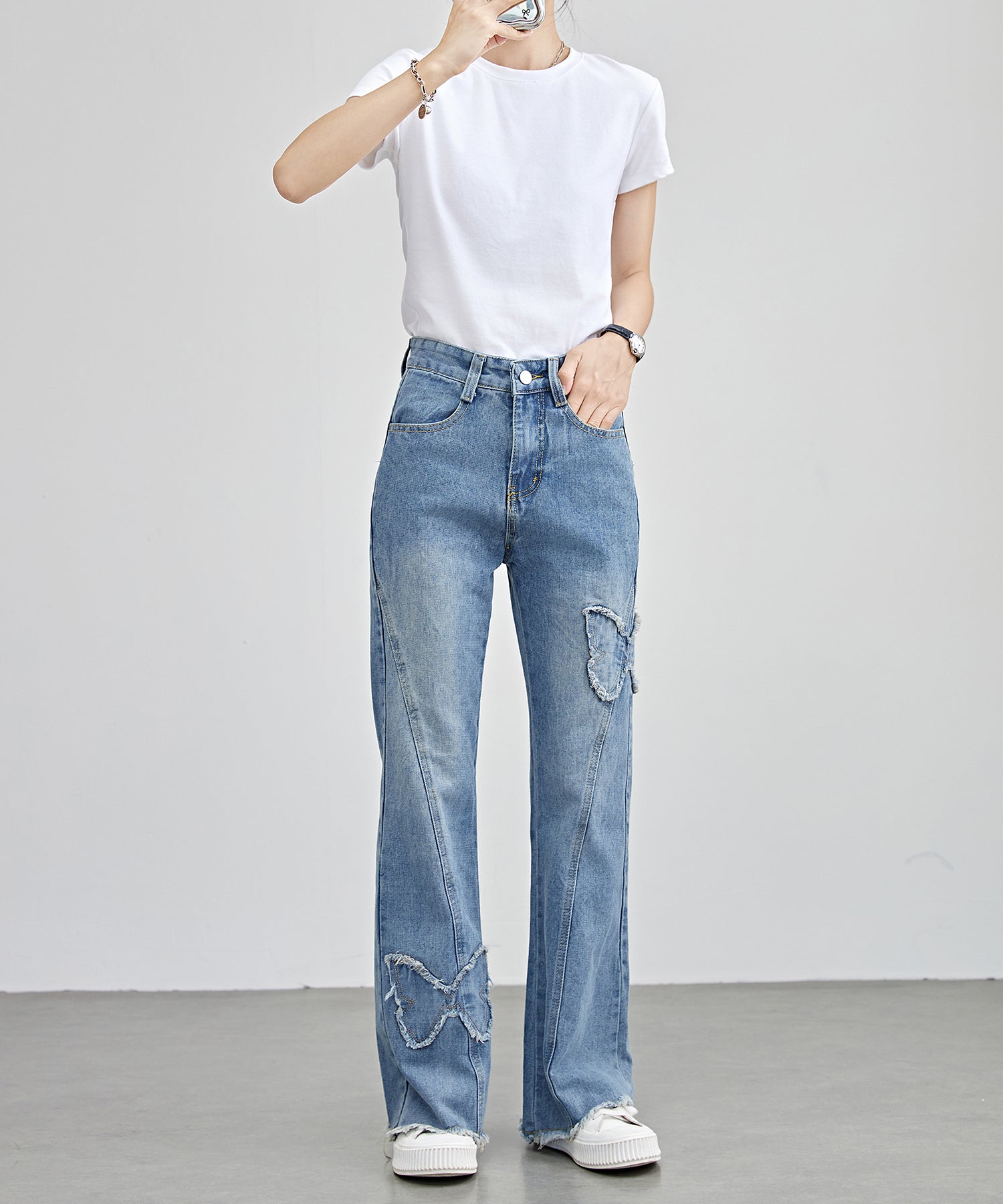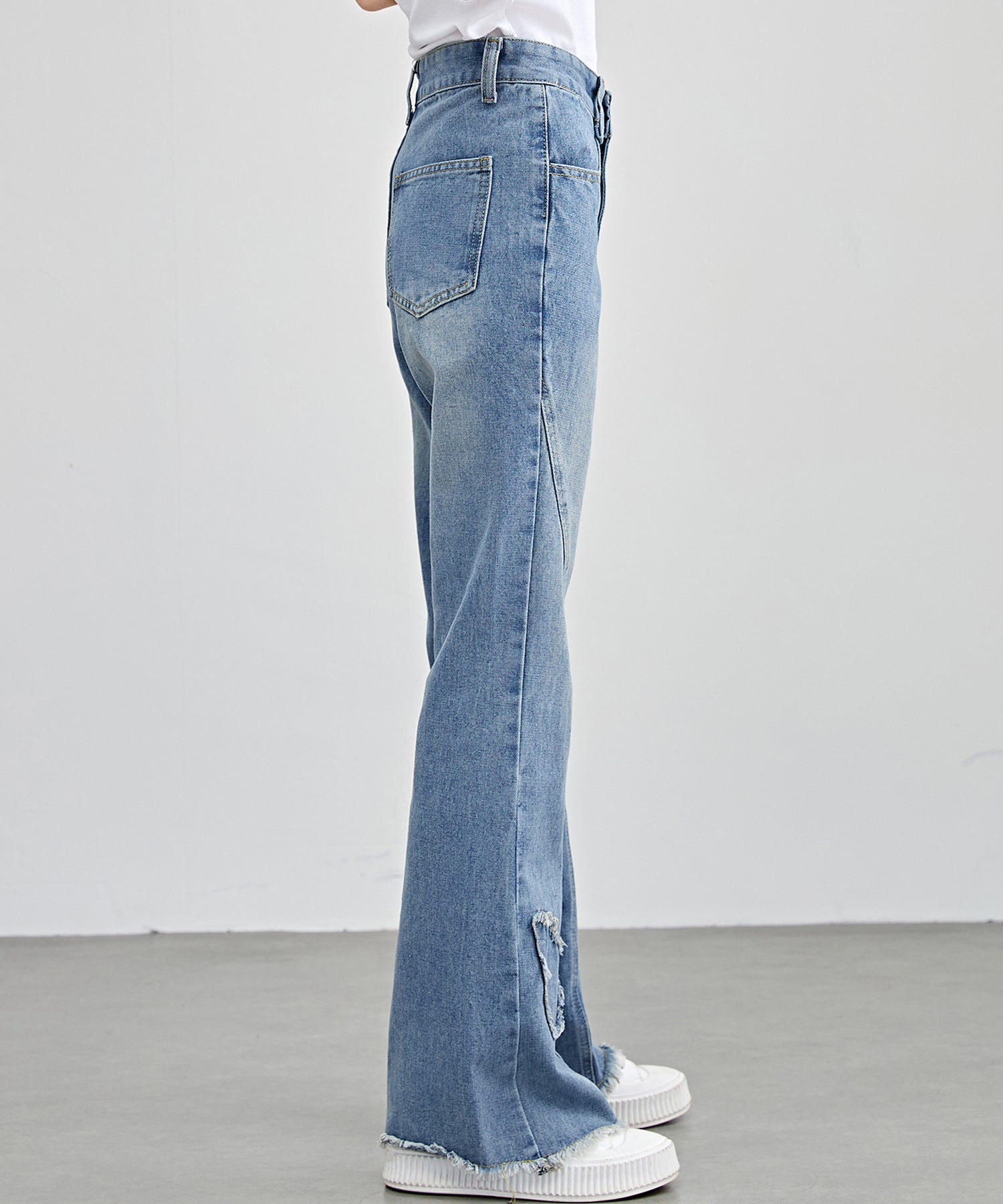バタフライ フリンジ 刺繍 フレア デニム パンツ