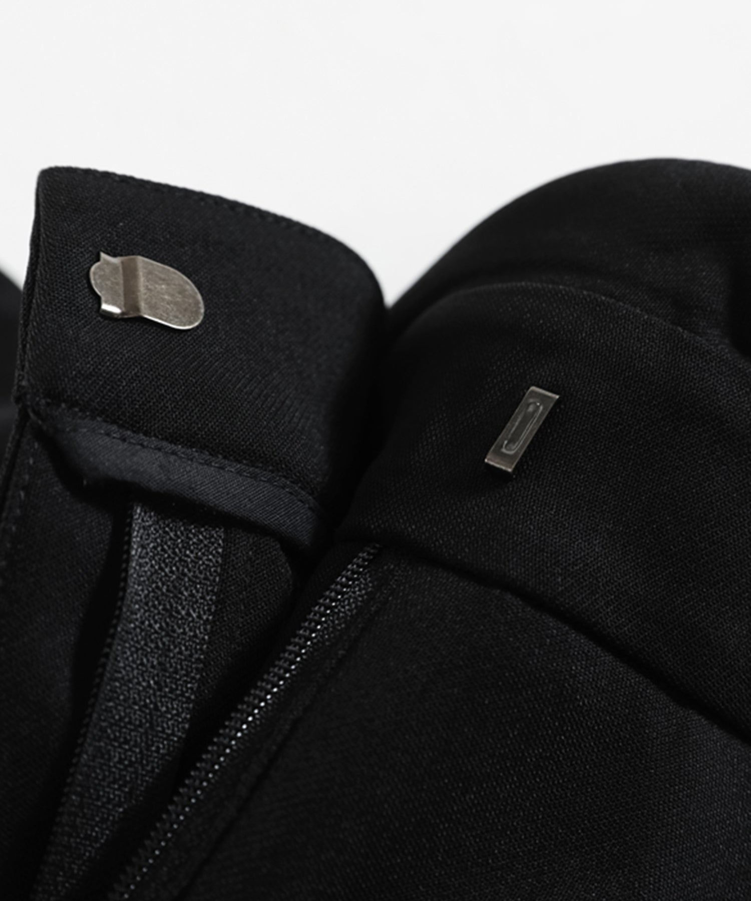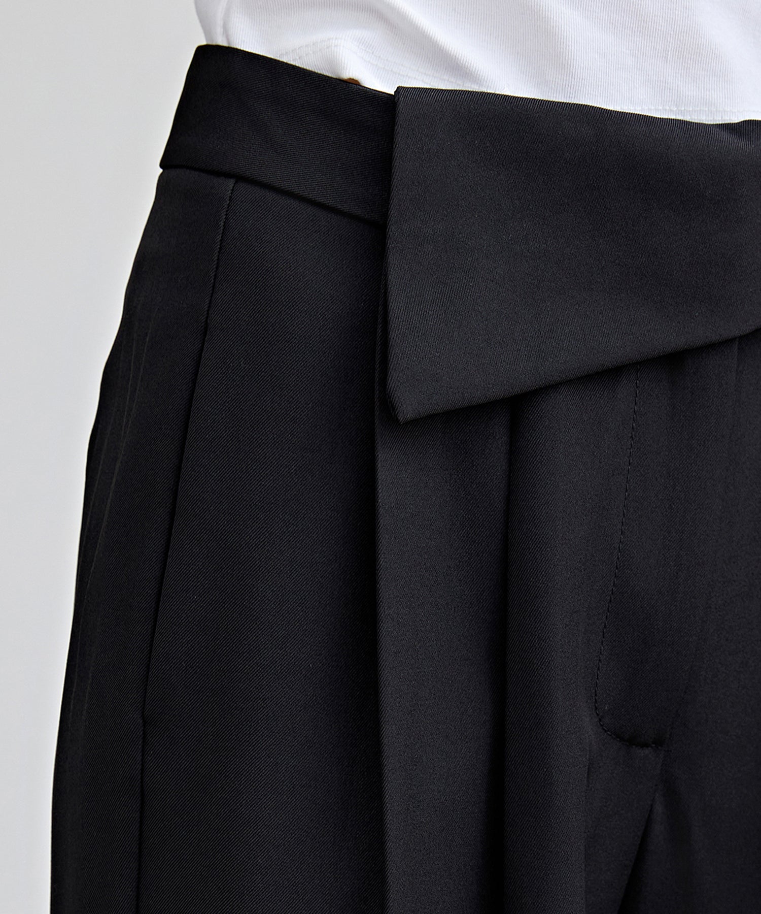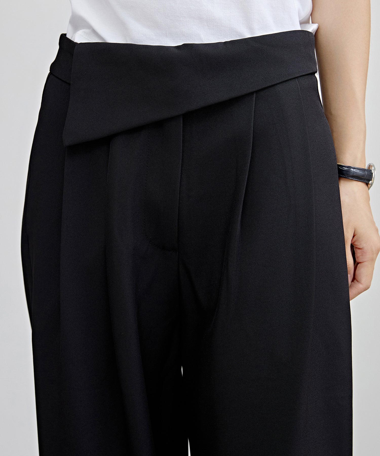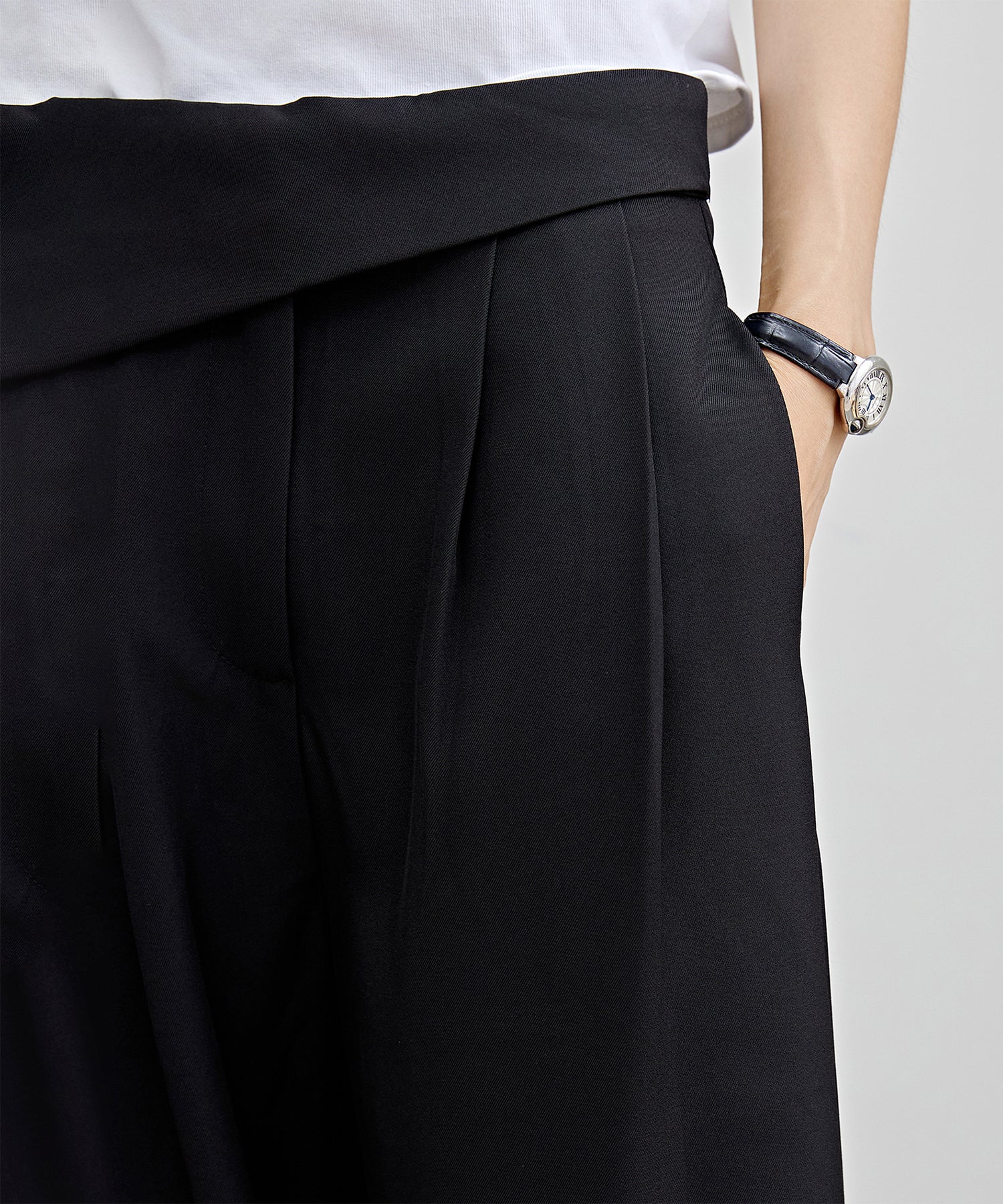 折り返しをつけたような個性的なウエストデザインが、腰まわりをほっそりと見せてくれるので、スタイルアップ効果は抜群◎