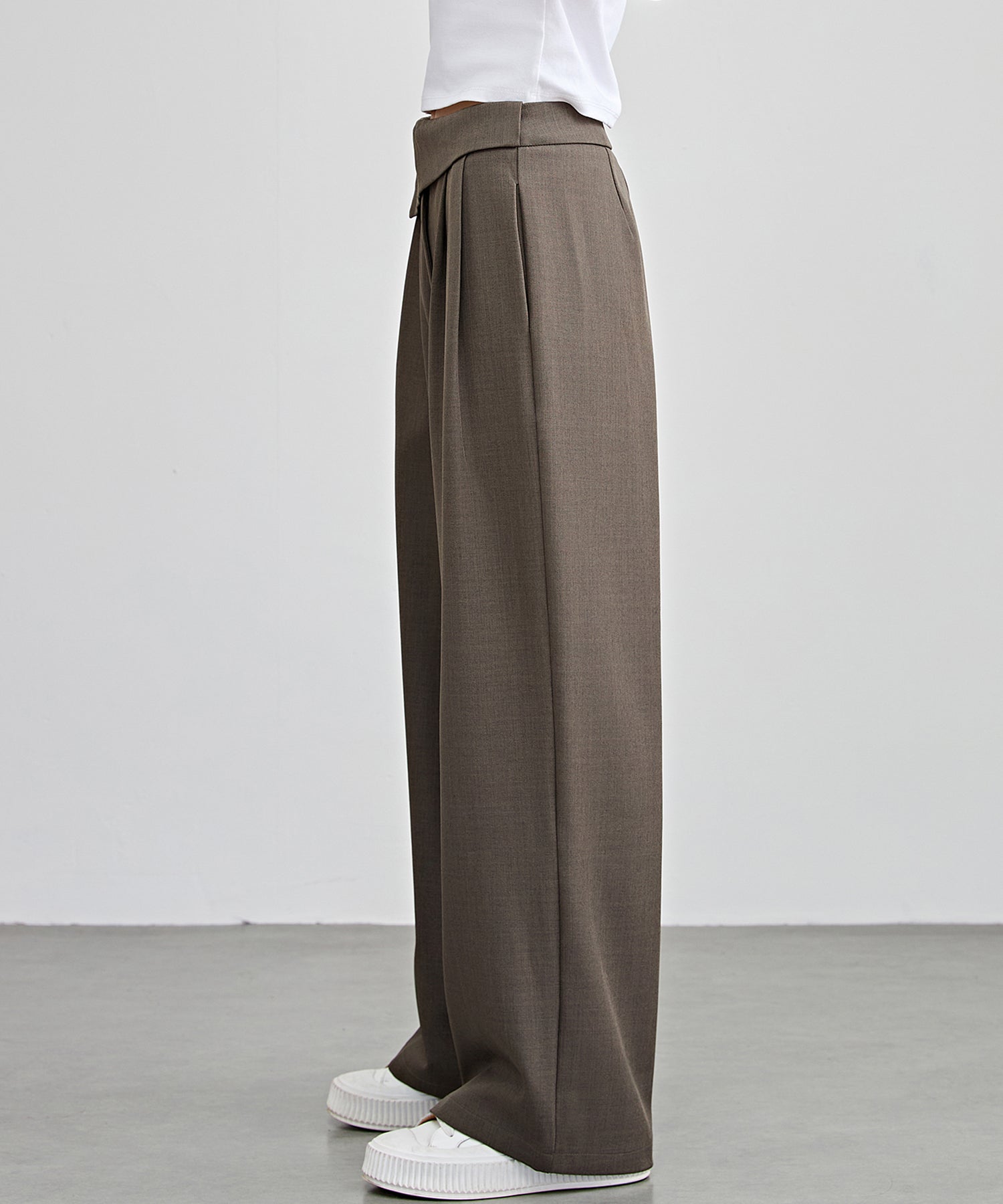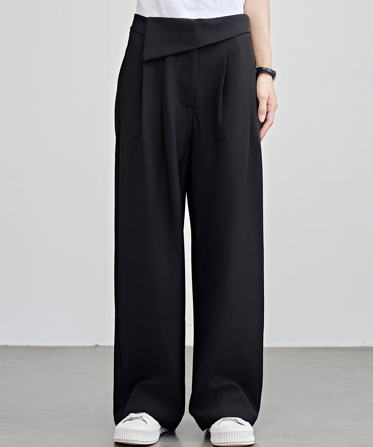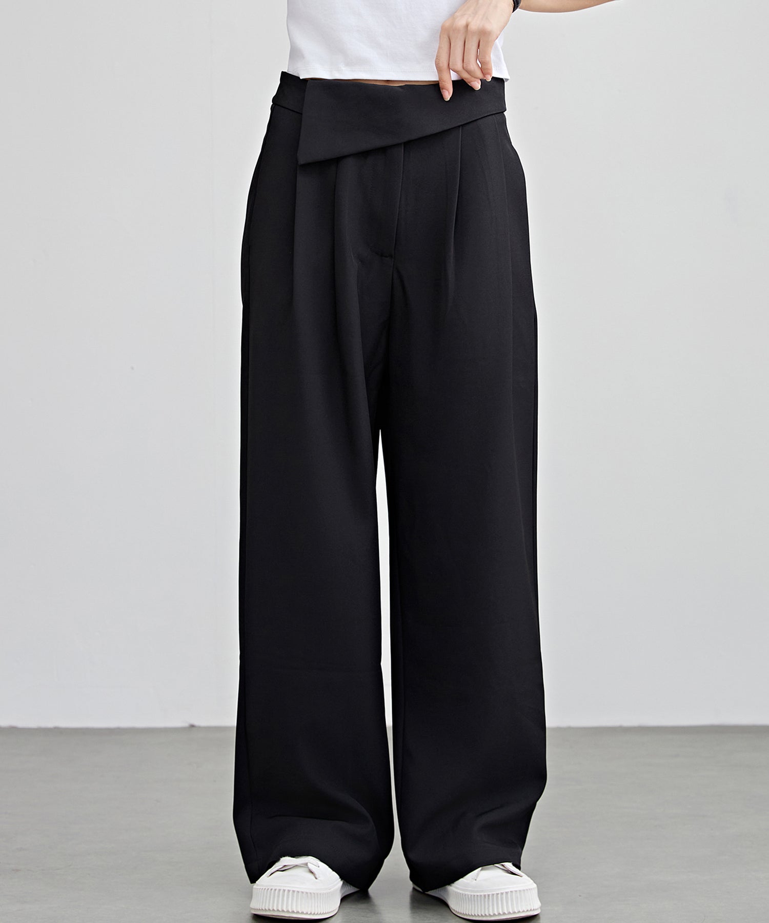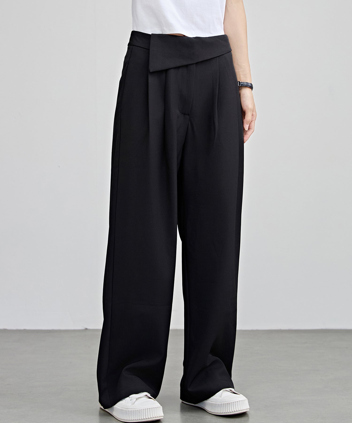 折り返しをつけたような個性的なウエストデザインが、腰まわりをほっそりと見せてくれるので、スタイルアップ効果は抜群◎