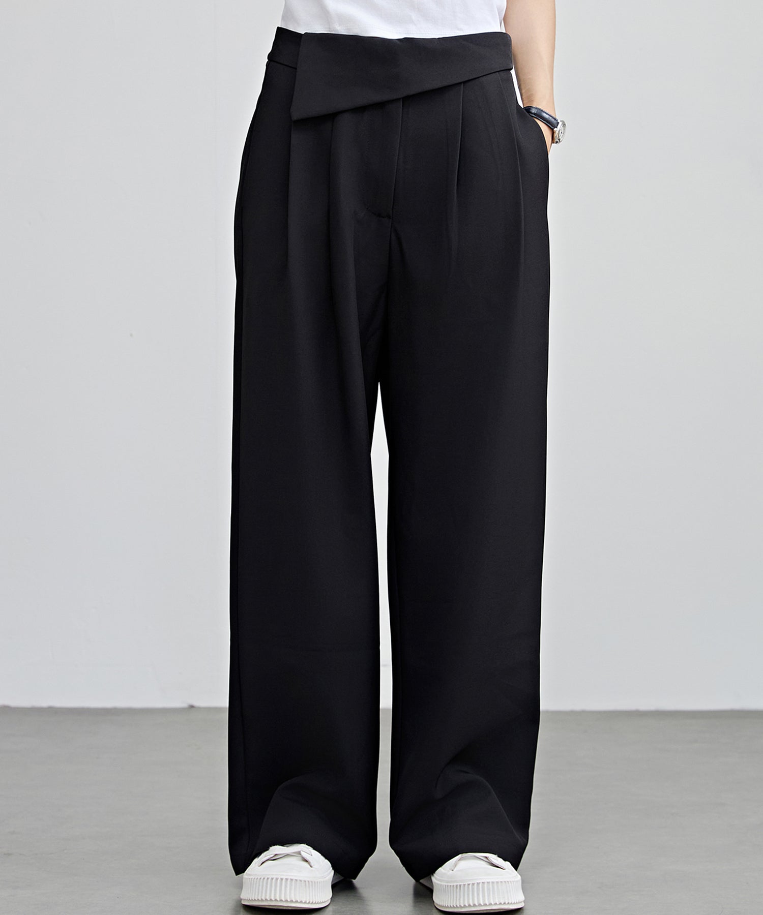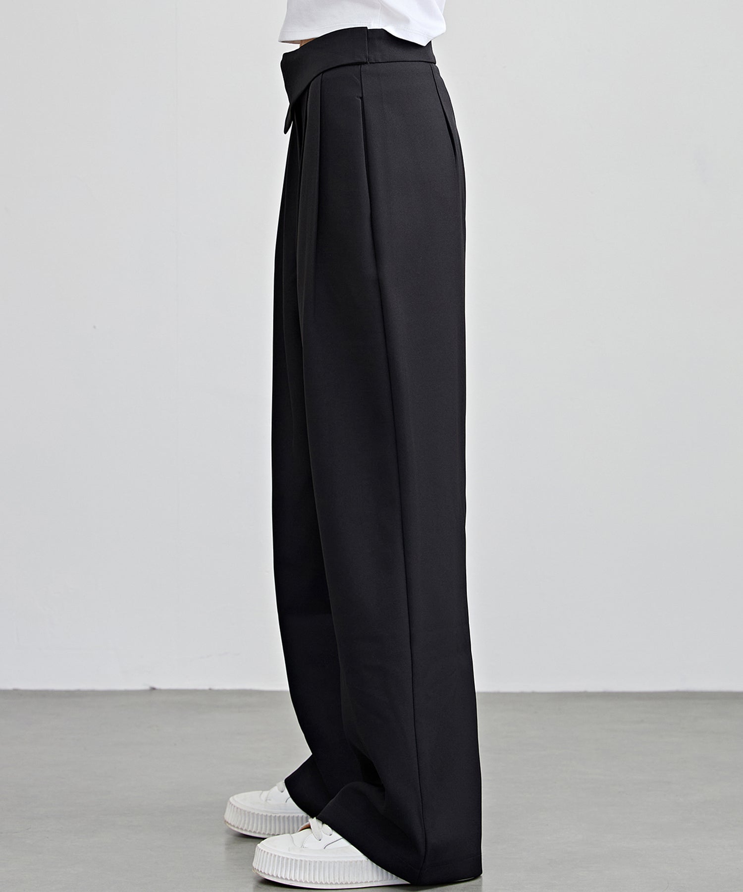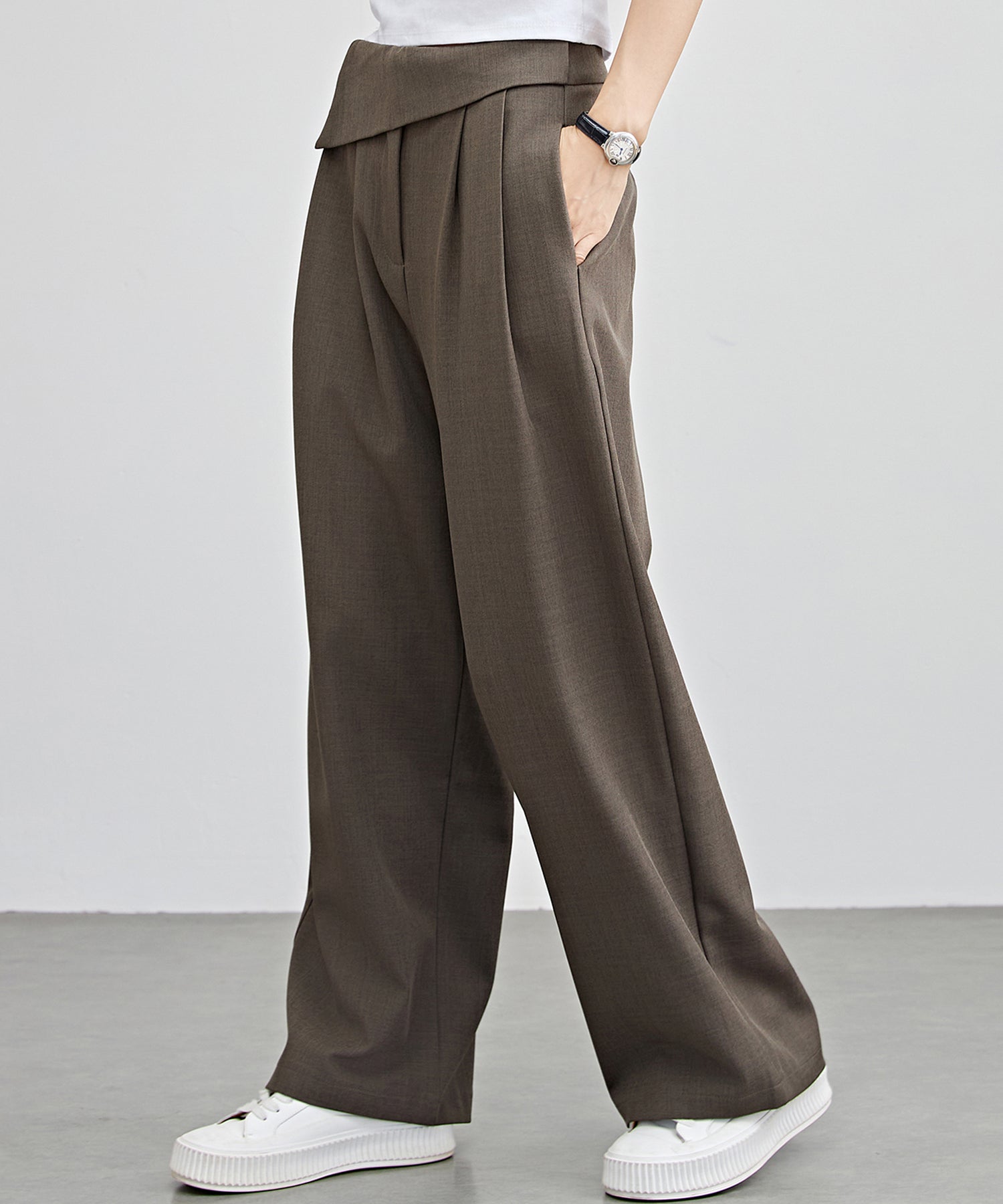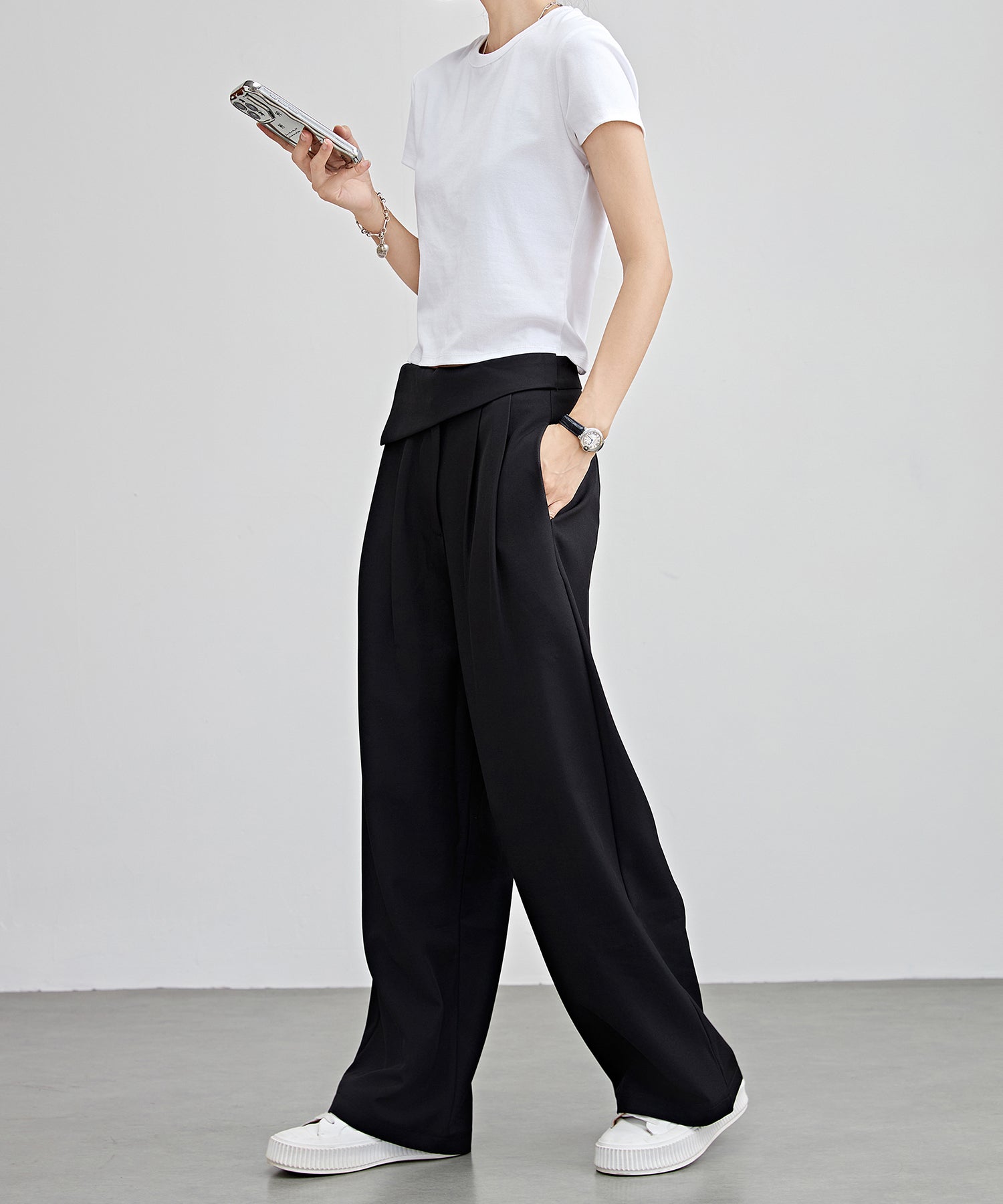折り返しをつけたような個性的なウエストデザインが、腰まわりをほっそりと見せてくれるので、スタイルアップ効果は抜群◎