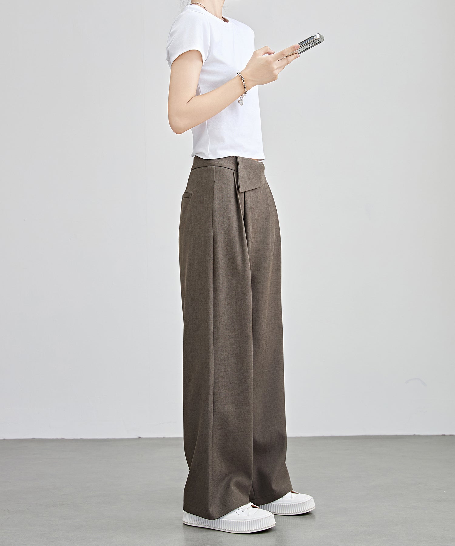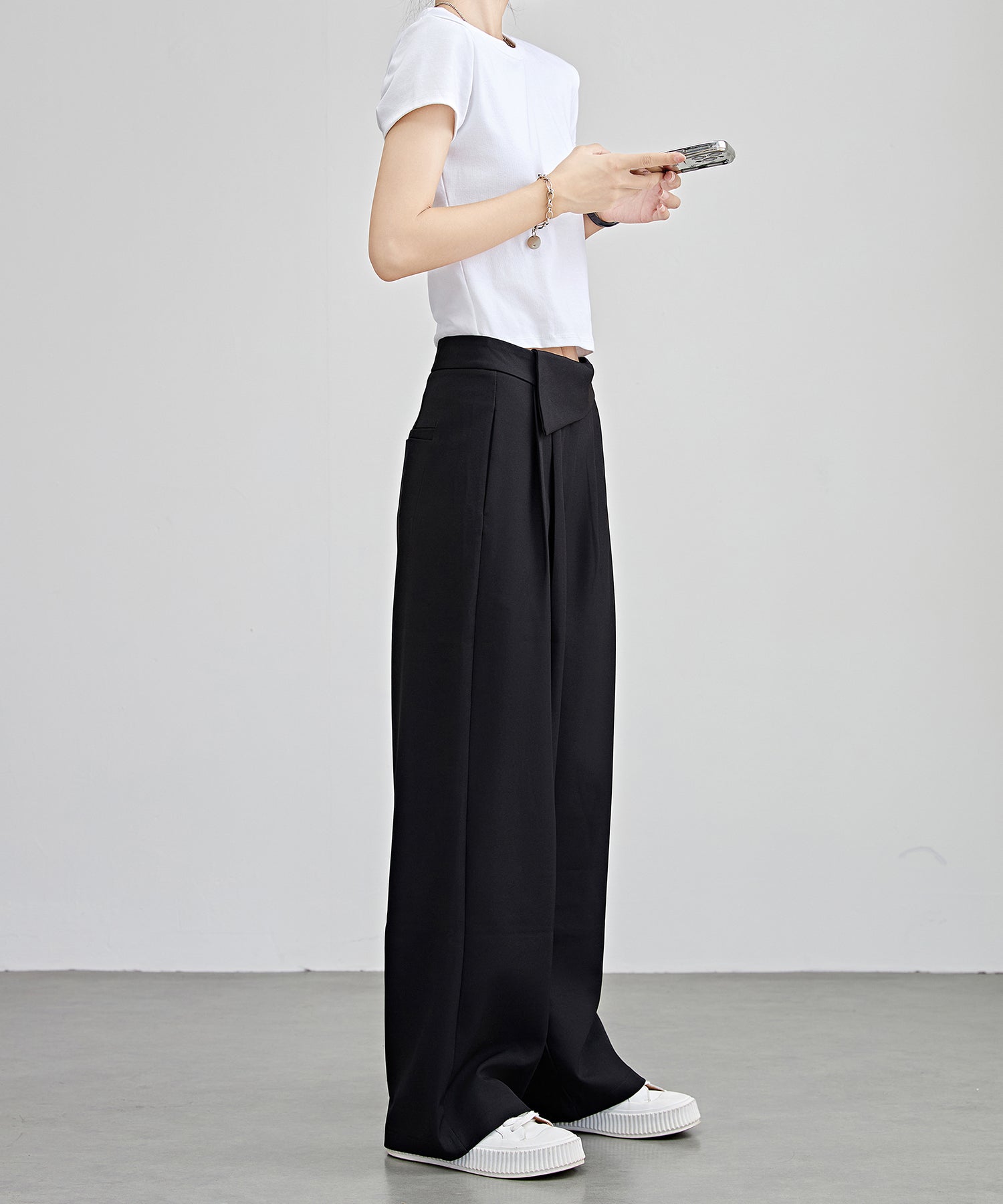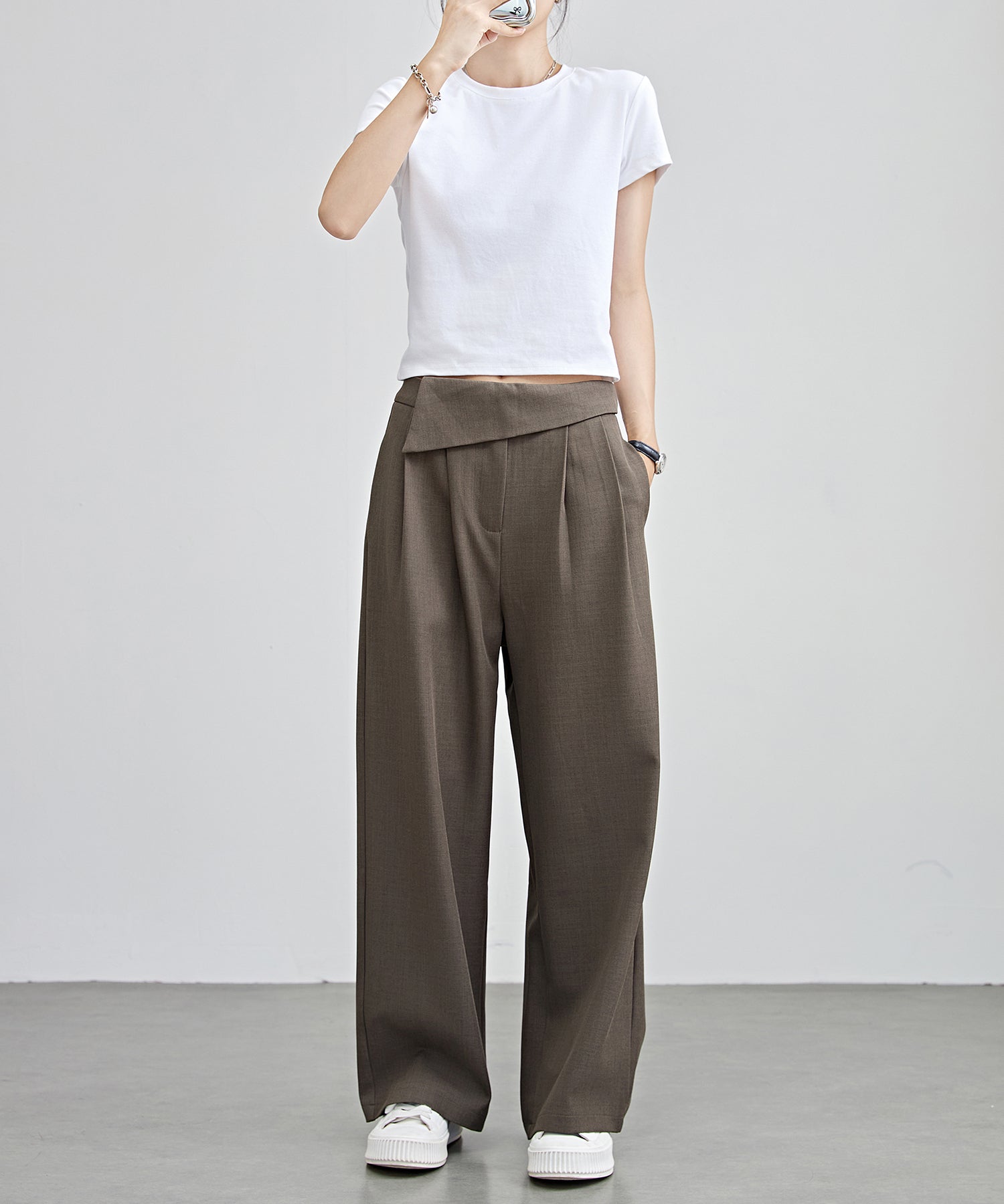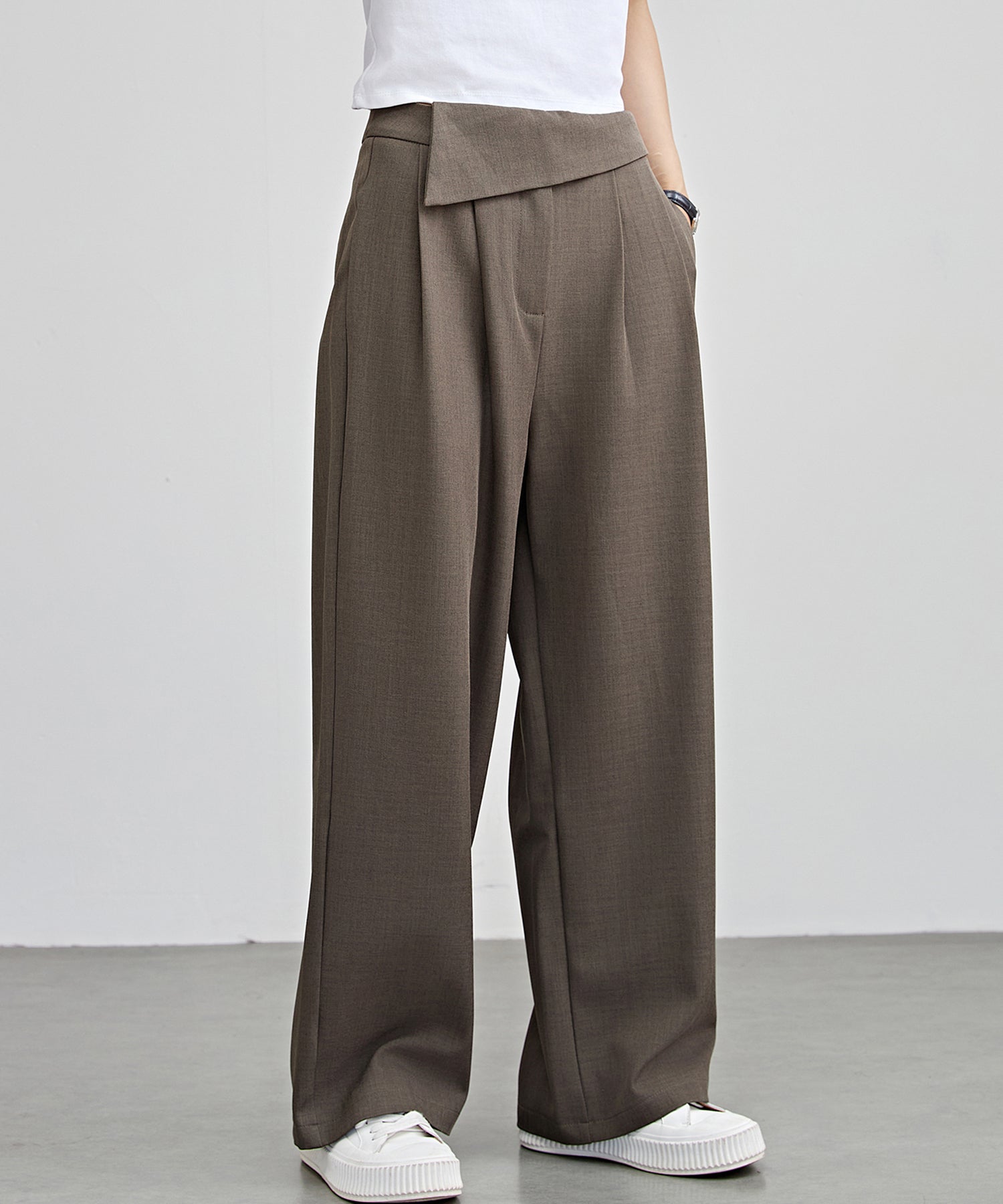 折り返しをつけたような個性的なウエストデザインが、腰まわりをほっそりと見せてくれるので、スタイルアップ効果は抜群◎