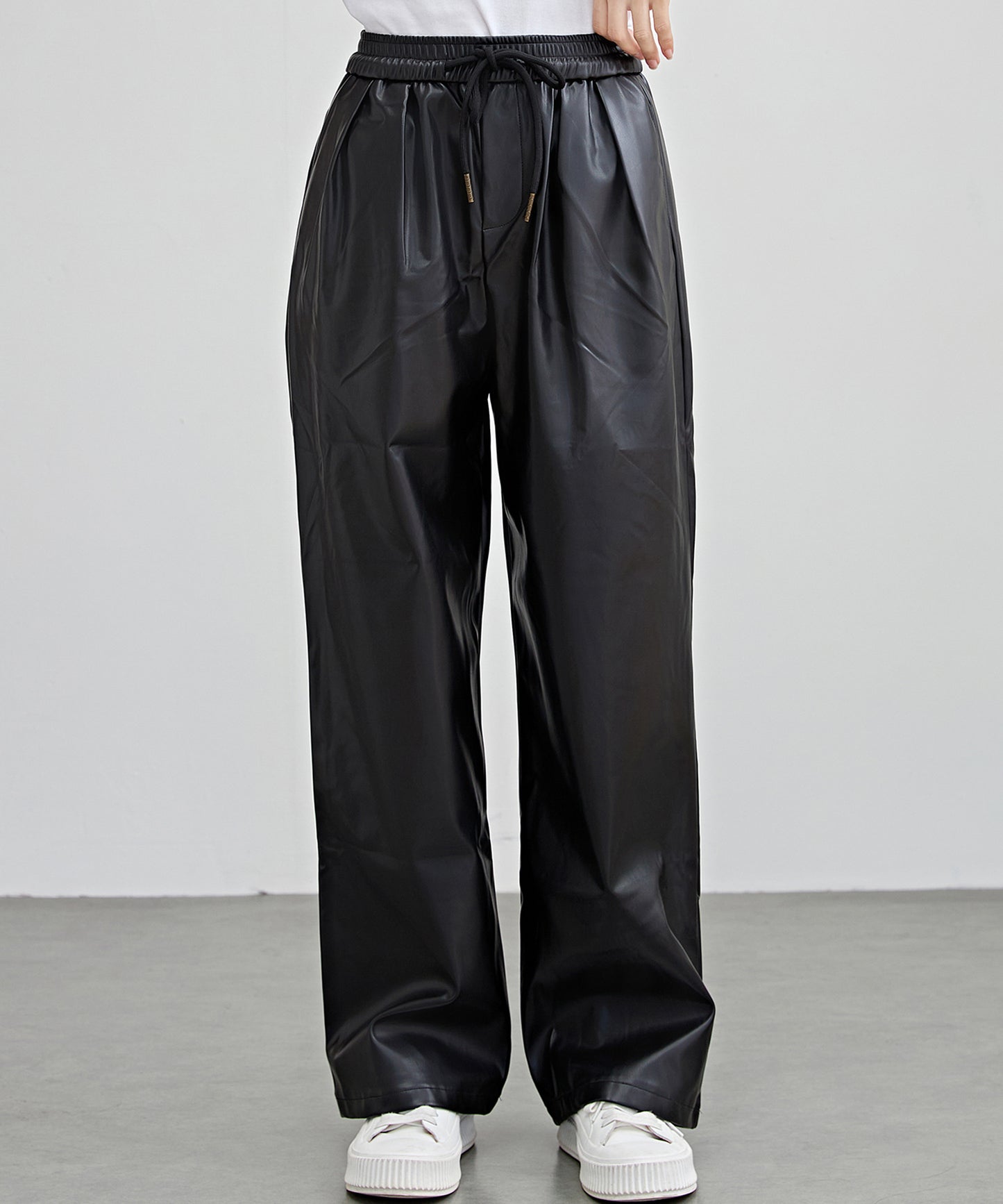 ソリッドカラー 合成皮革 ハイウエスト イージー ワイド パンツ