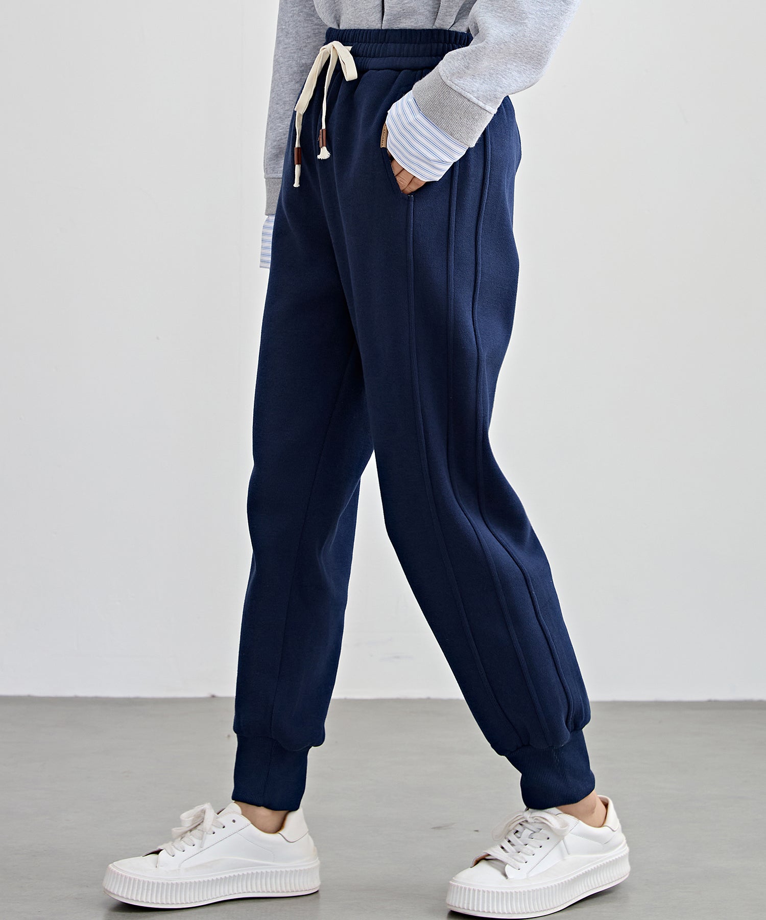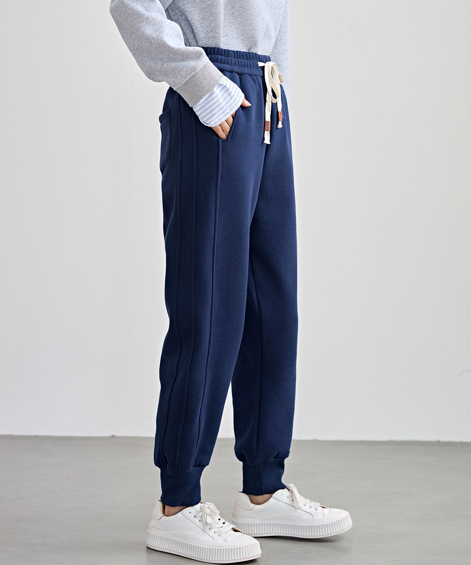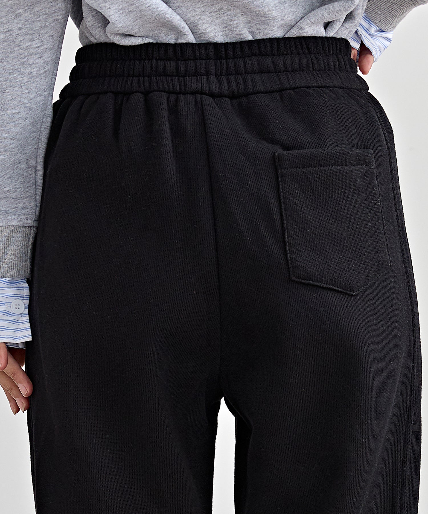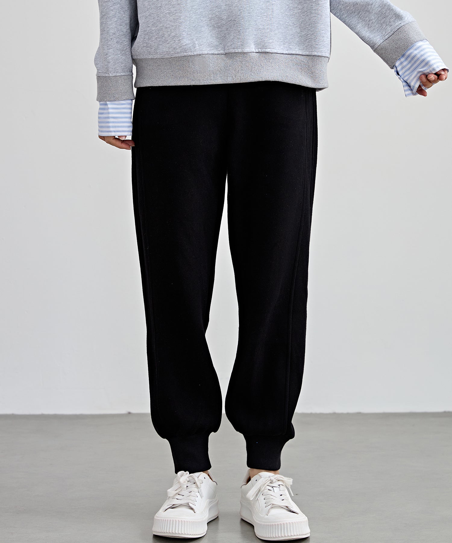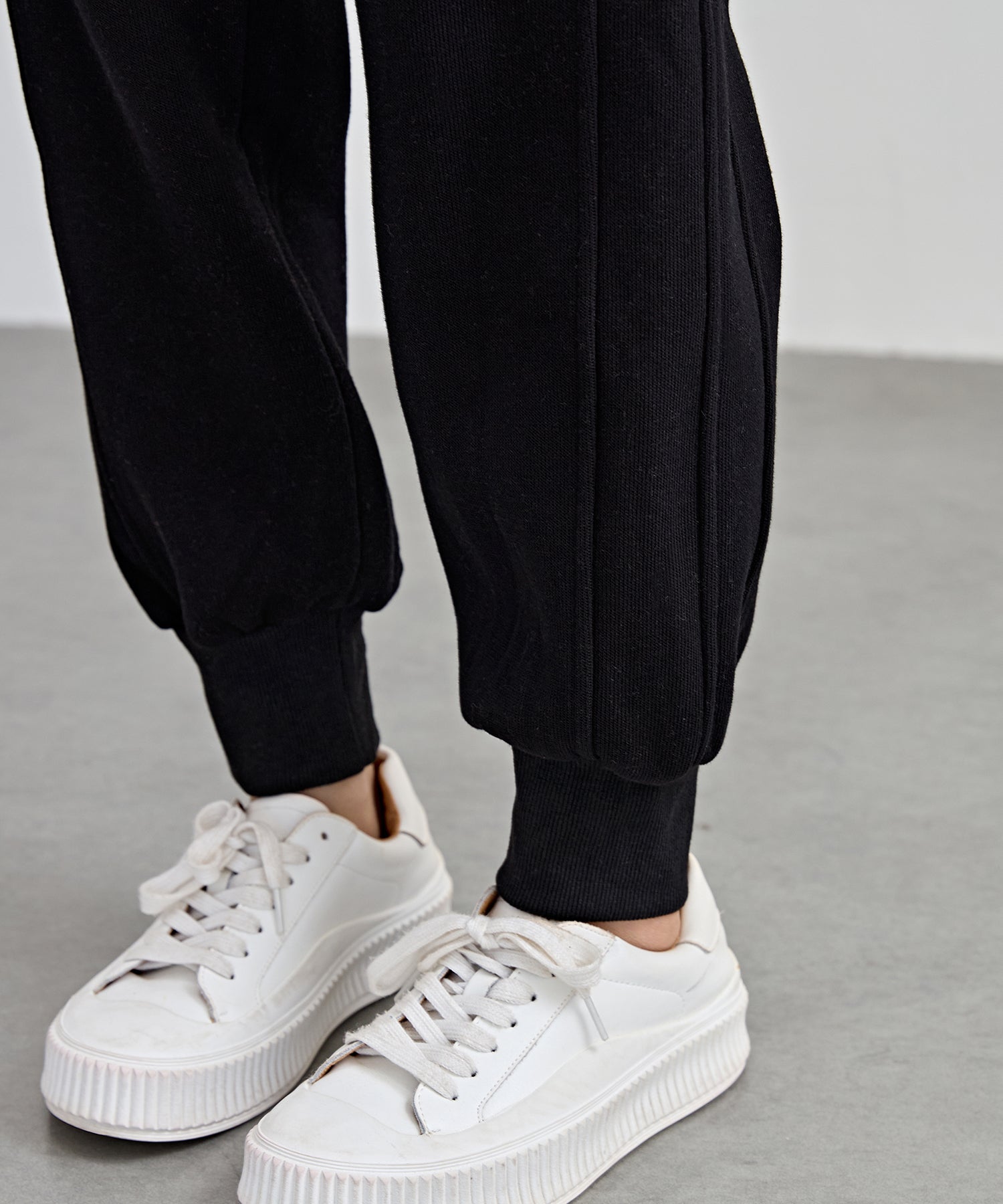 テーパードシルエットに裾リブで、スポーティなルックスにこだわったデザイン。