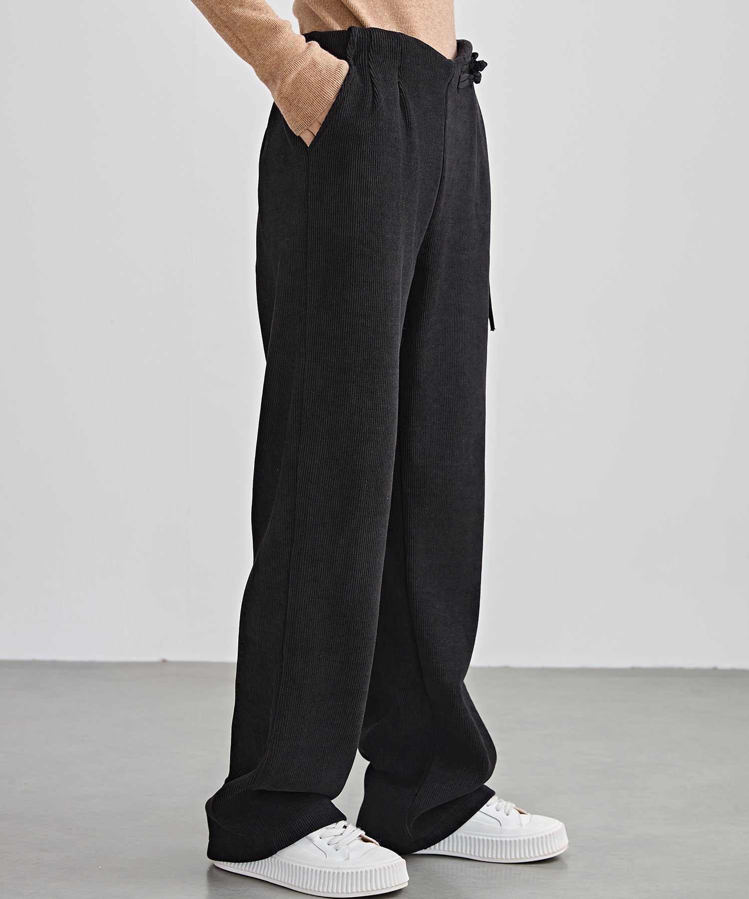 トレンドのクロップドトップスとも相性の良いハイウエスト設計で、脚長効果は抜群◎