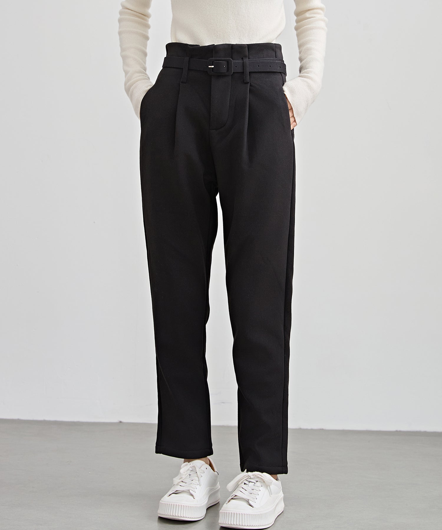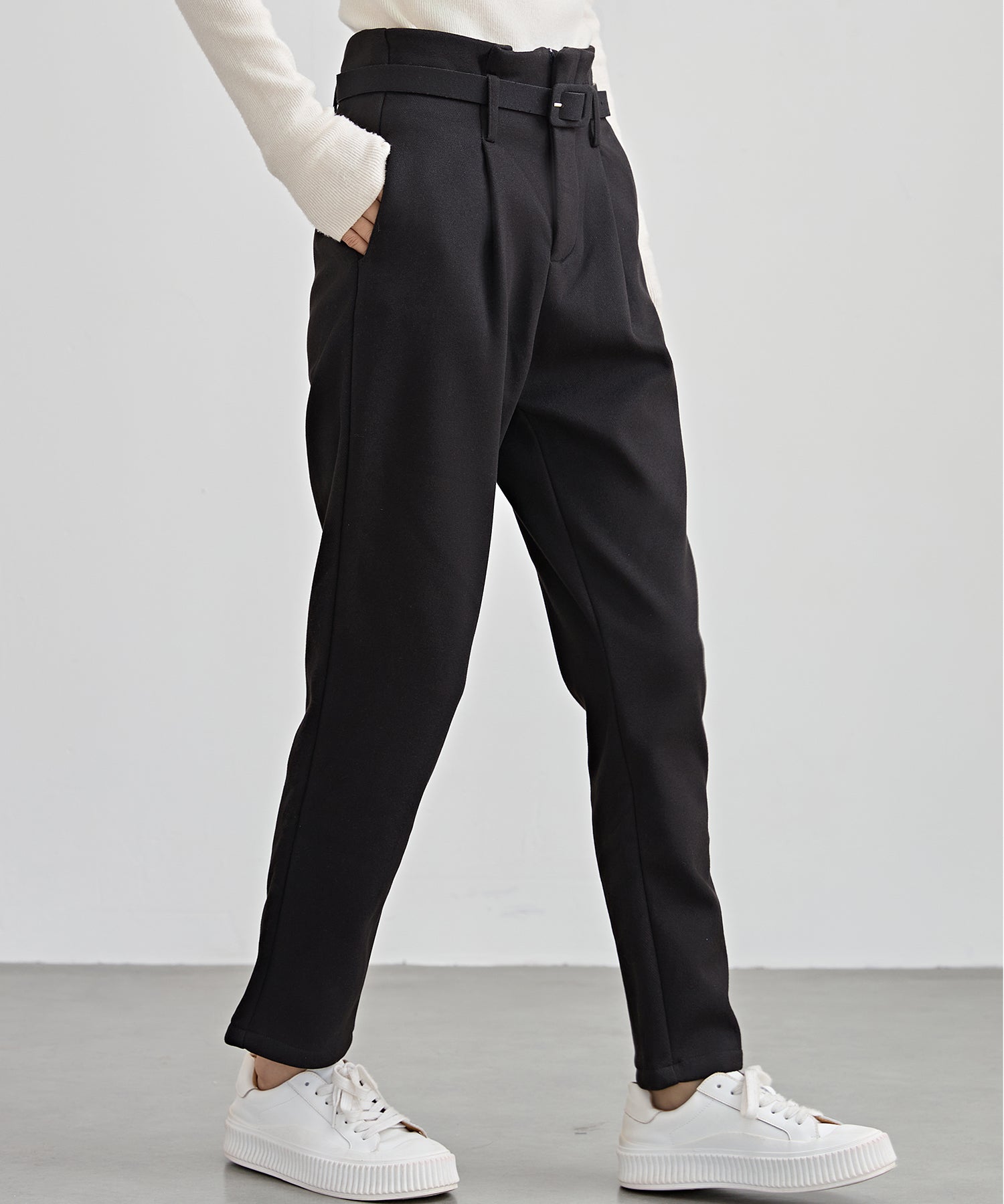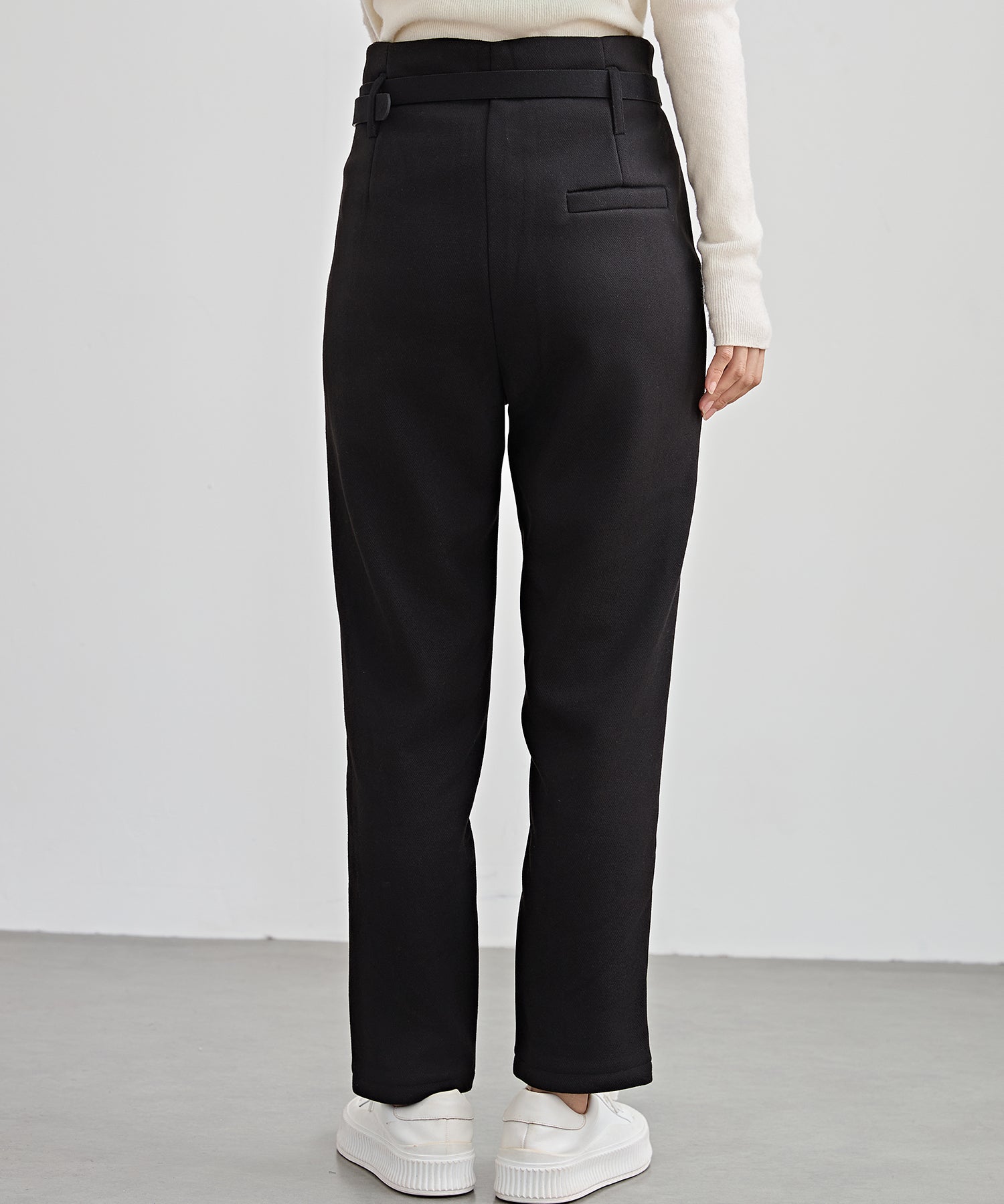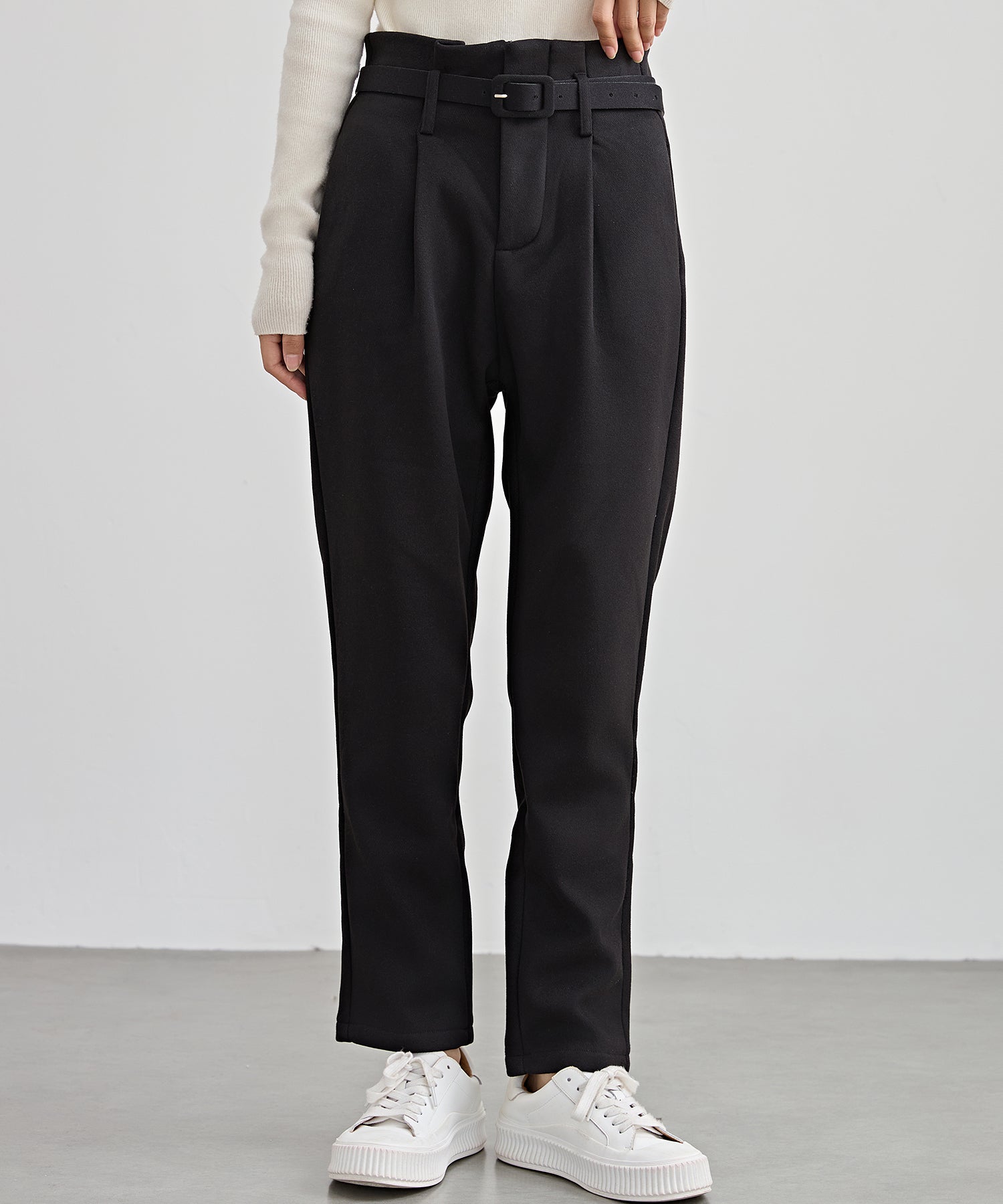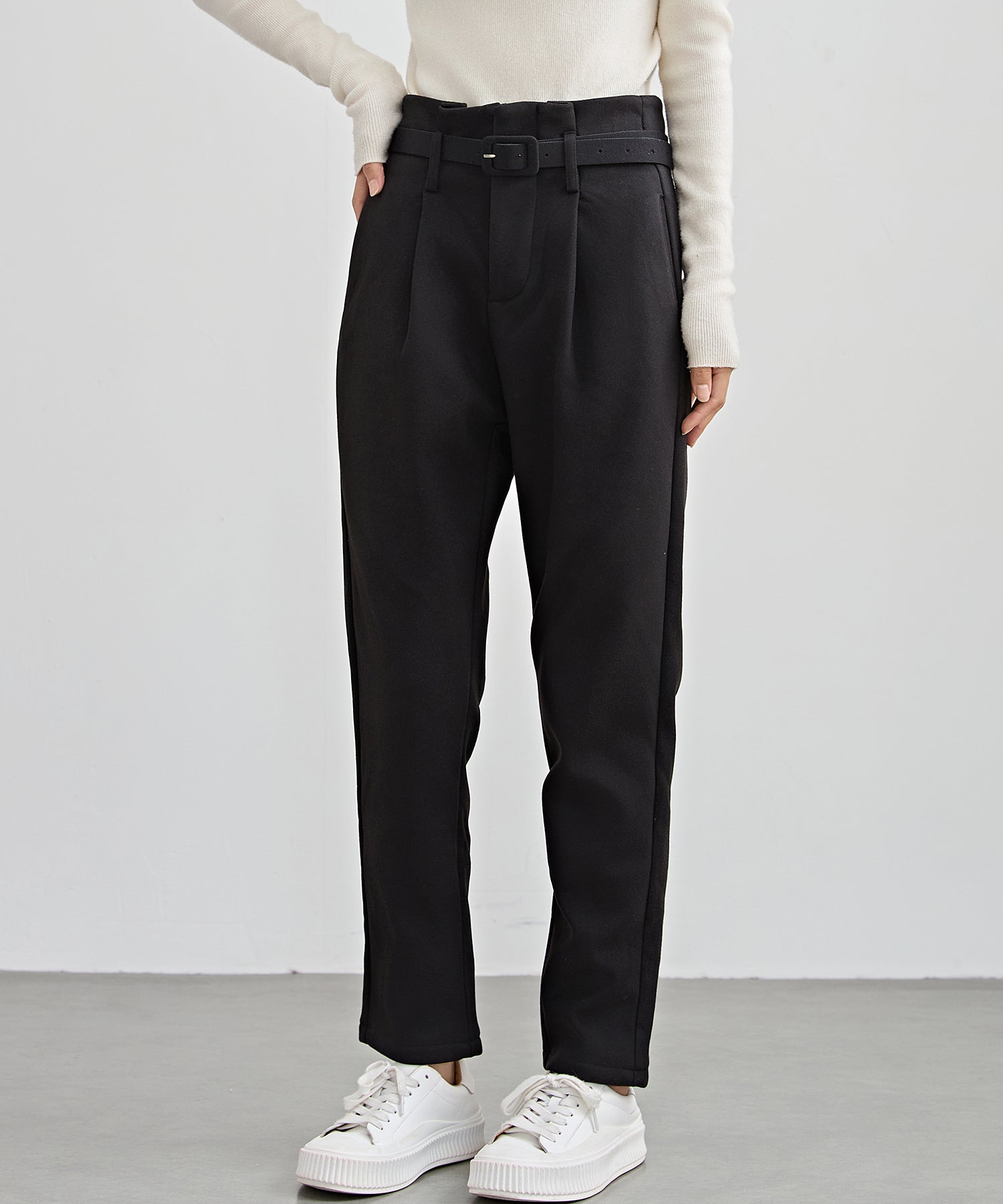 ハイウエスト ベルト付き 裏起毛 テーパード パンツ