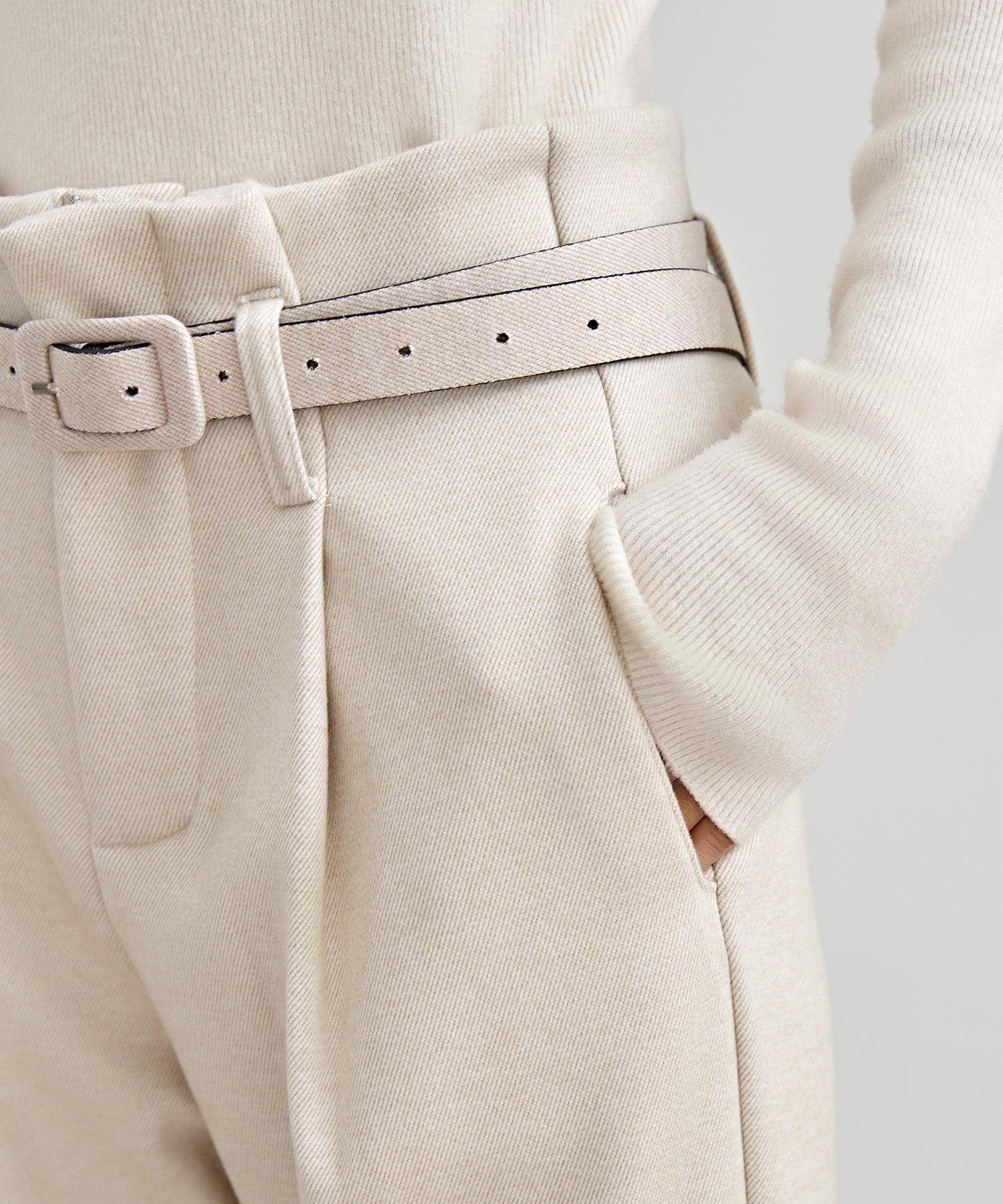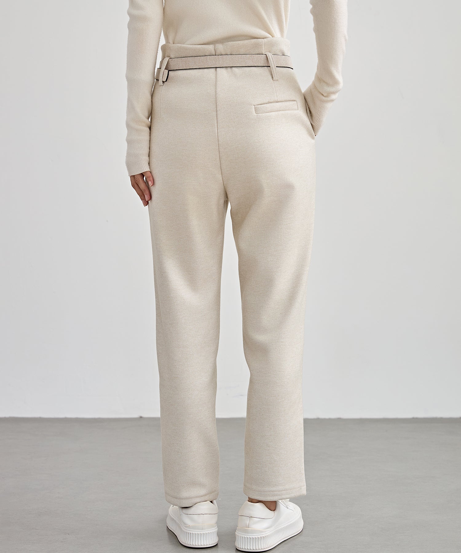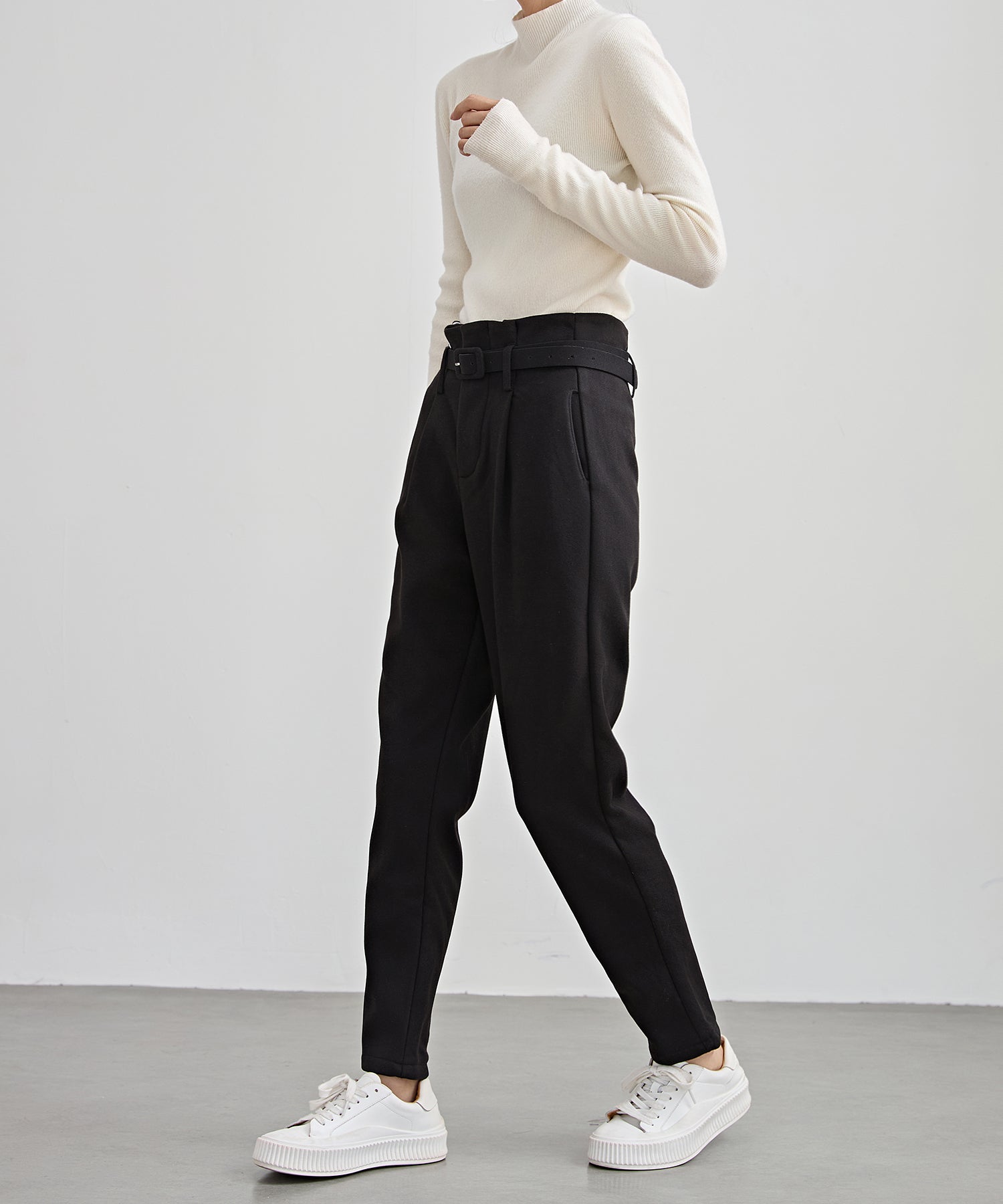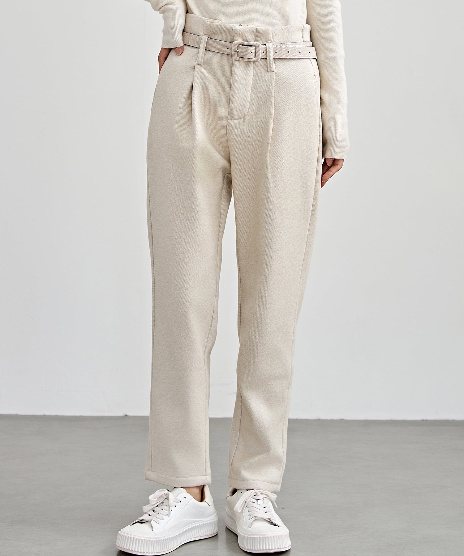 ハイウエスト ベルト付き 裏起毛 テーパード パンツ