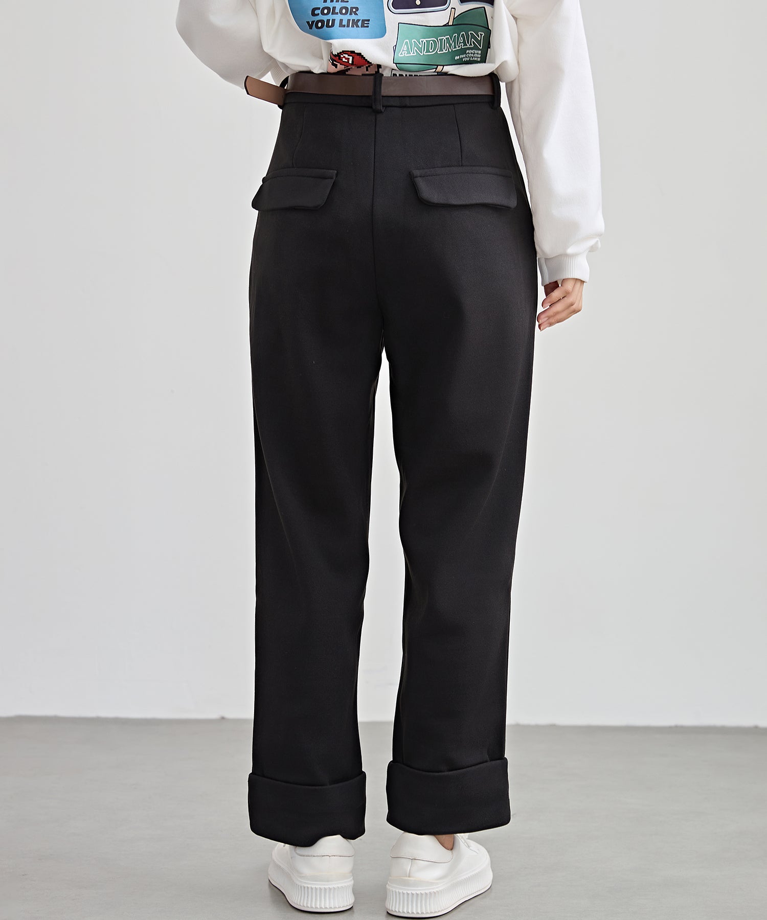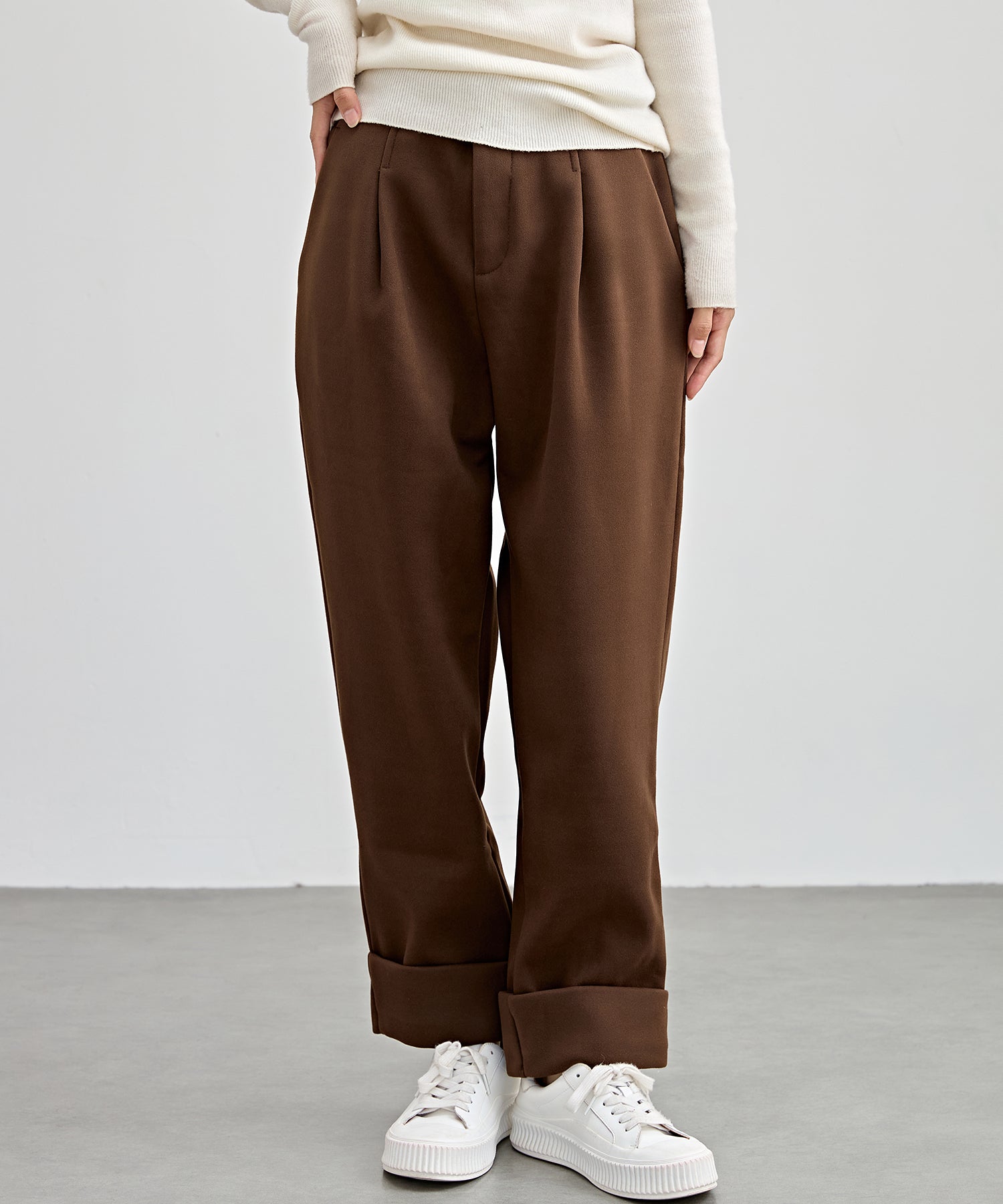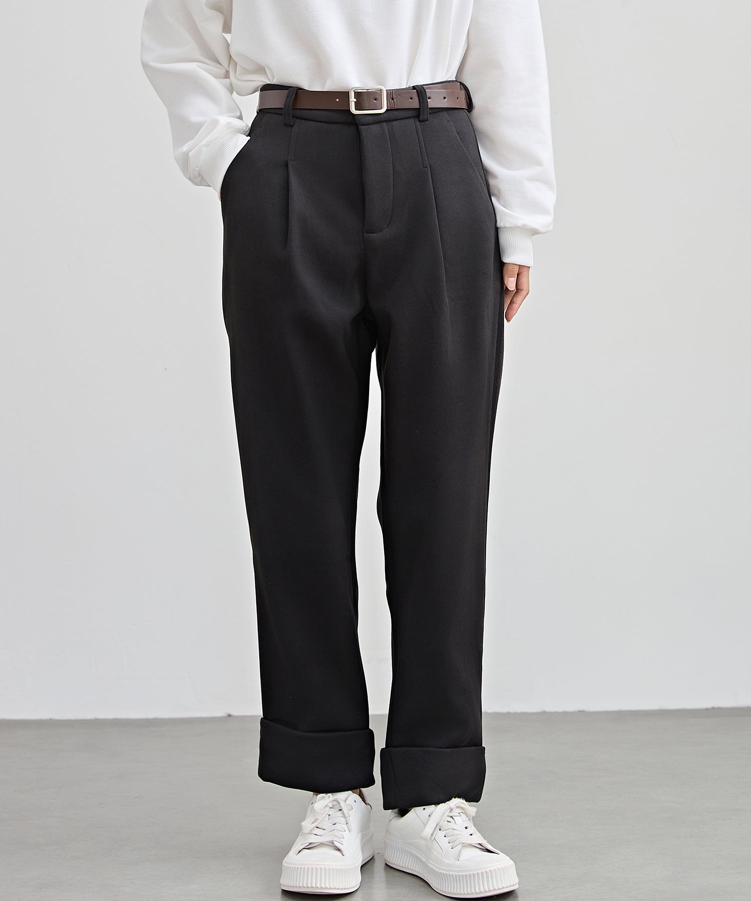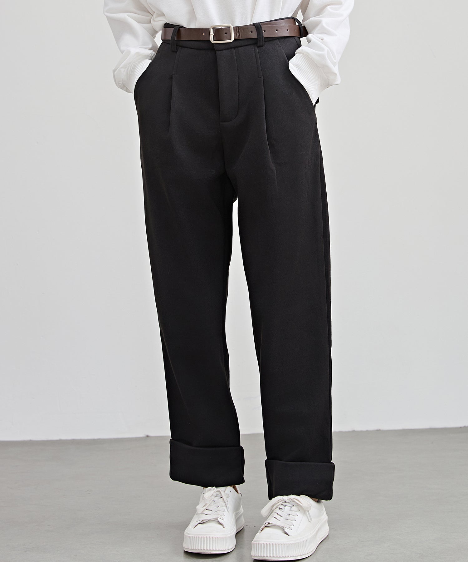 裏起毛 ストレート ロールアップ タック パンツ