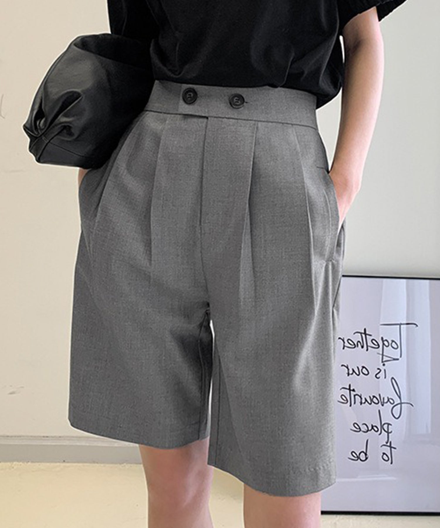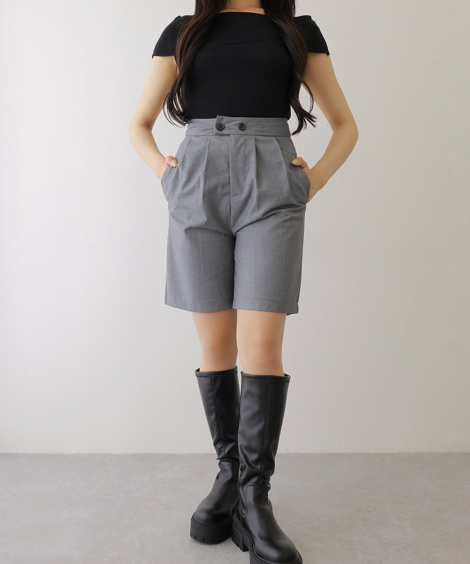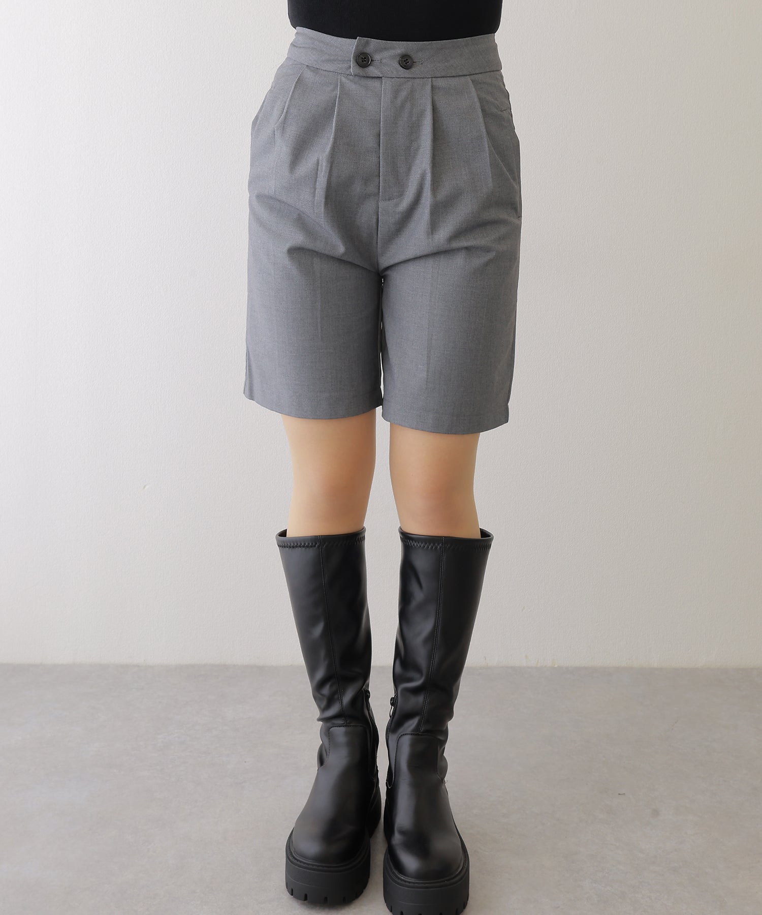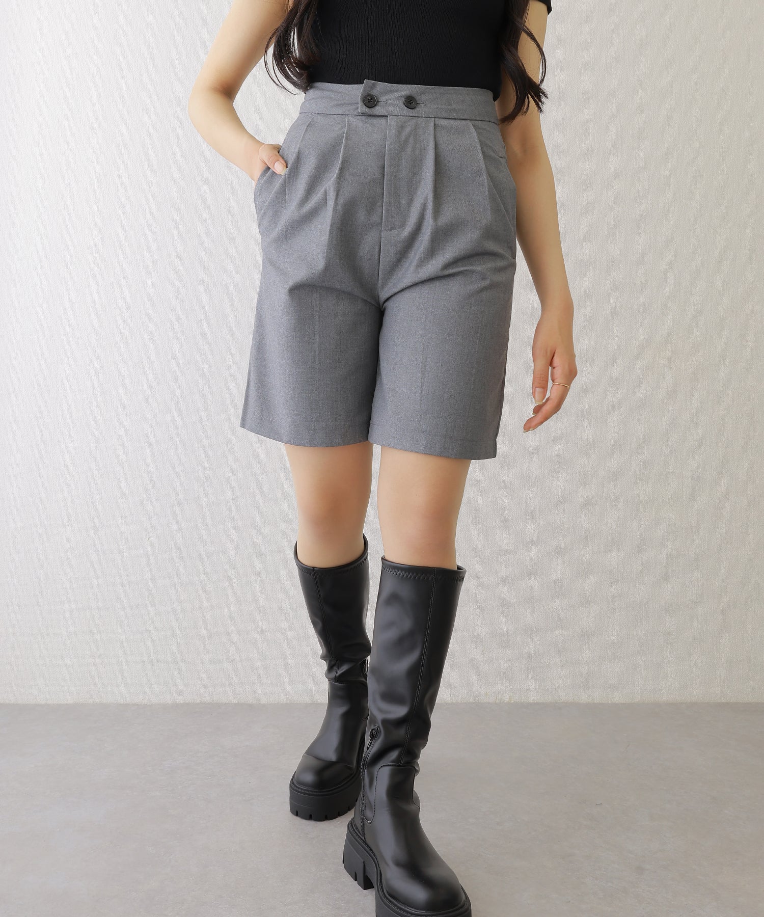 フロントボタン ダブルタック ハイウエスト ハーフ パンツ