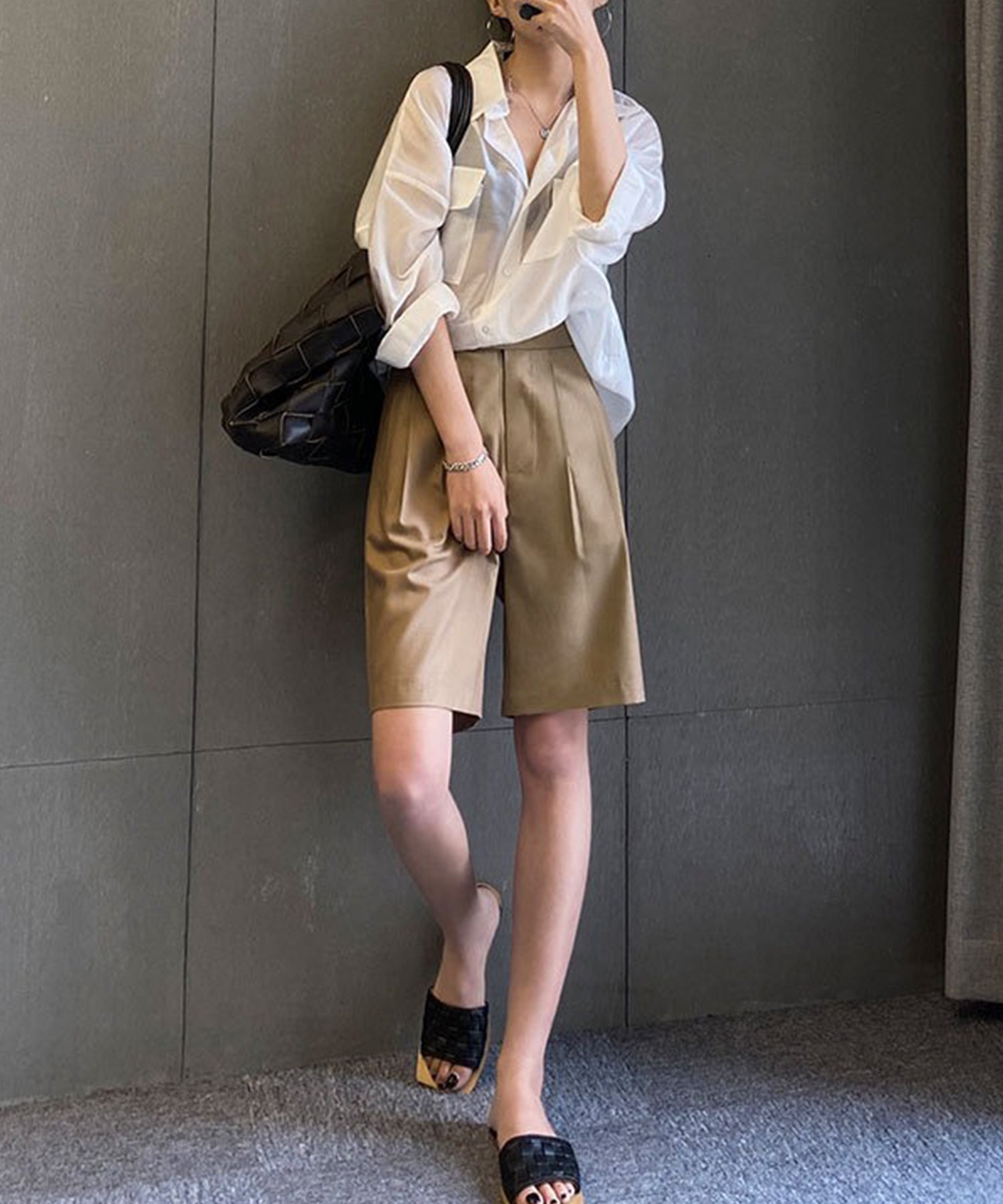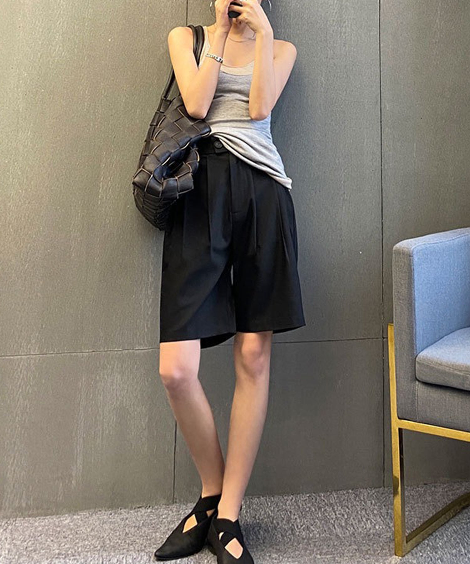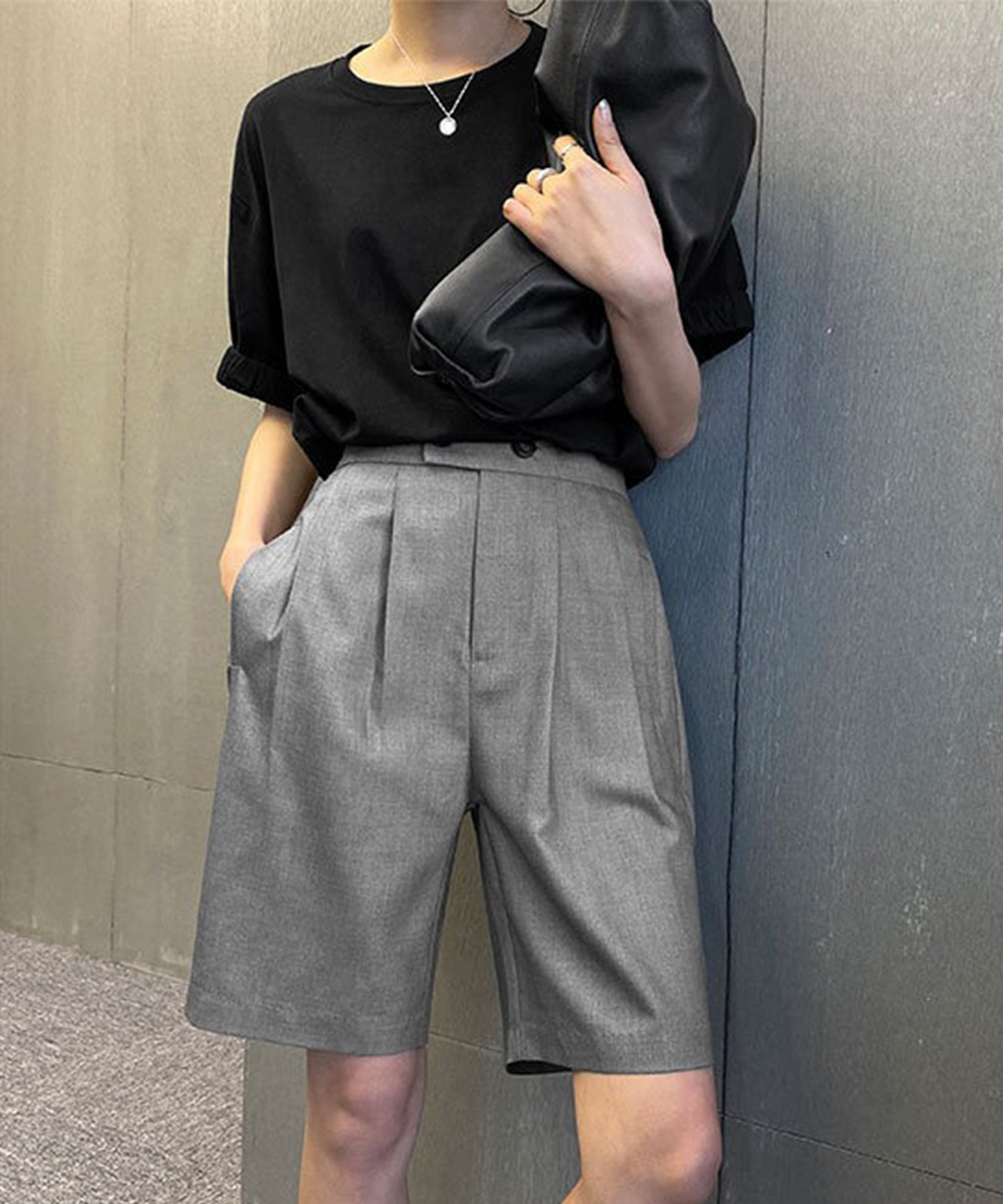 フロントボタン ダブルタック ハイウエスト ハーフ パンツ