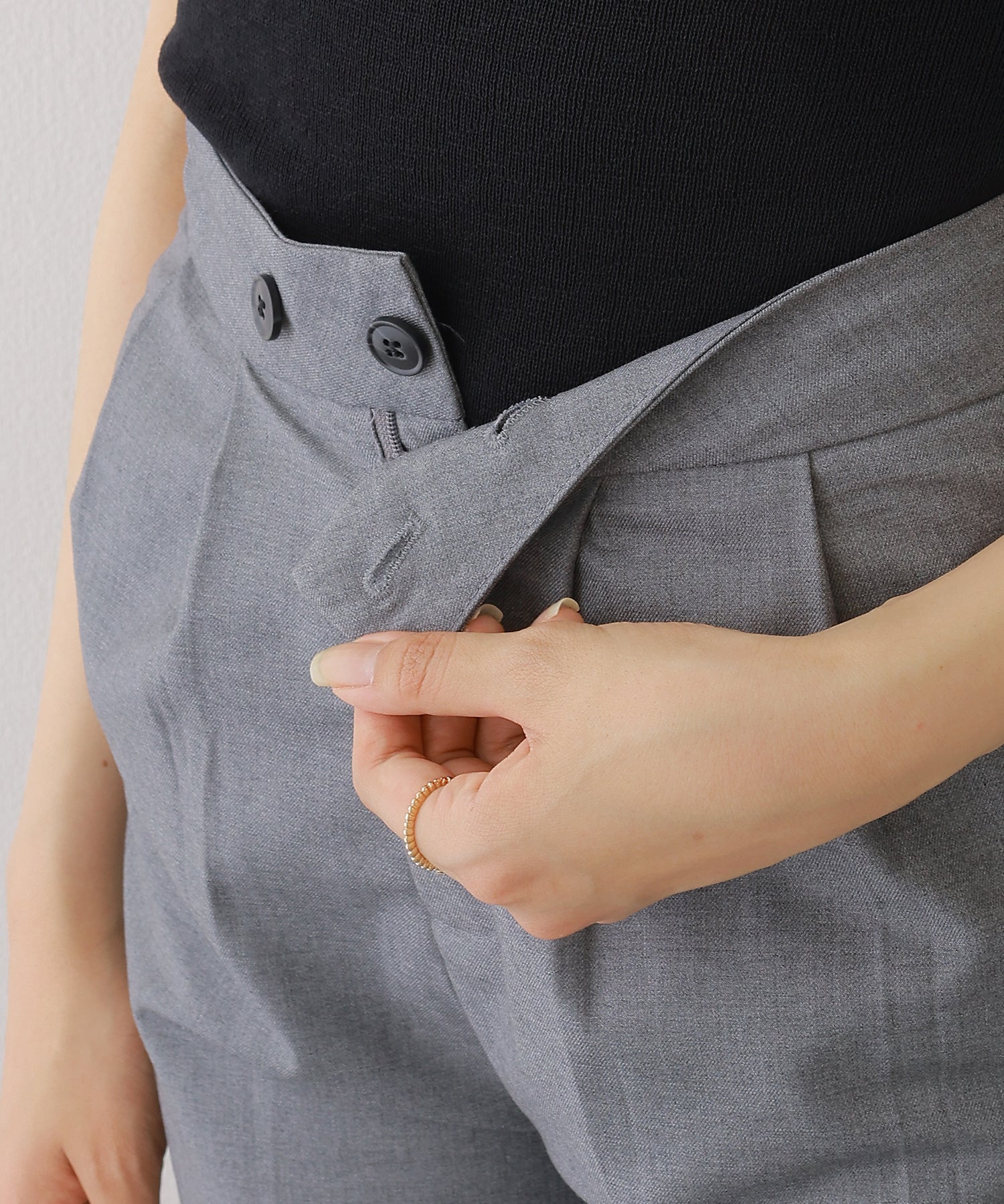 ハイウエストデザインが目線を上げてくれるので、パンプスを合わせたときもバランスが取りやすいのがポイント。