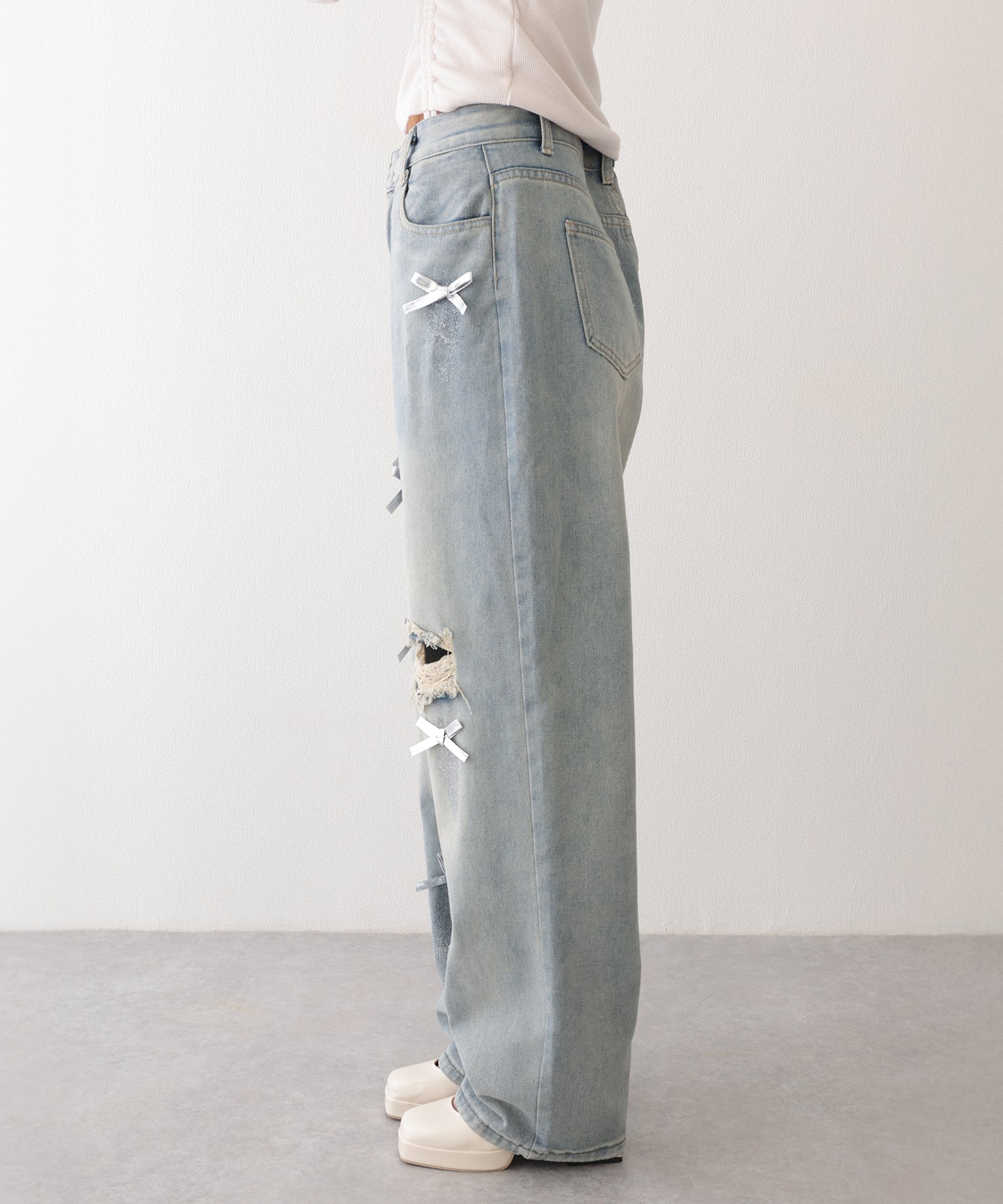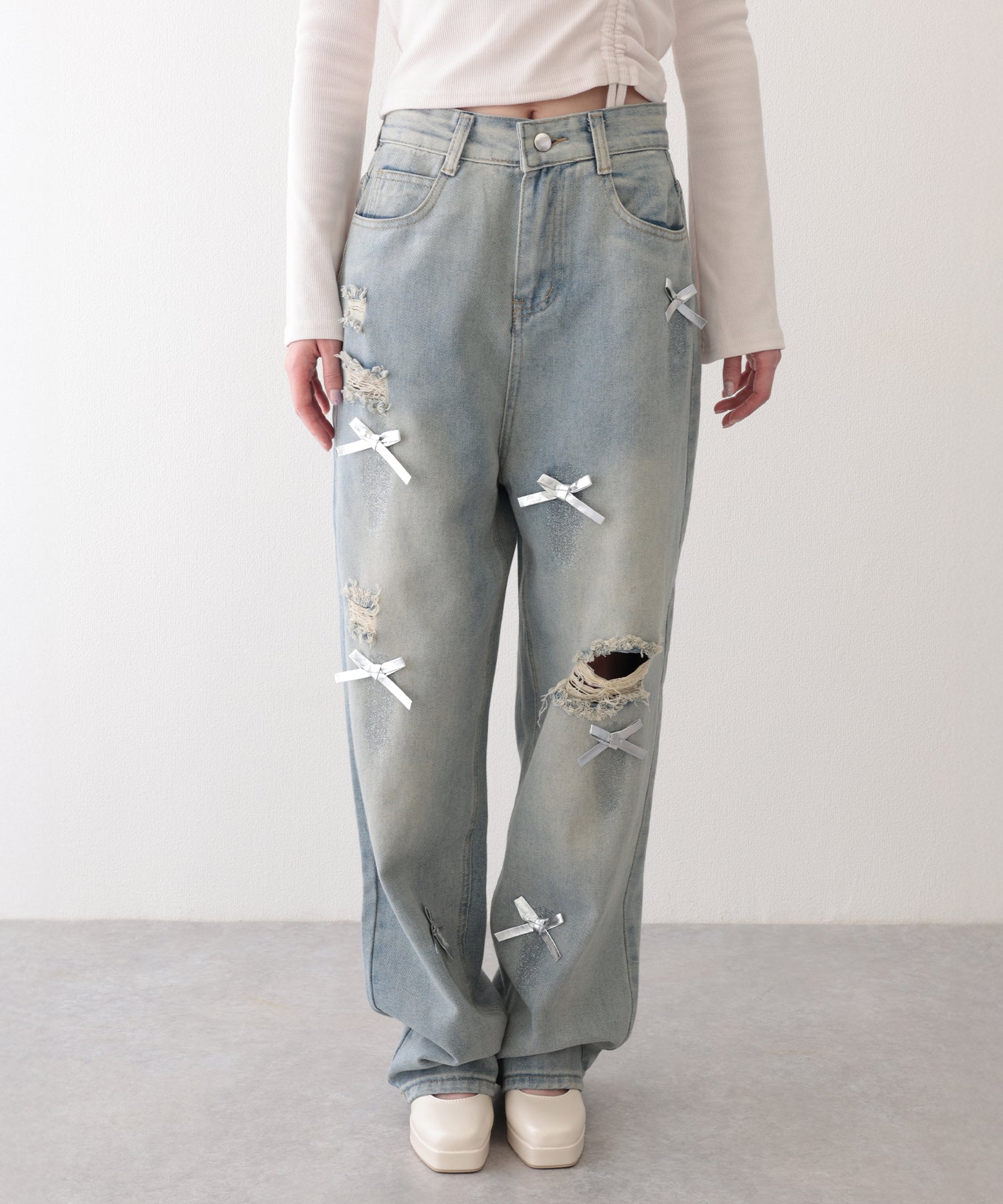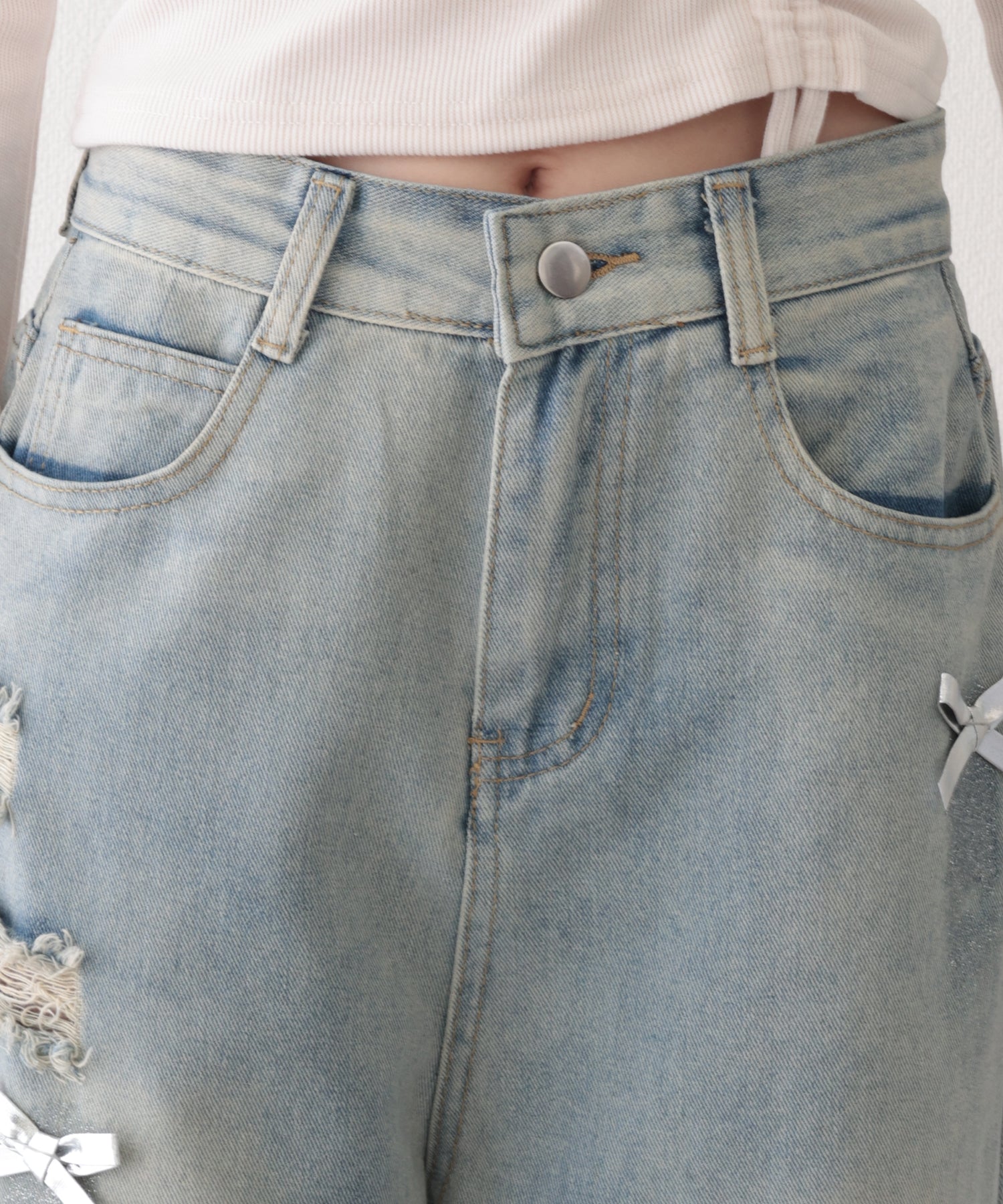 ウォッシュ加工 ダメージ リボン付き ハイウエスト デニムパンツ