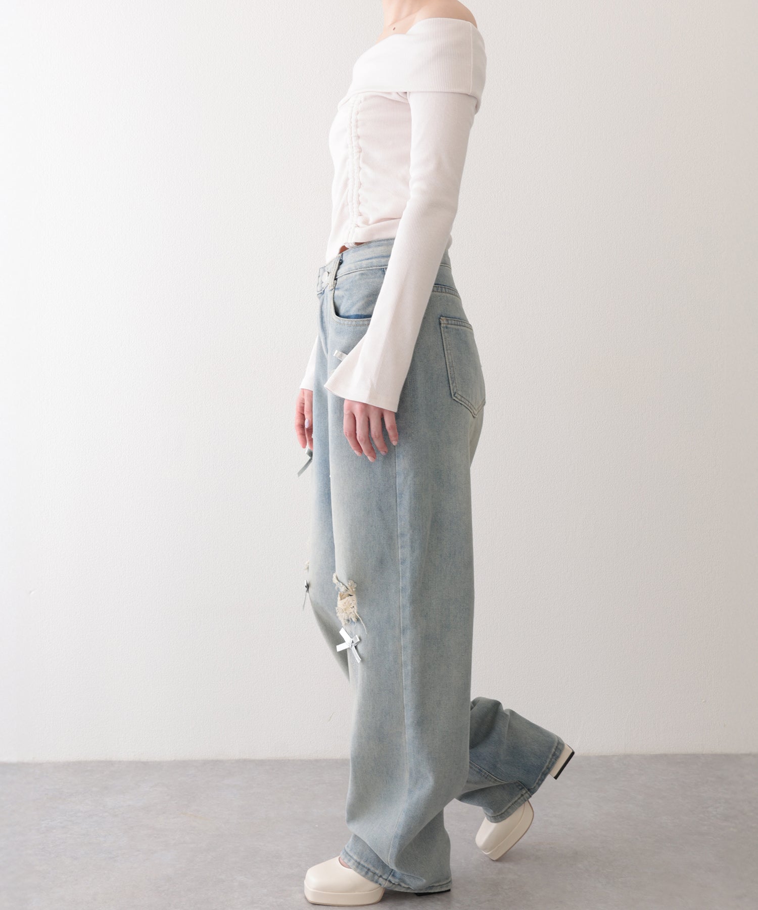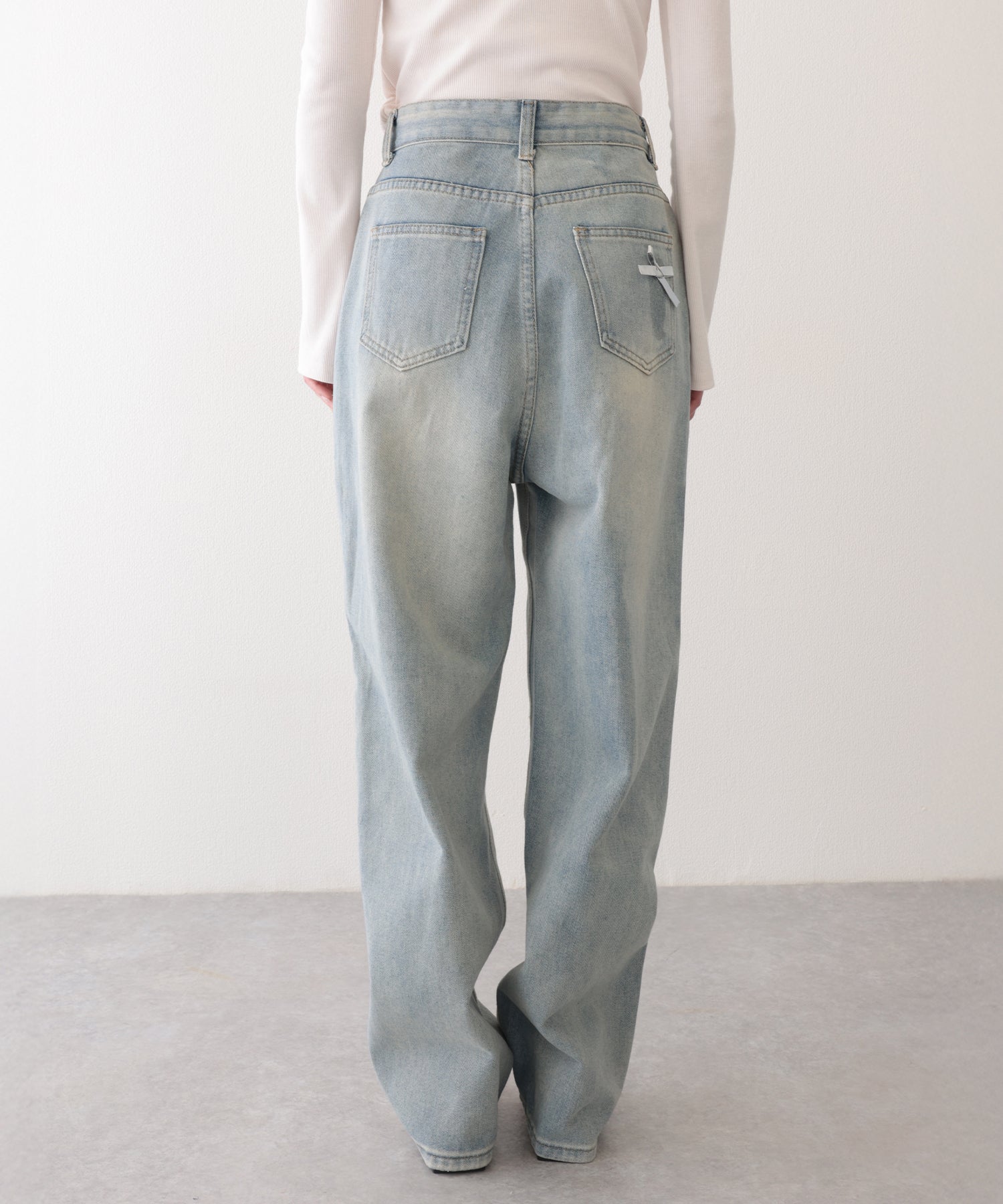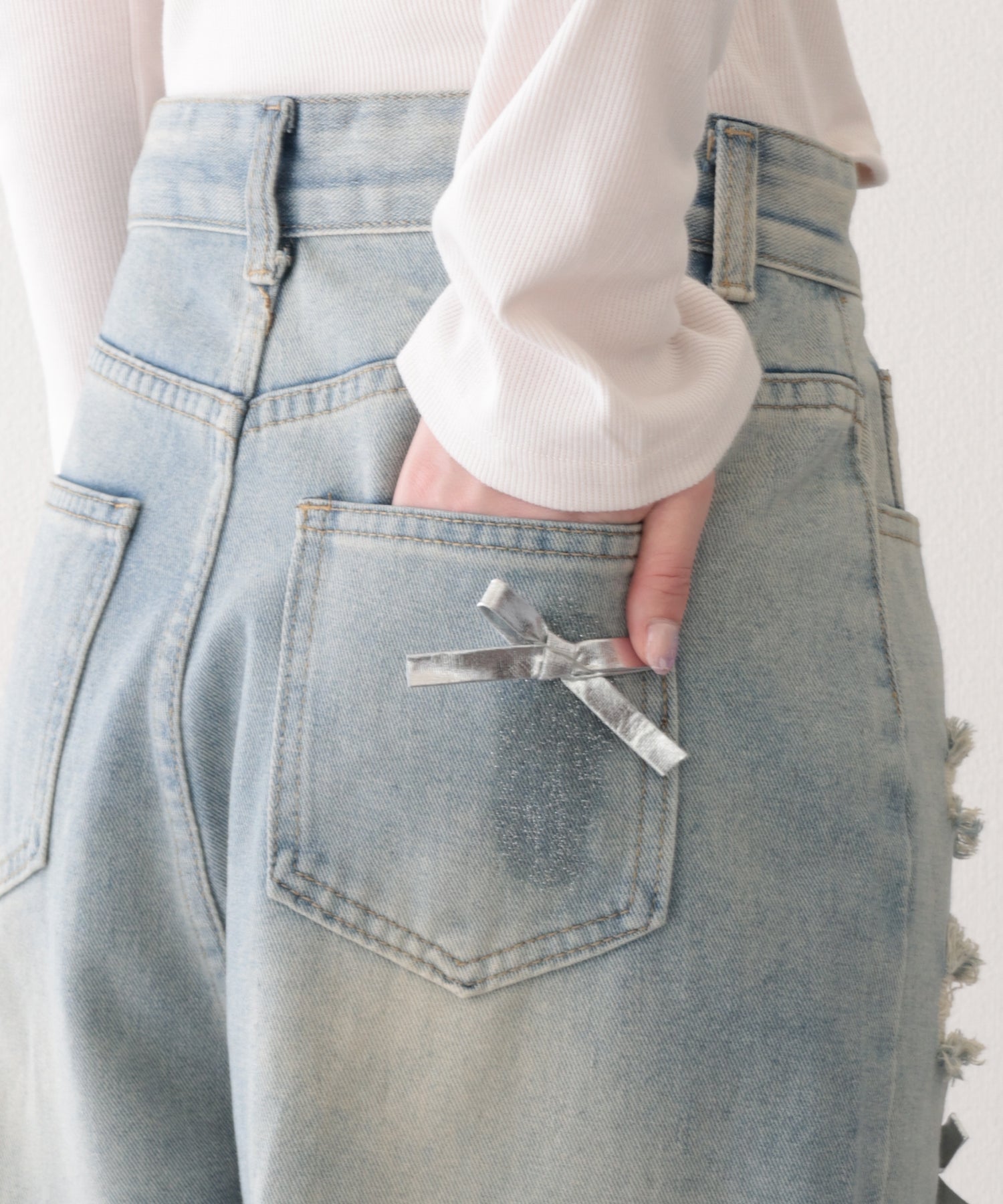 ウォッシュ加工 ダメージ リボン付き ハイウエスト デニムパンツ