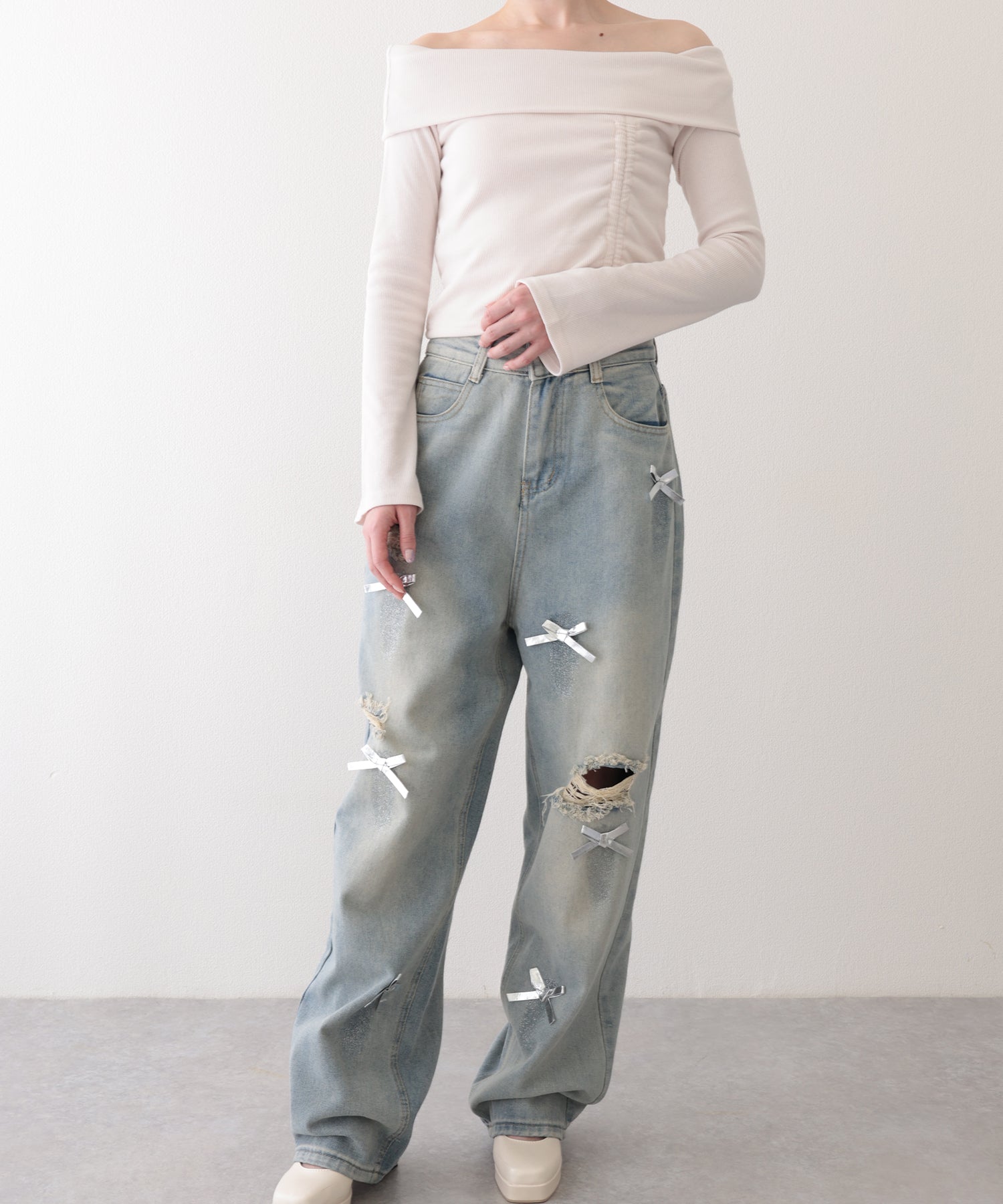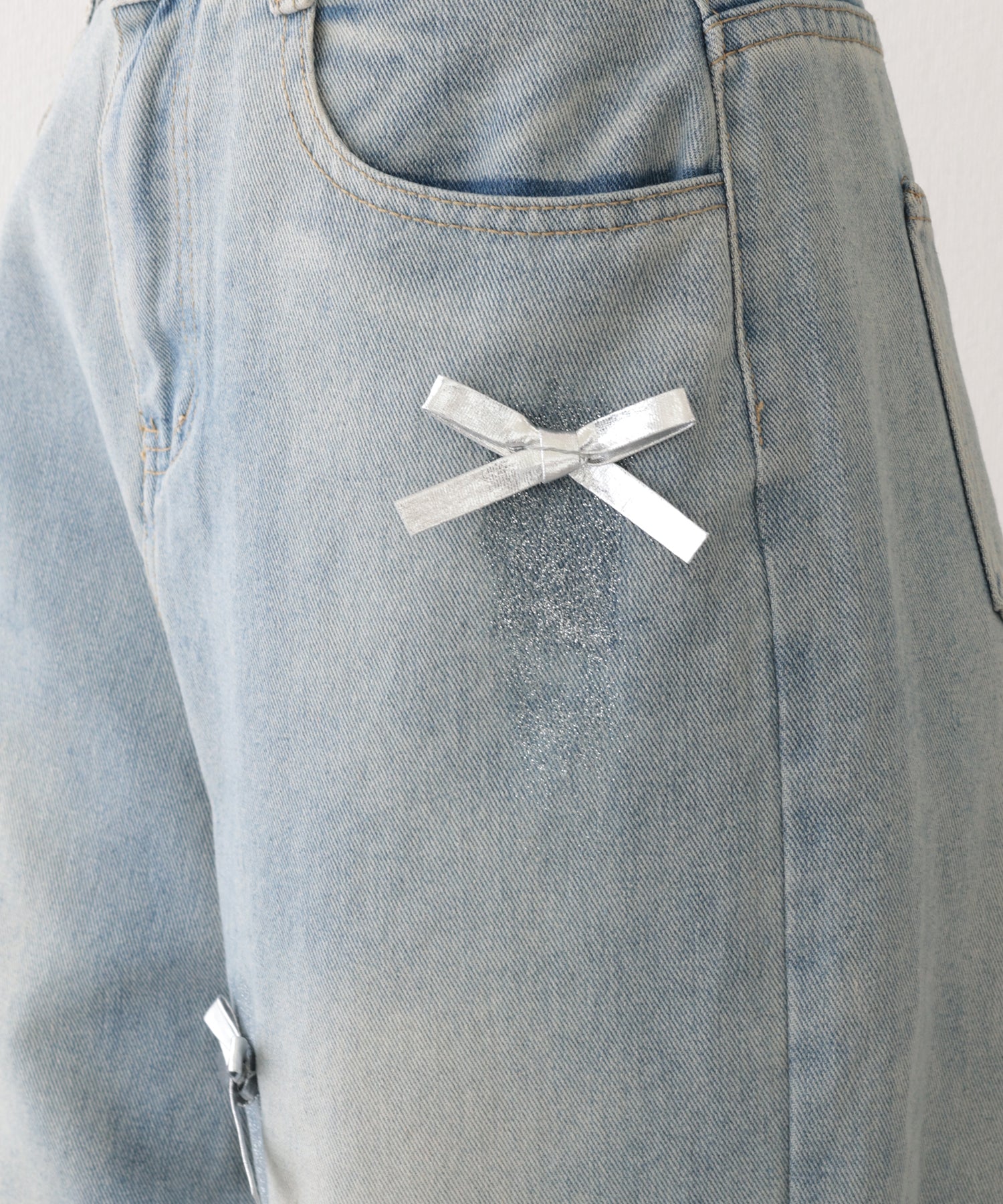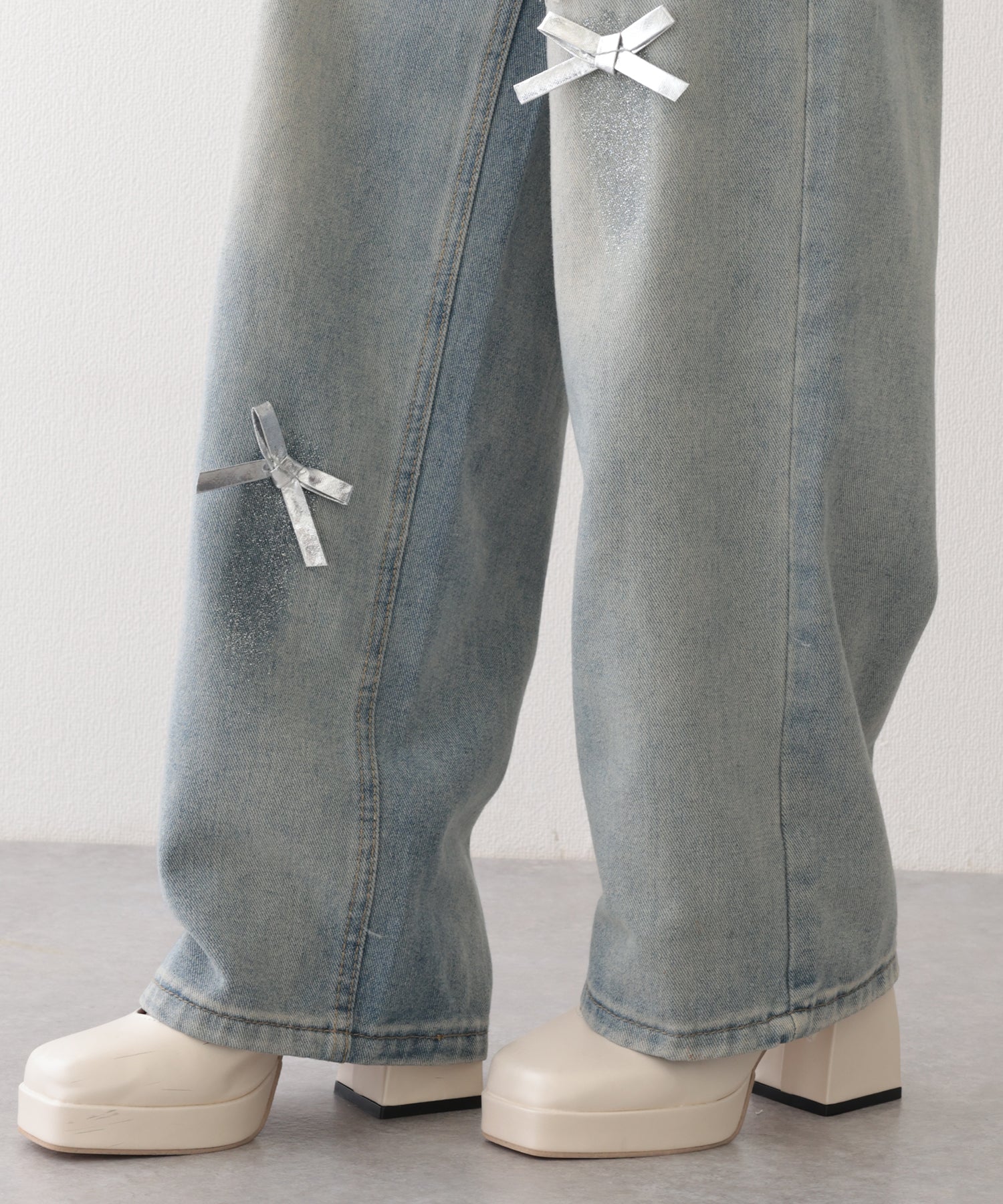 小さなリボンをランダムにあしらったスイートなデニムパンツ。