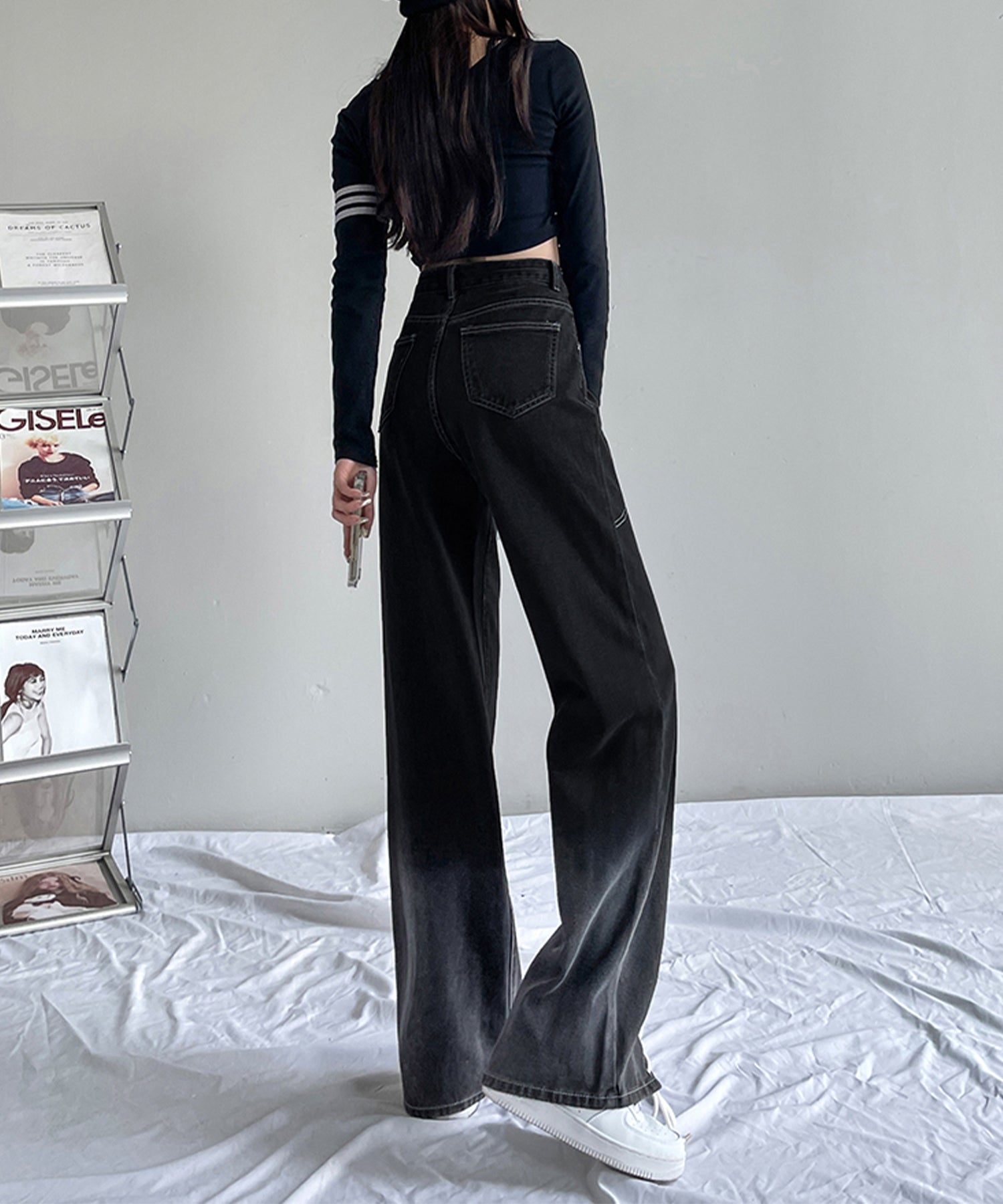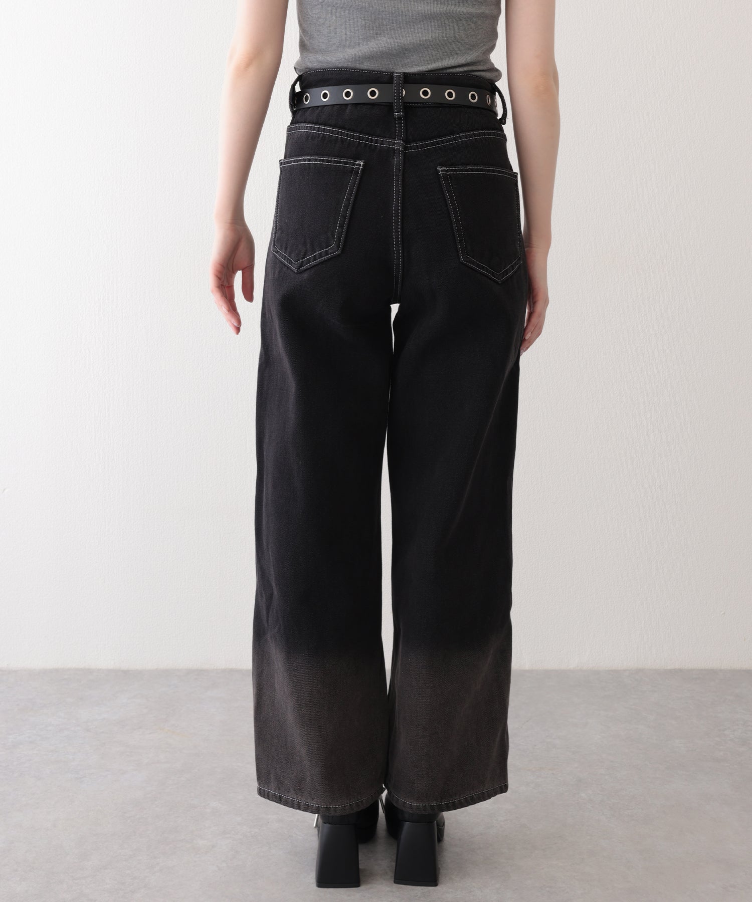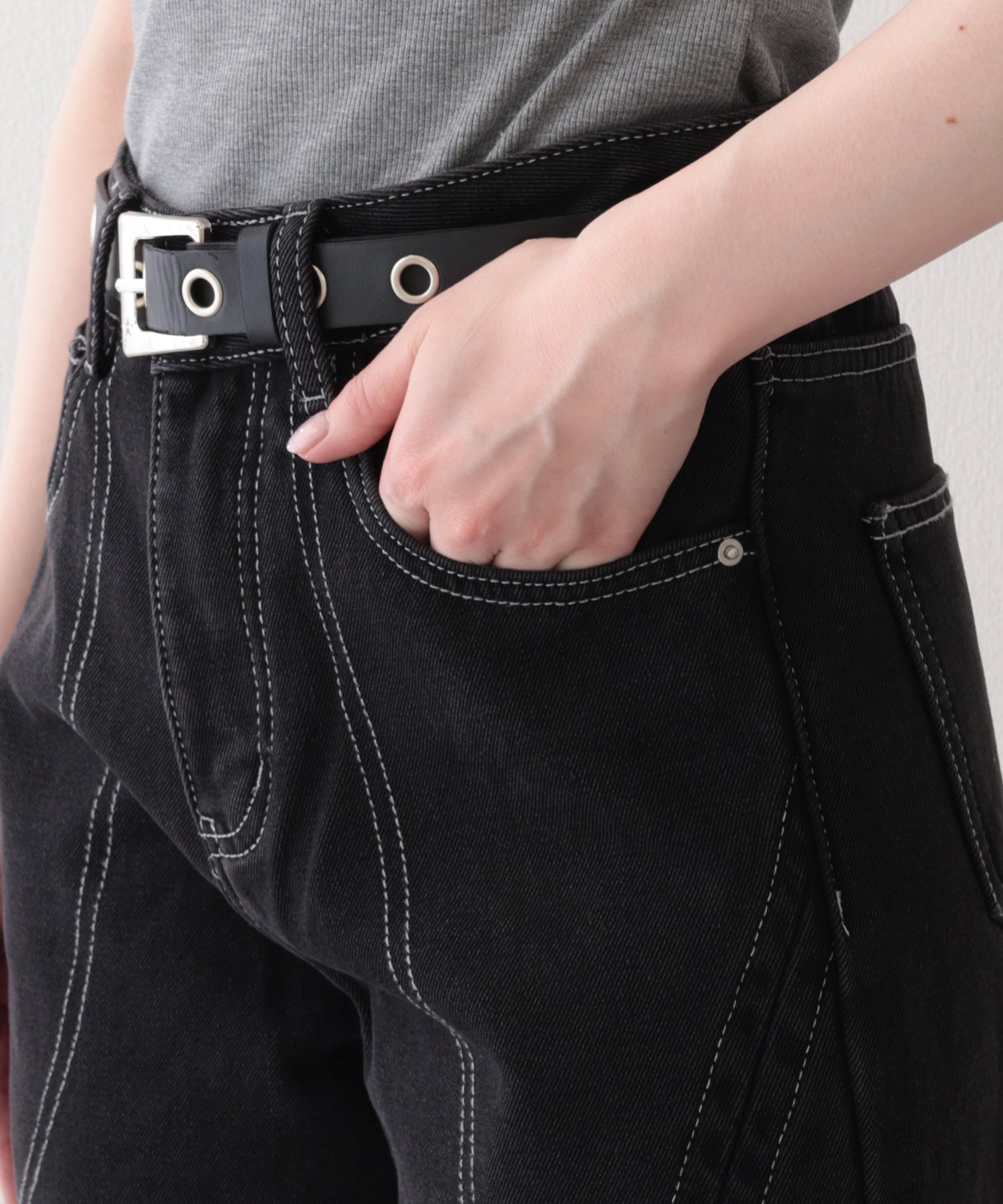 程良いゆとりがあるストレートシルエットは脚線を拾いにくく、縦のラインを促すステッチによってスッキリとした印象に。