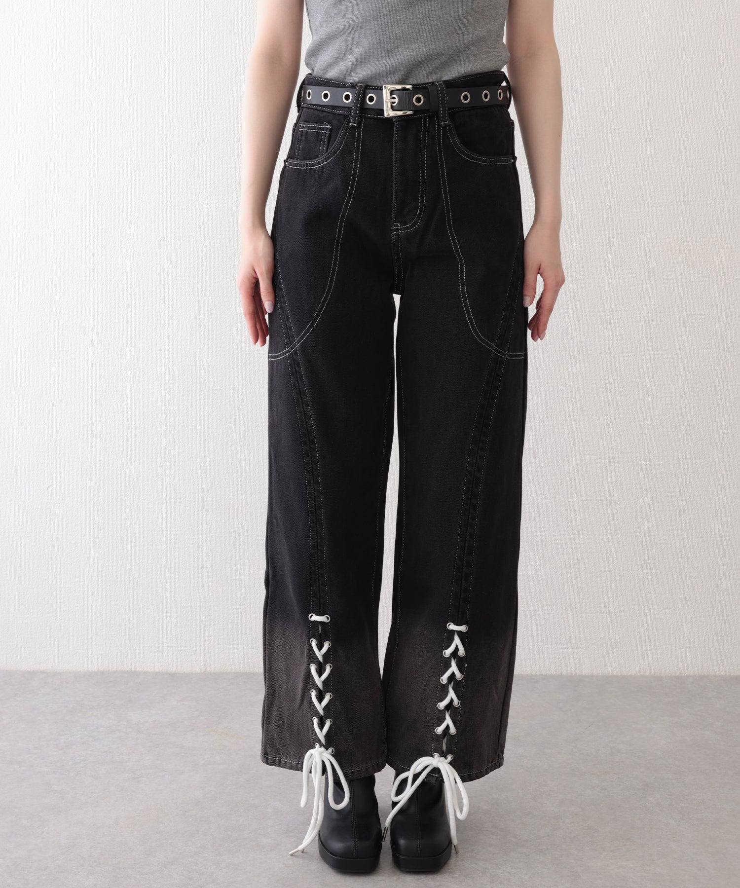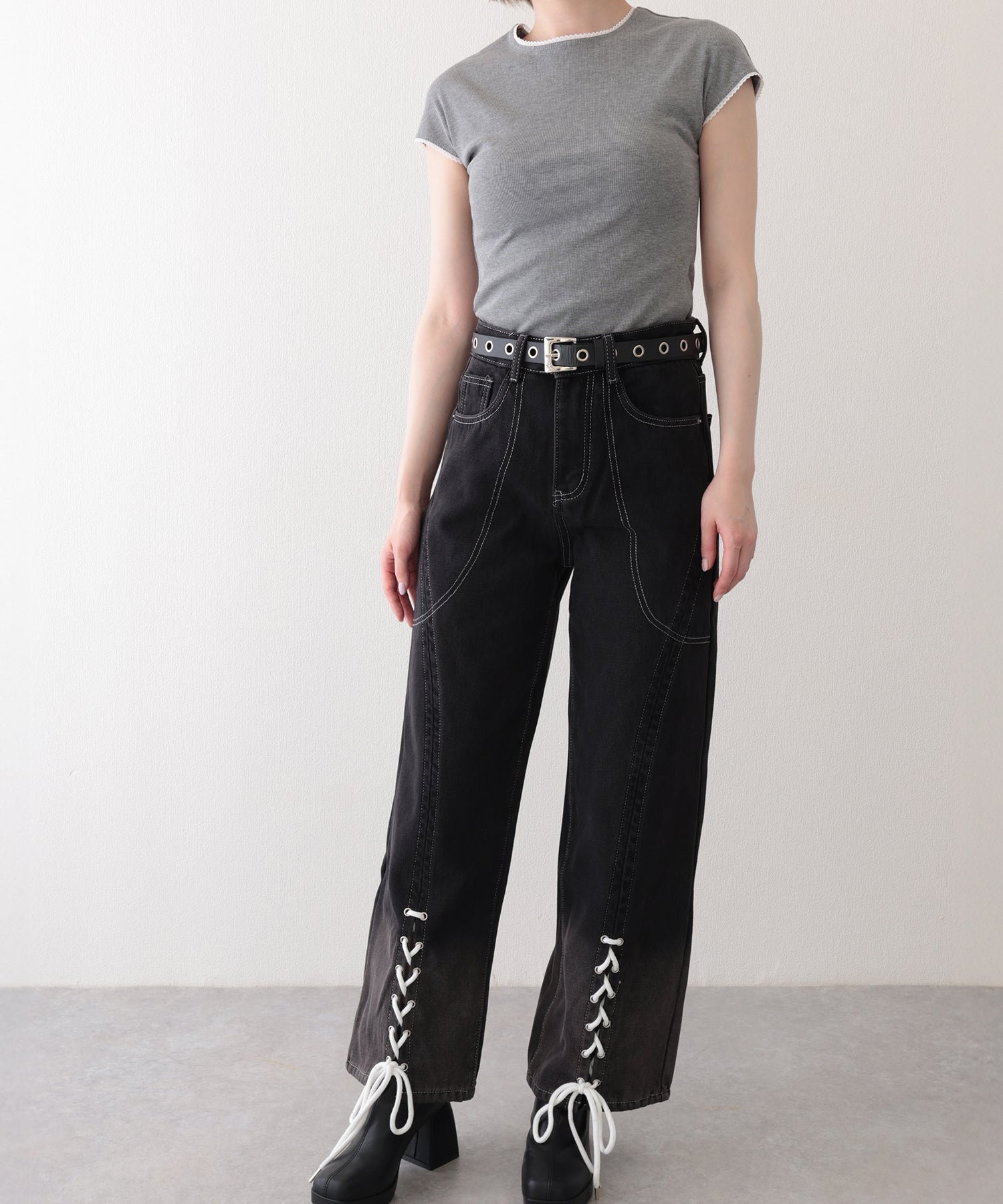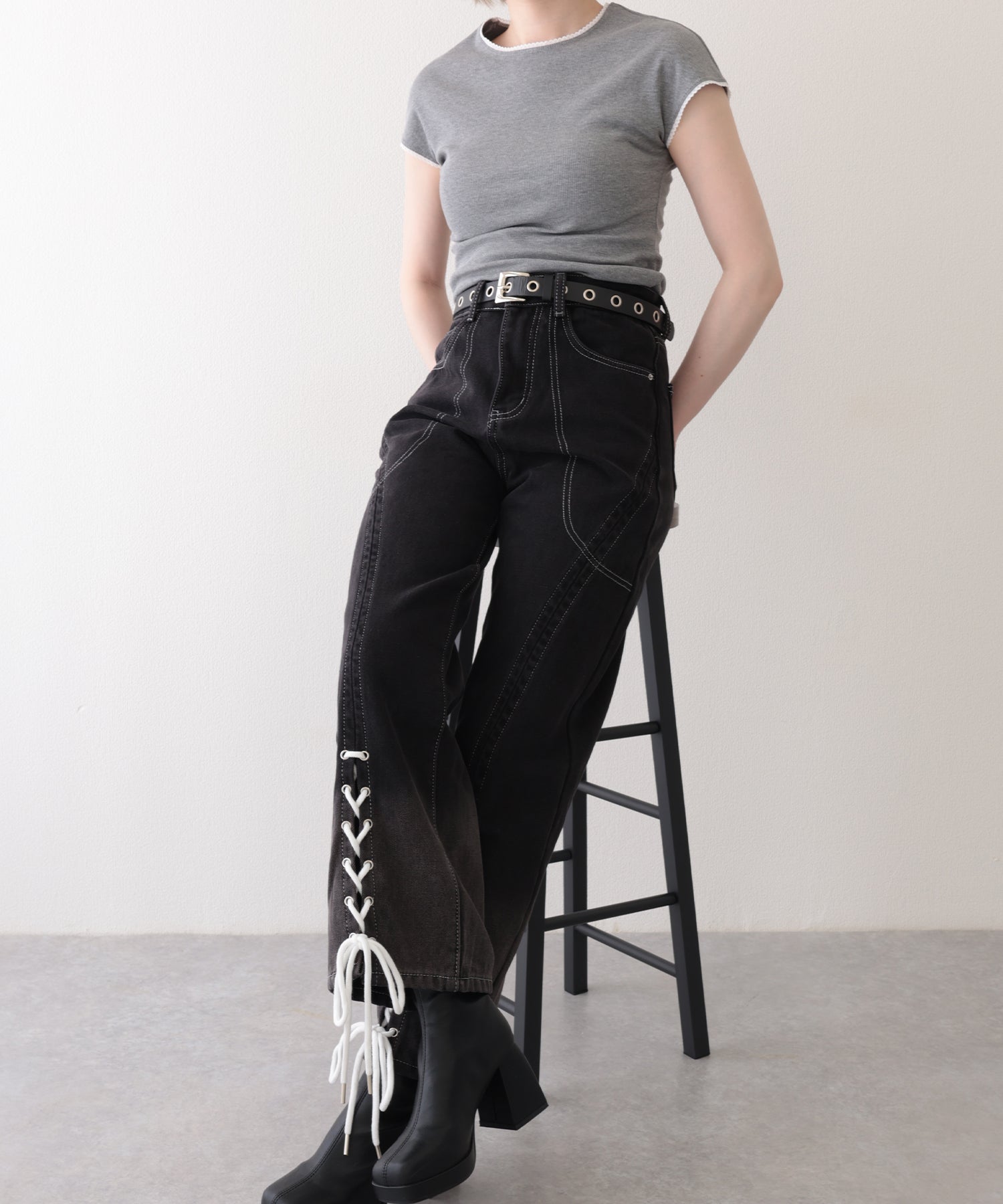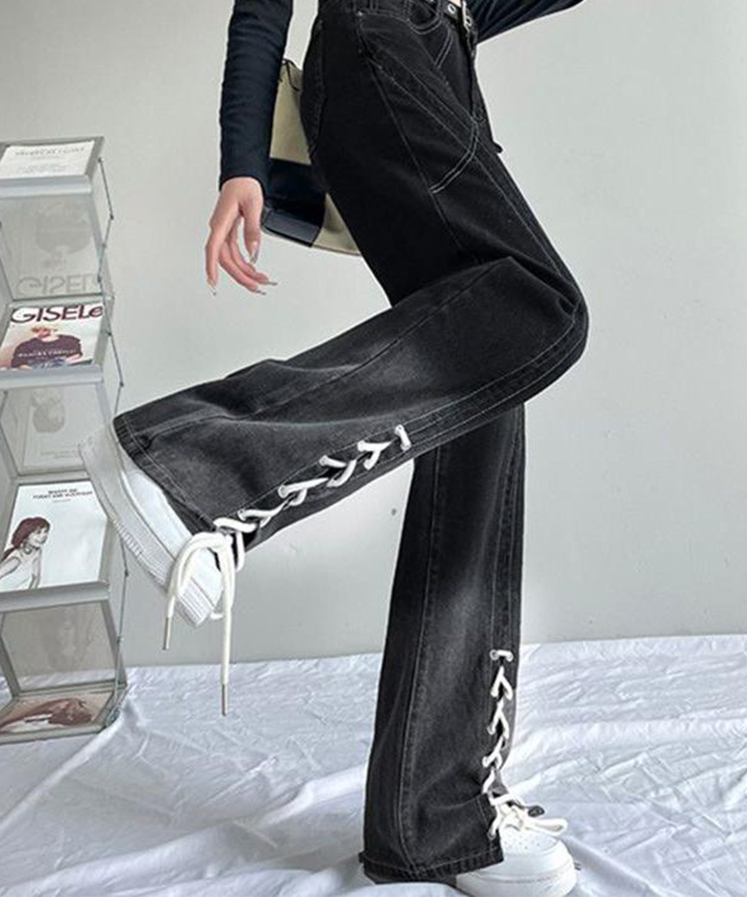 配色 ステッチ フロント レースアップ ハイウエスト デニムパンツ