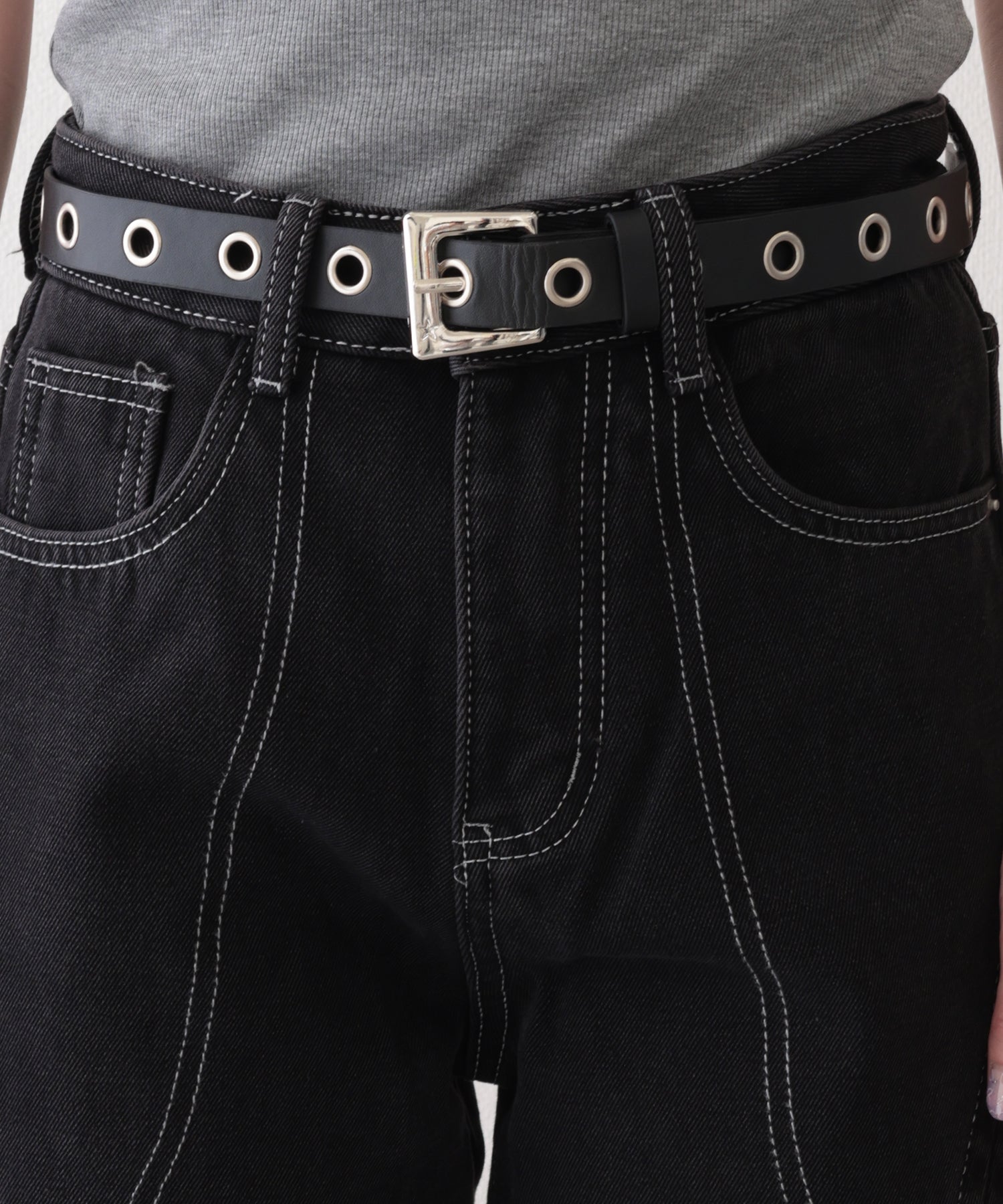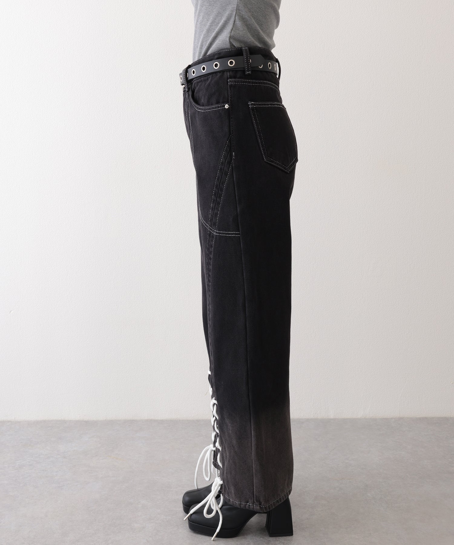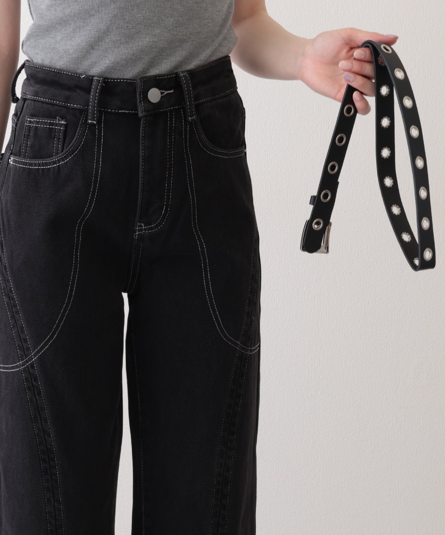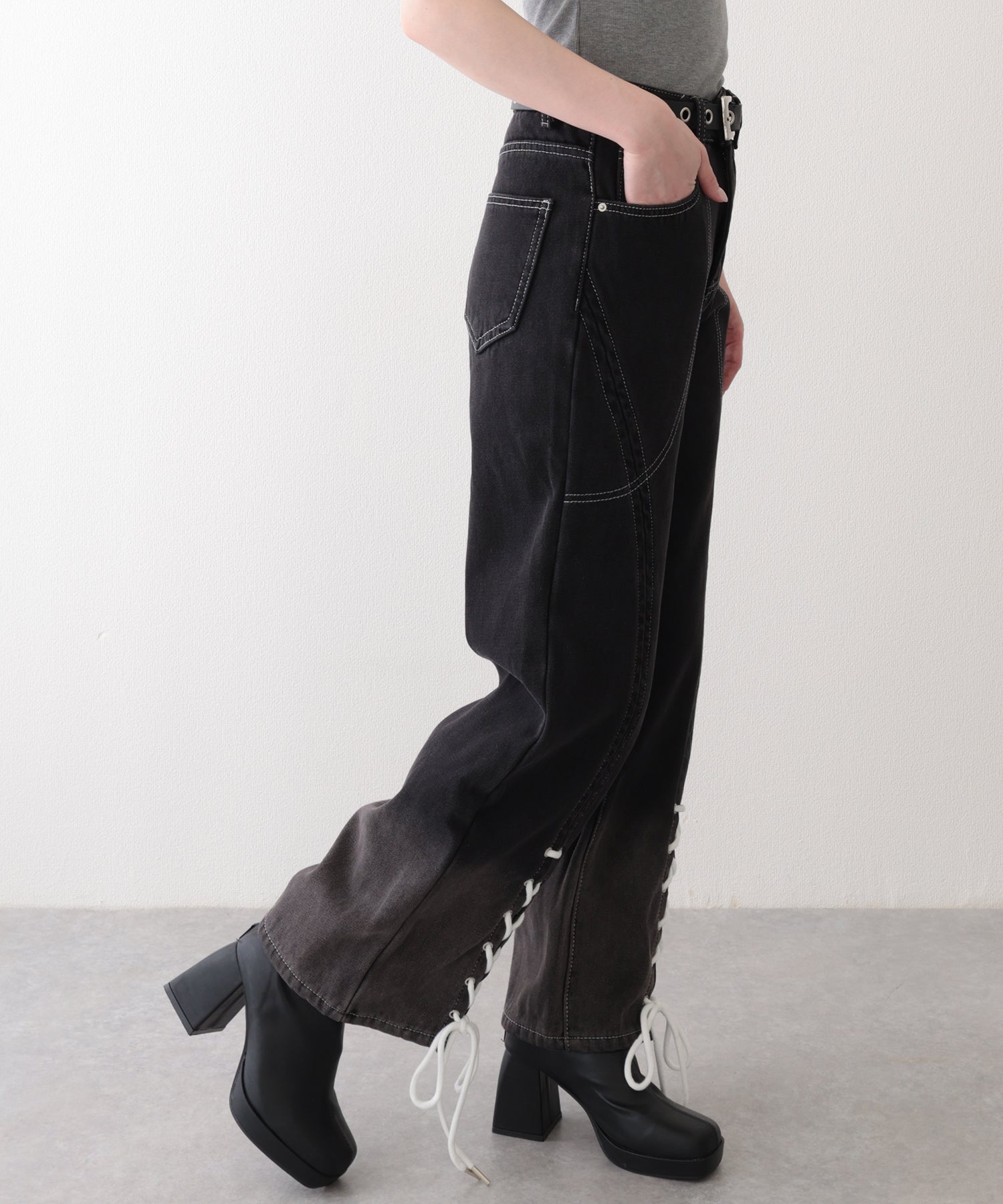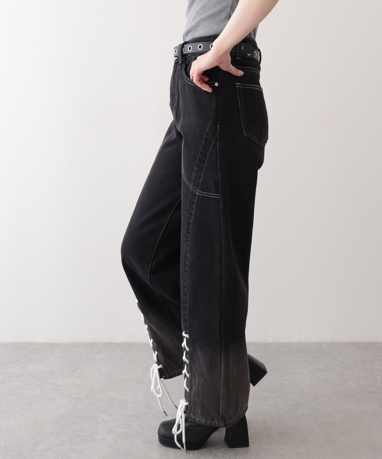 配色 ステッチ フロント レースアップ ハイウエスト デニムパンツ