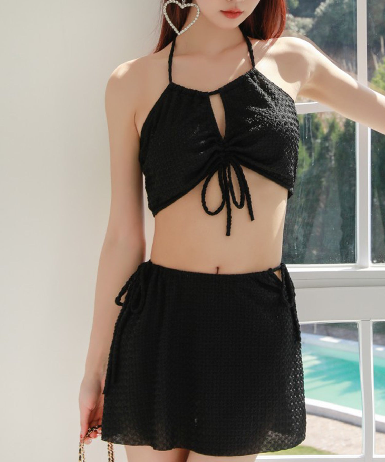 【3点セット】スカート付き ギャザー リボン ホルターネック スイム ウエア