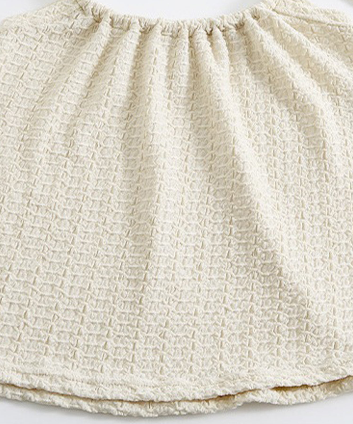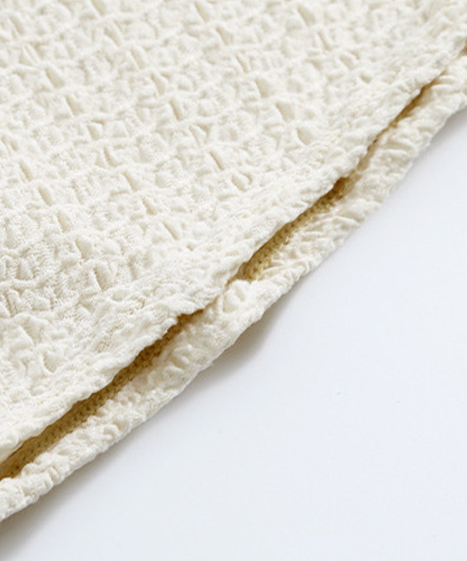 ボディを包むセットアップは、単色ベースながらも凹凸生地で表情豊かに仕上げました。