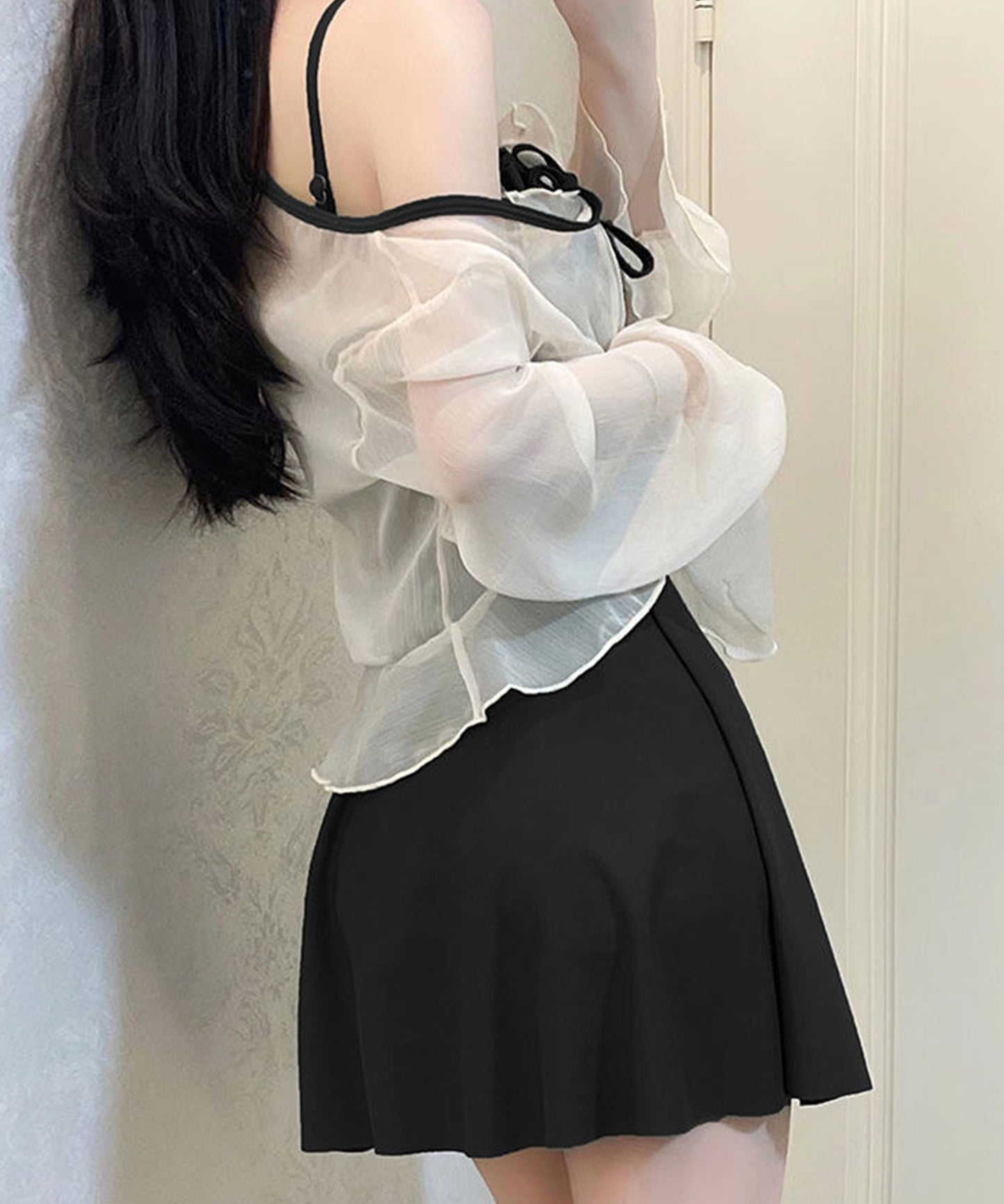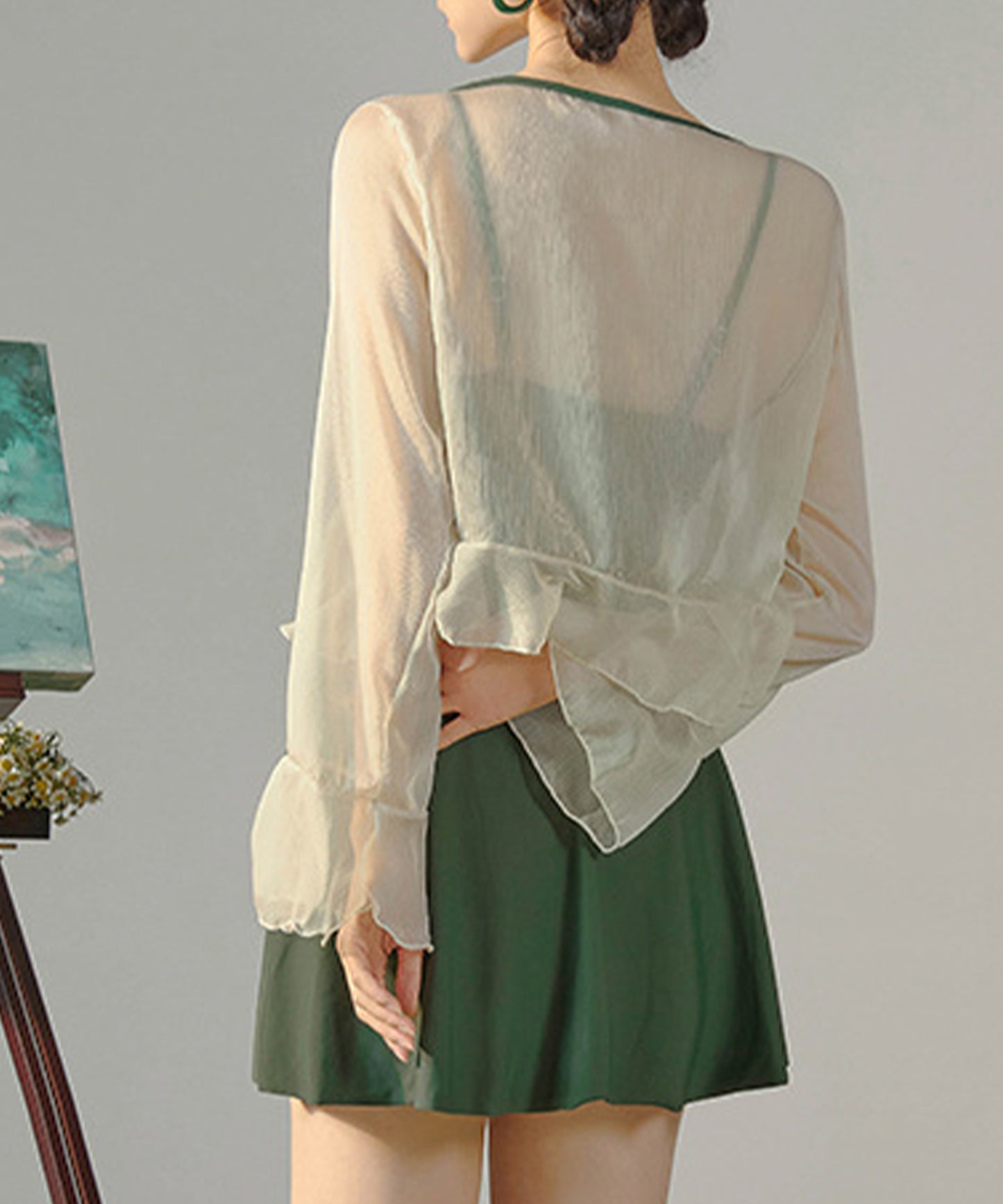 休憩中の肌寒さや強い日差しから身体をカバーしてくれる、シアーボレロ付き。