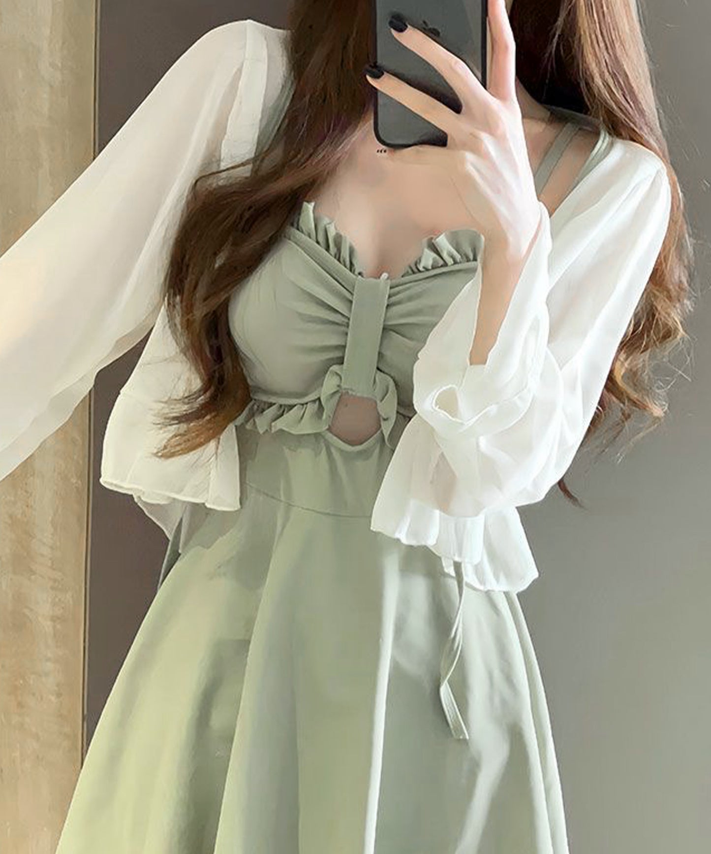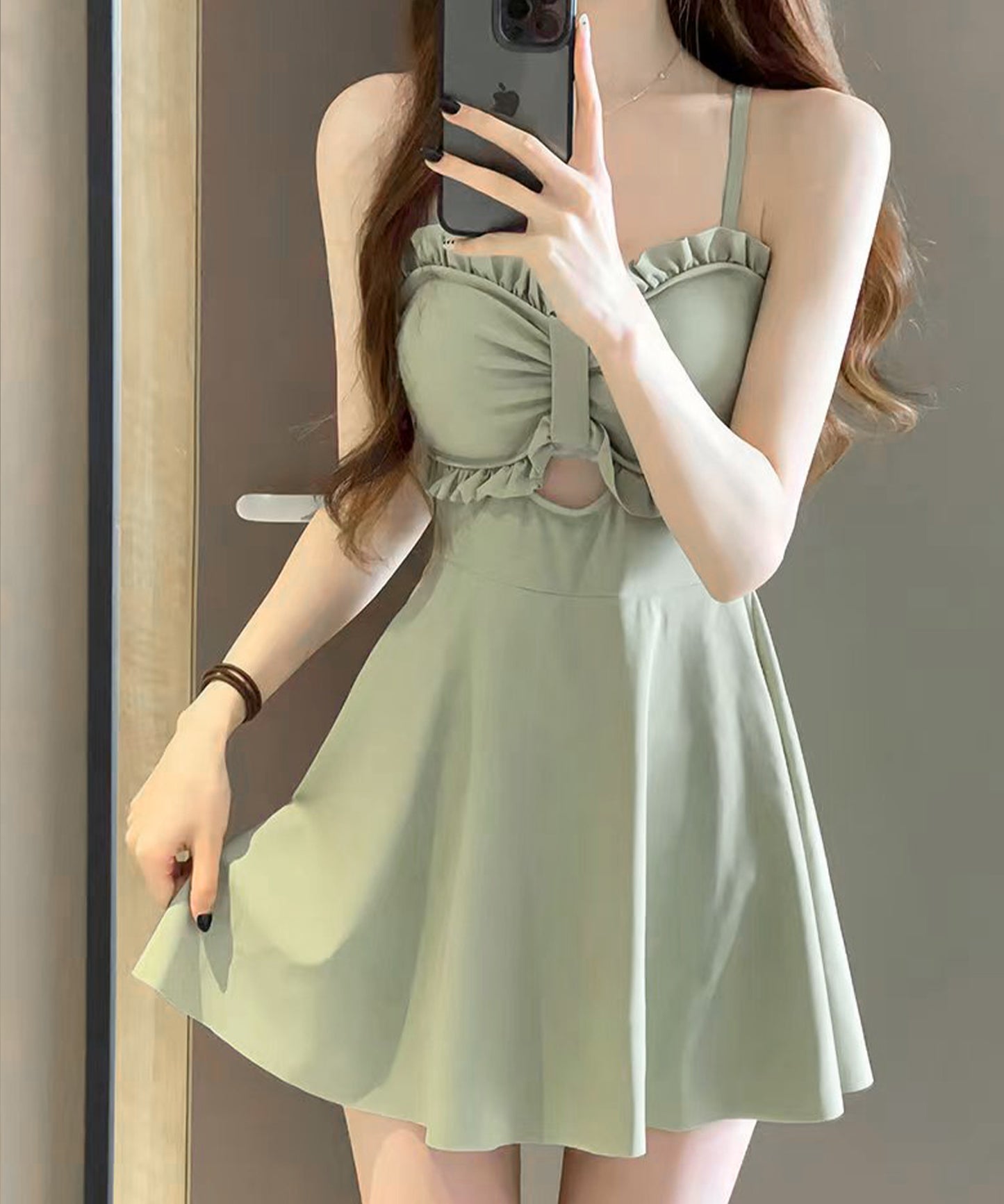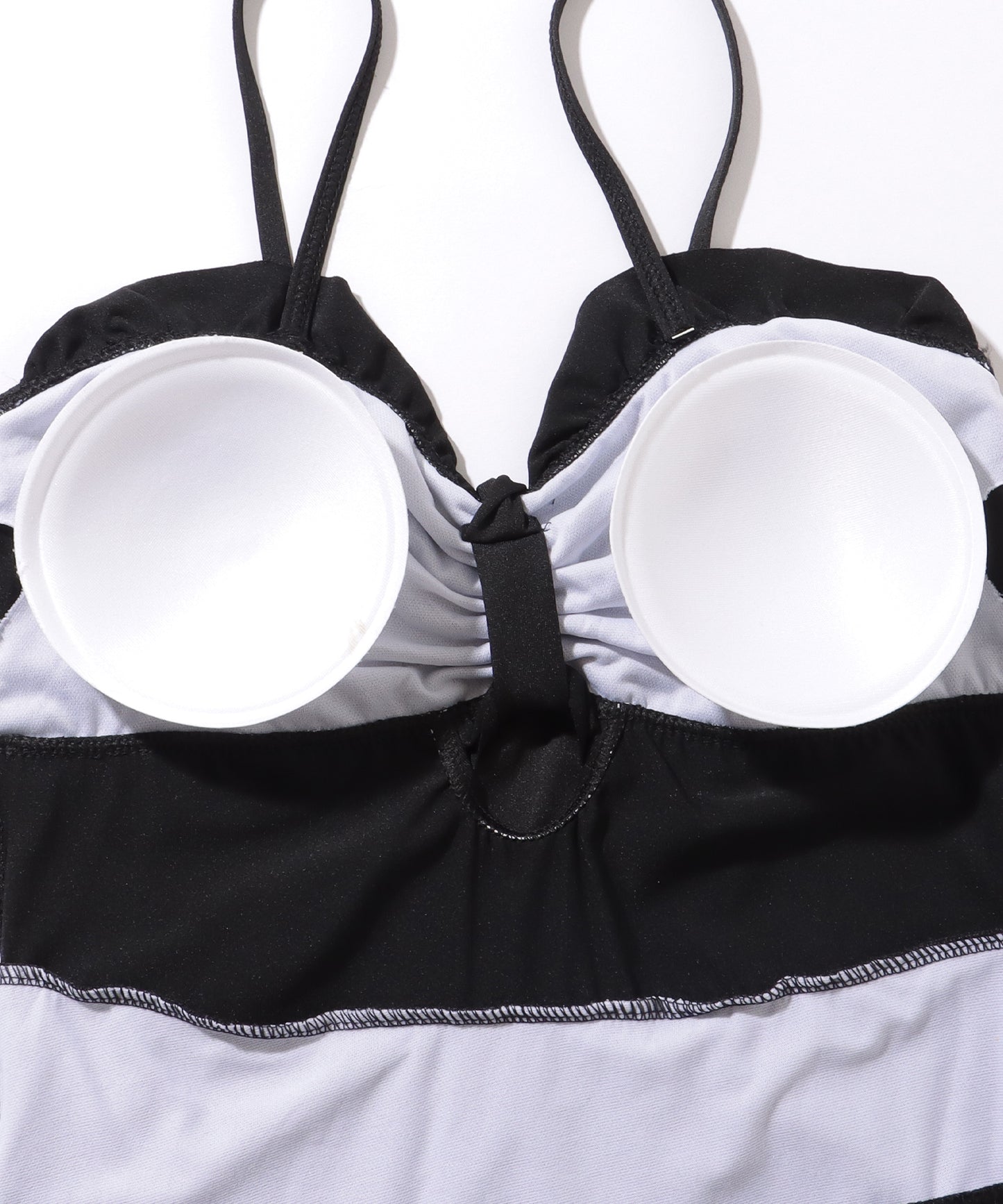 リボンがイメージできるキュートなデザインの胸元には、フリルやカットアウトデザインをプラスすることで、トレンド感たっぷりに仕上げました。