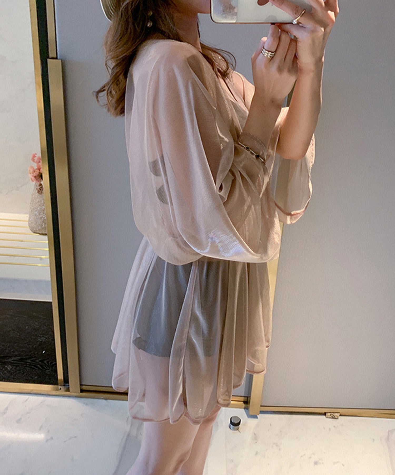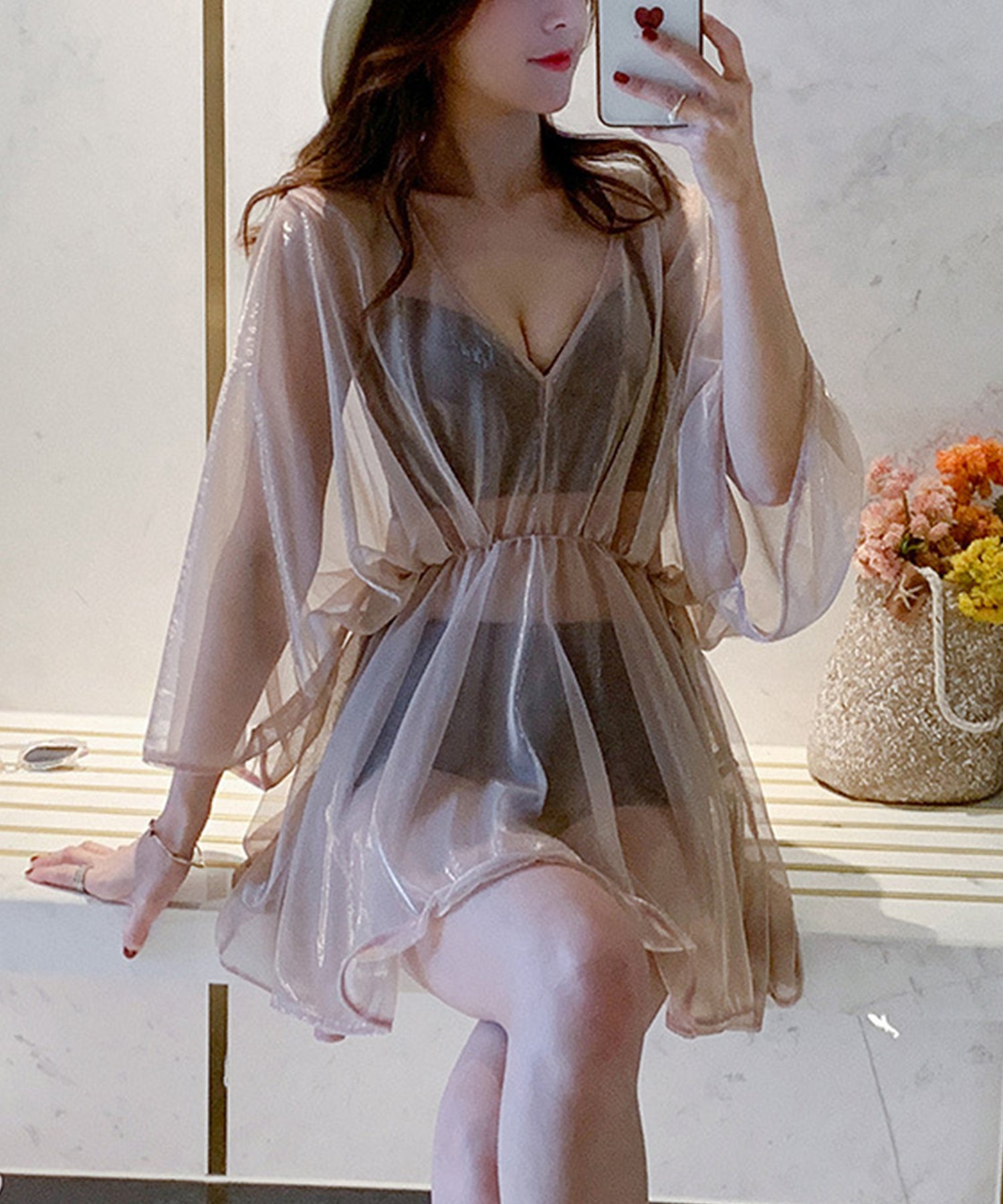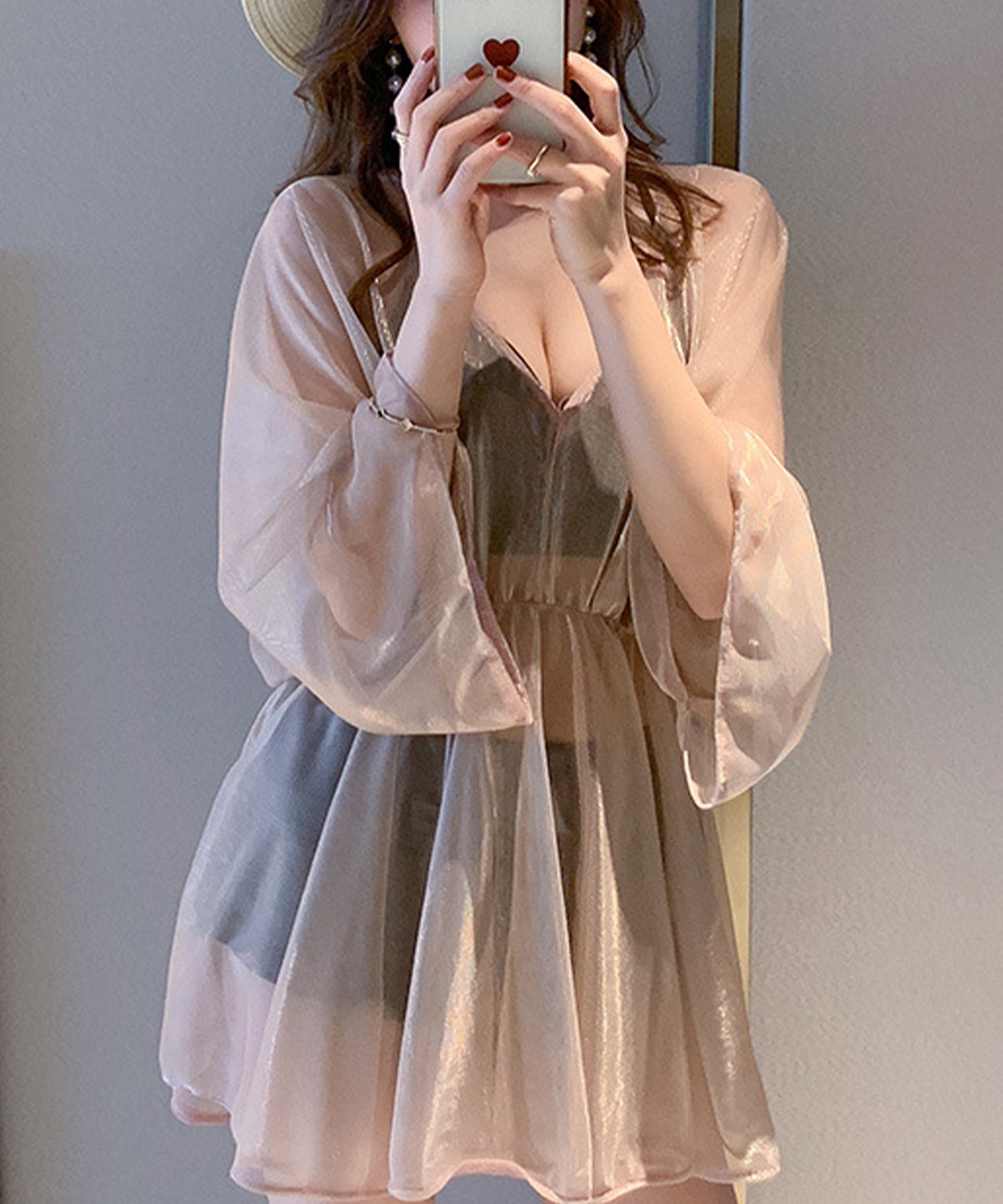 ふんわりと素肌の透ける、シアーチュニック付きの3点セットでご用意しました。