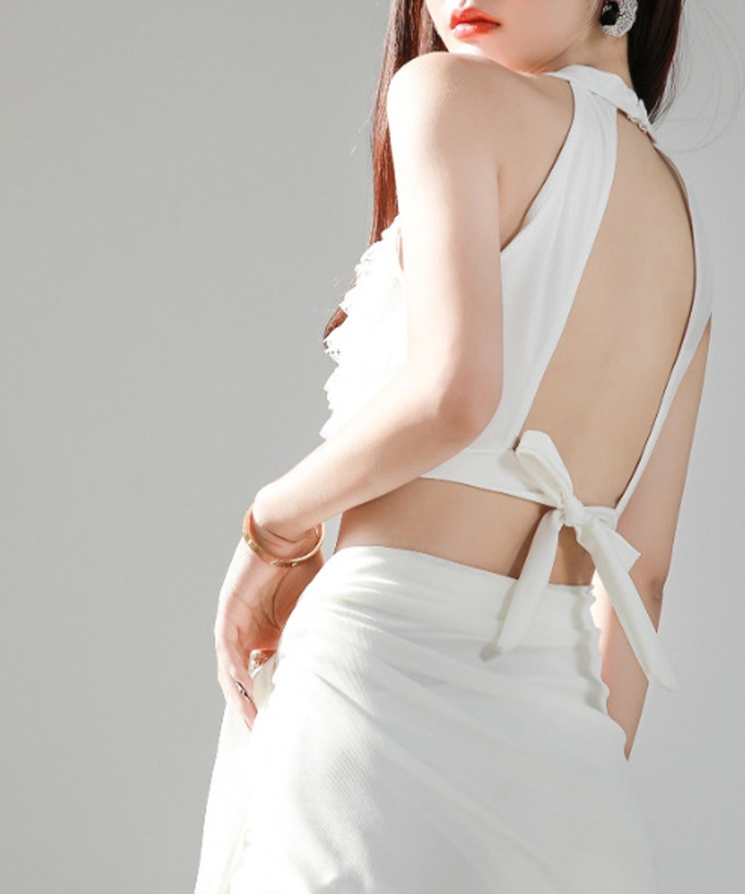 フリルが大人っぽく映える単色ベースのシンプルなデザインでありながら、バックには大胆なカットを入れることで、セクシーな後ろ姿に。
