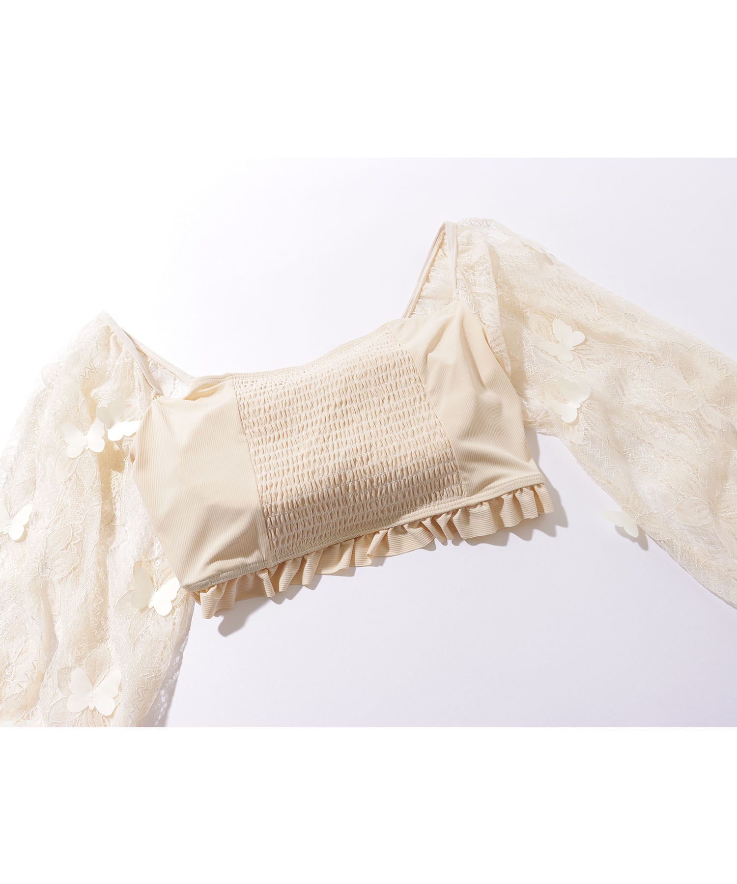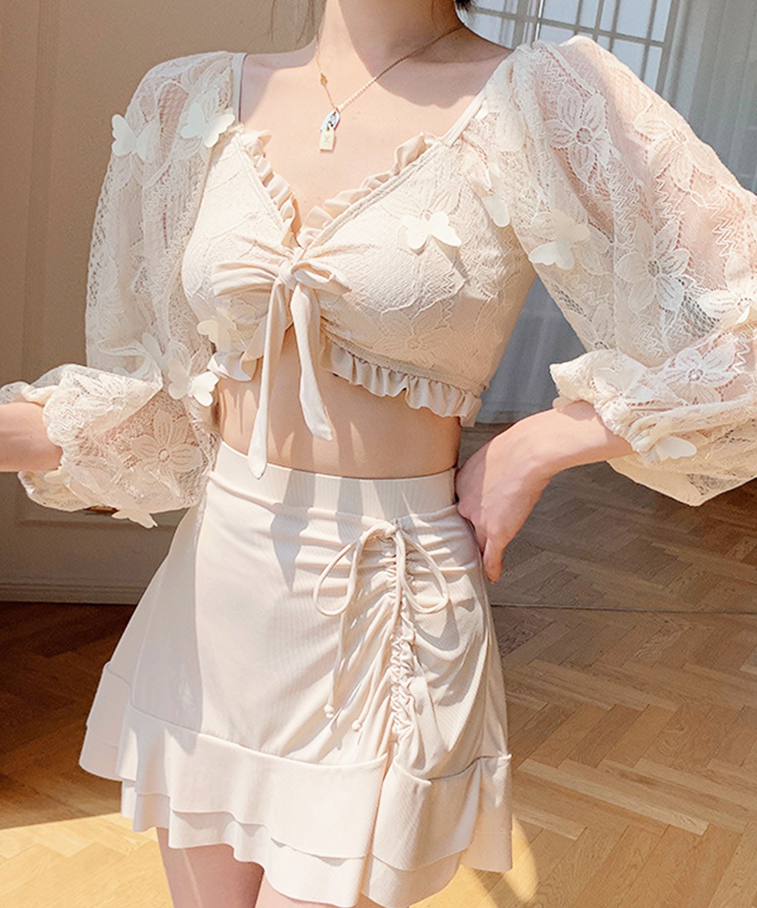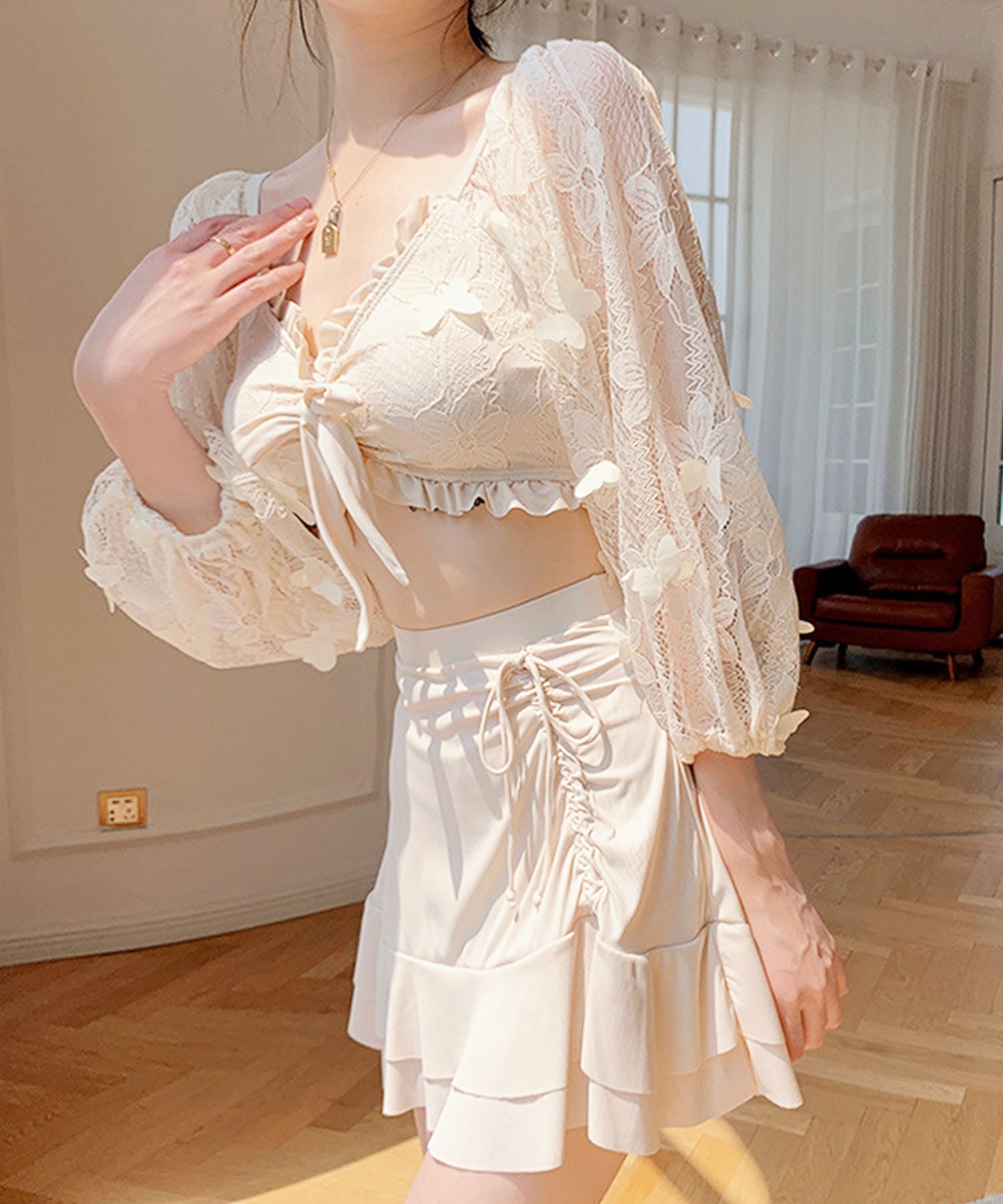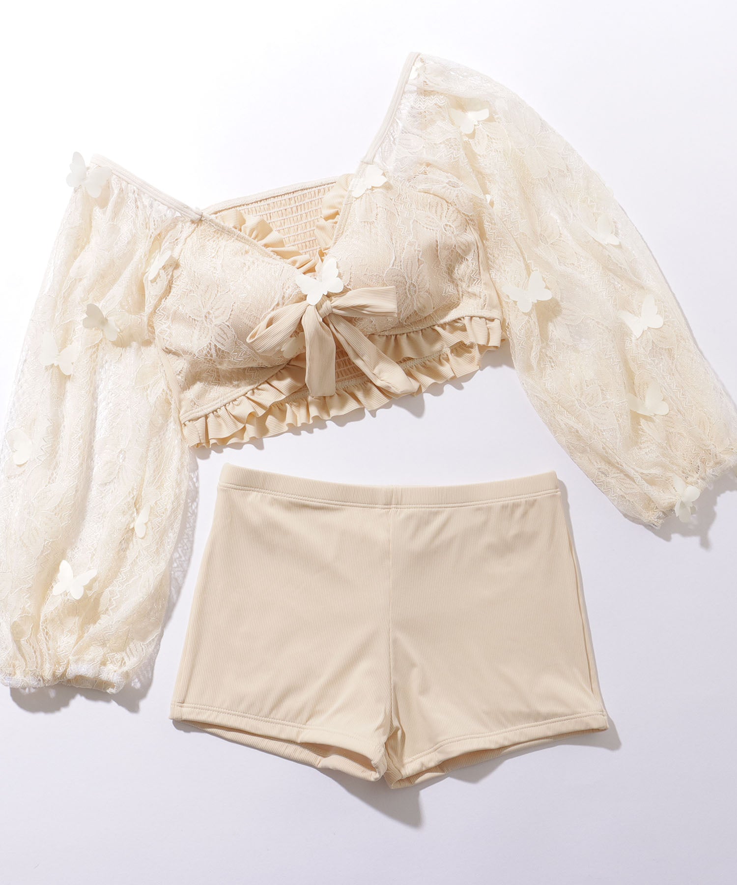【3点セット】 レース袖 リボン ビキニ スイムウエア