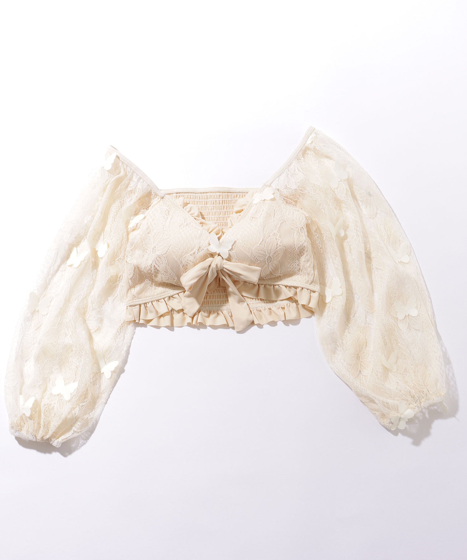 やわらかに素肌の透ける編み立てにバタフライモチーフを散りばめたフェアリーなスリーブラインは、羽のような軽やかさを演出するフレアスカートとも相性抜群◎