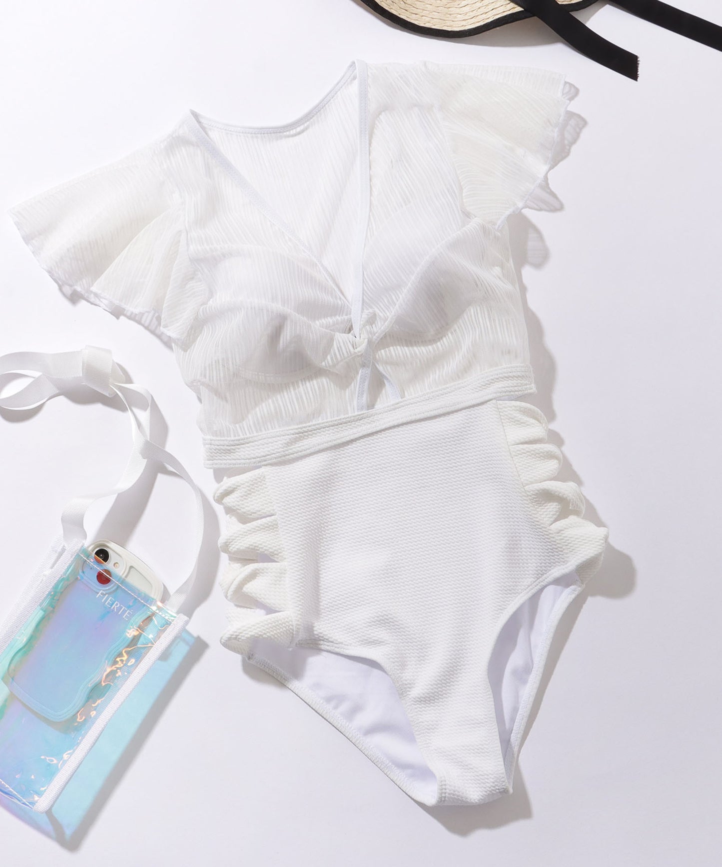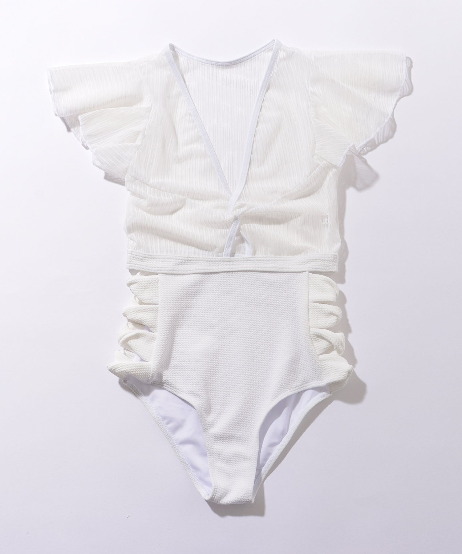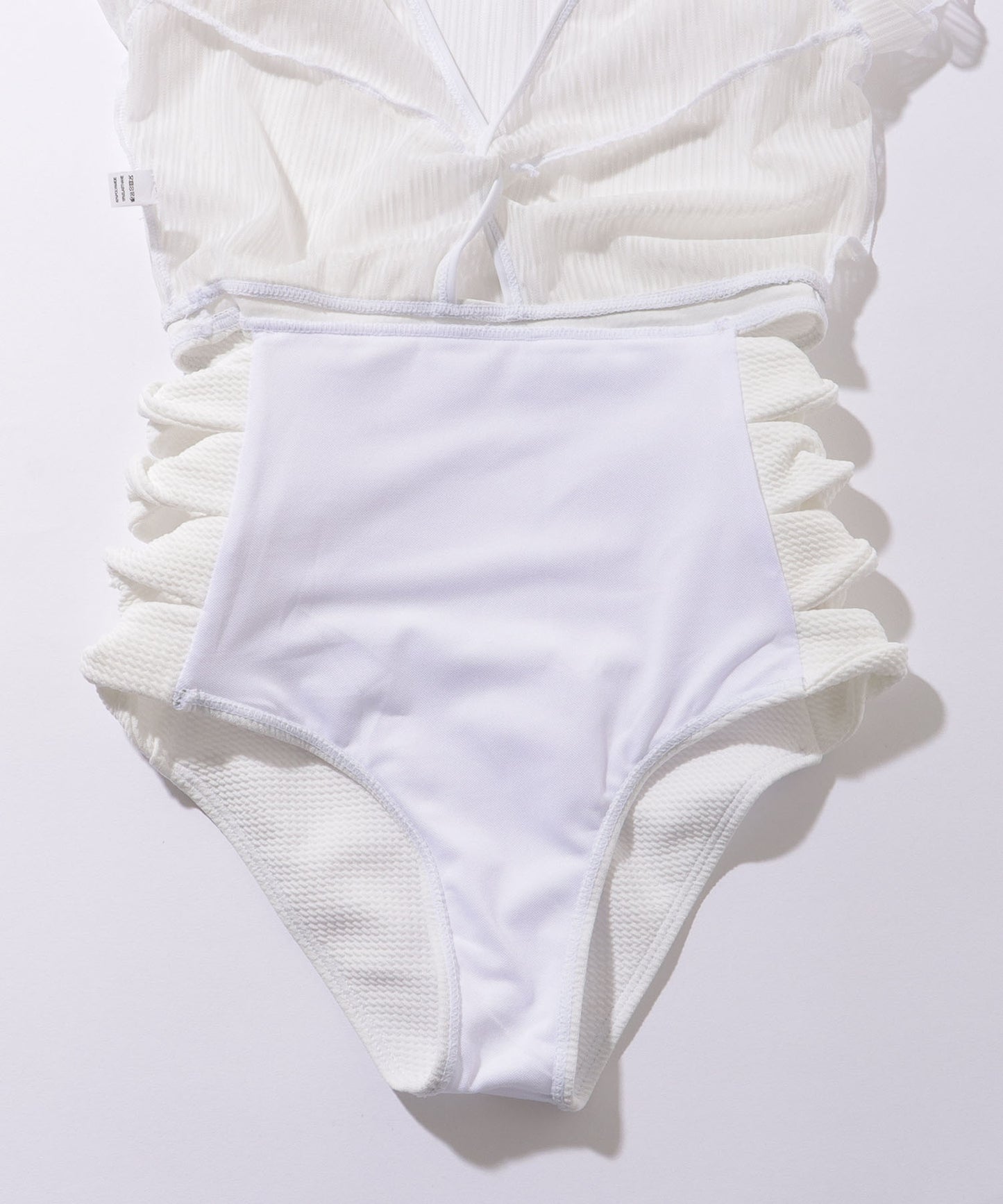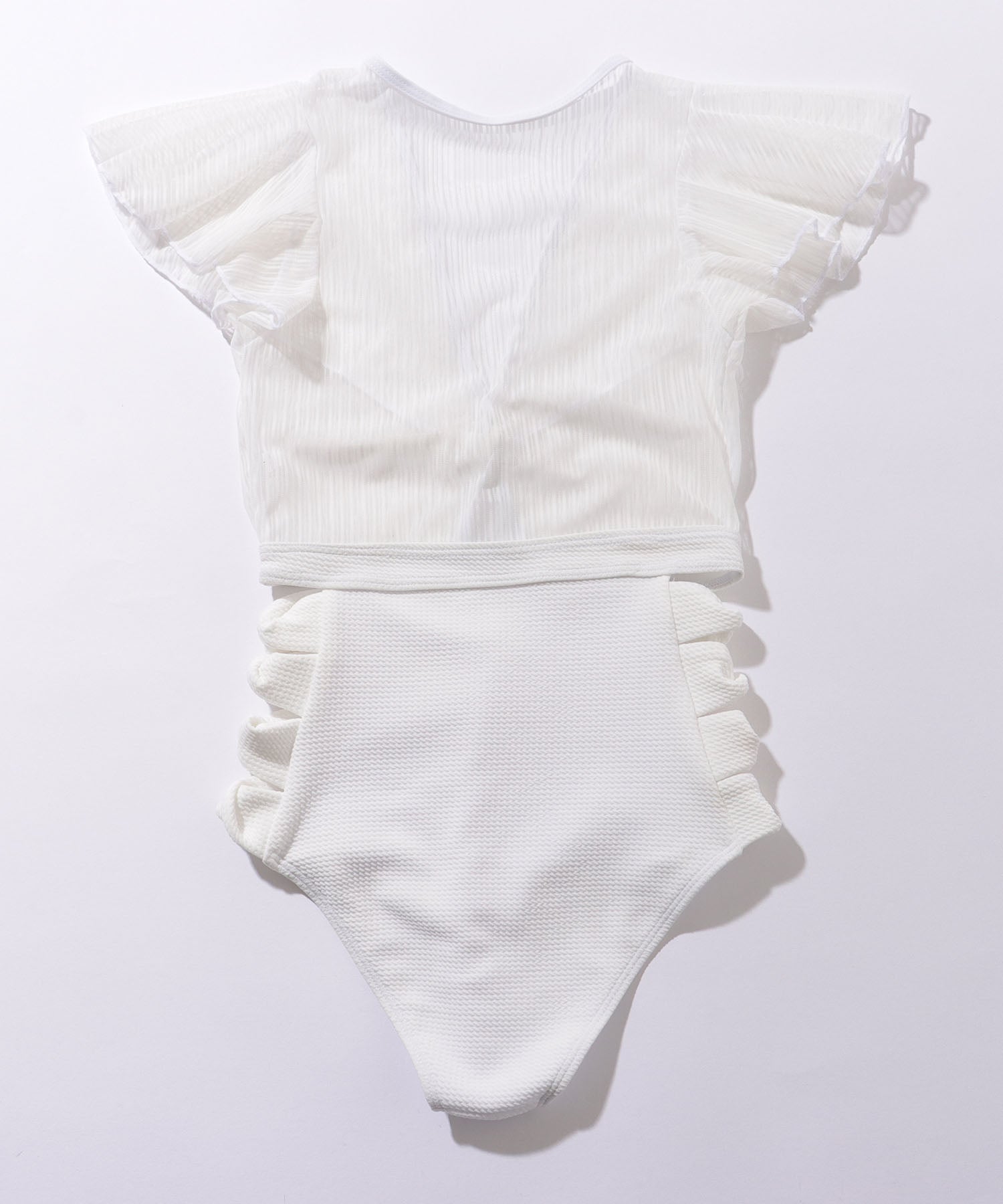 シアー素材とのドッキングデザインで、まるで羽をまとったかのようなデザイン水着。