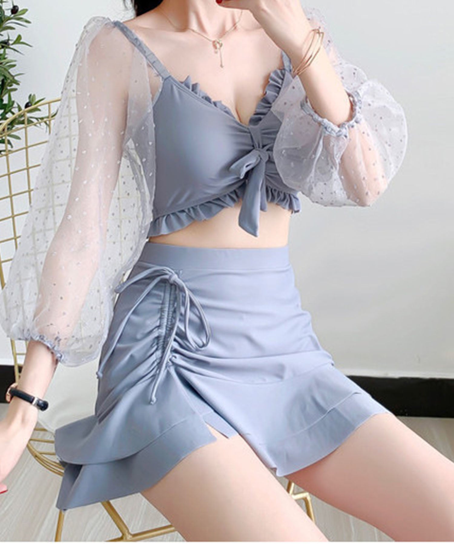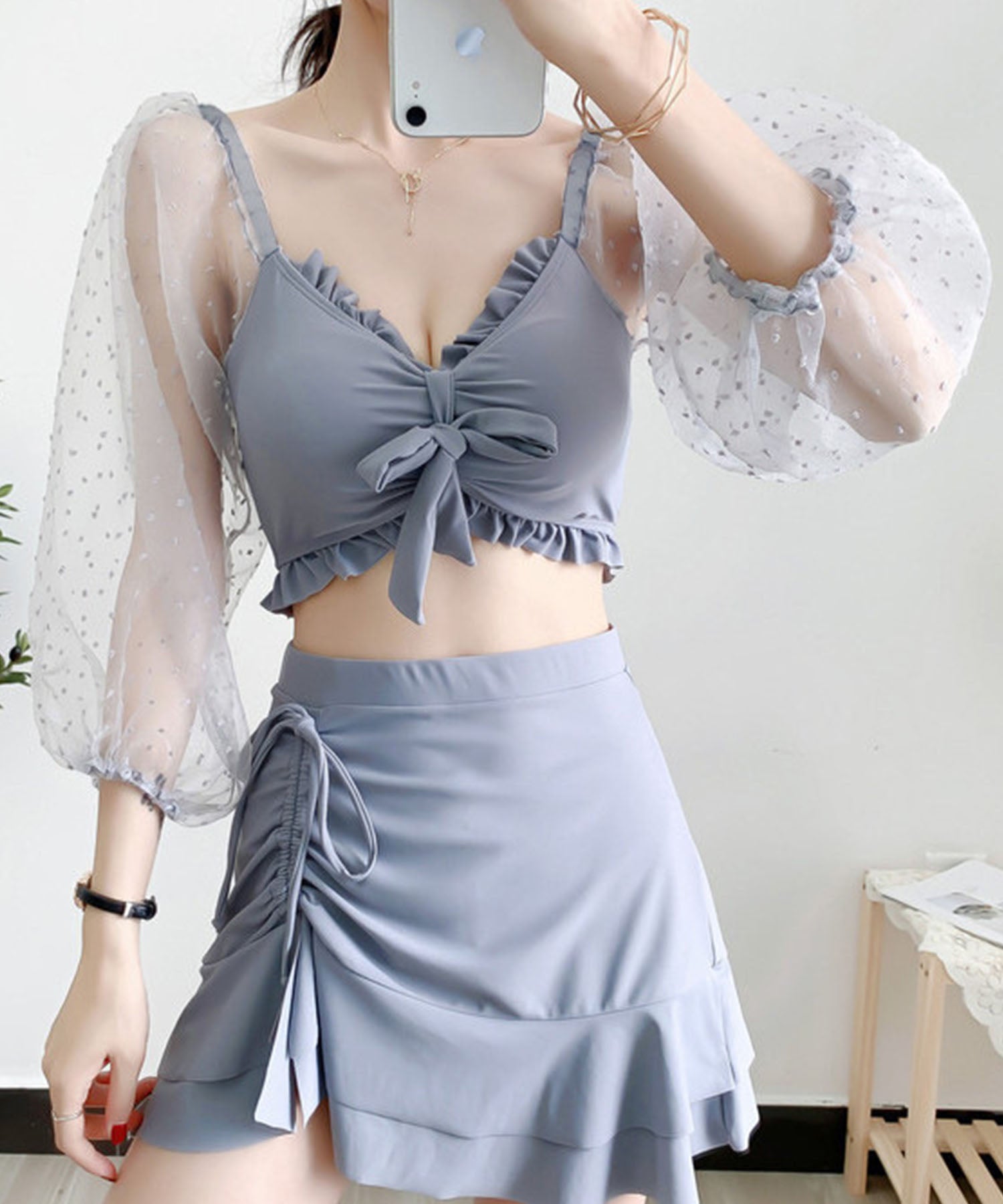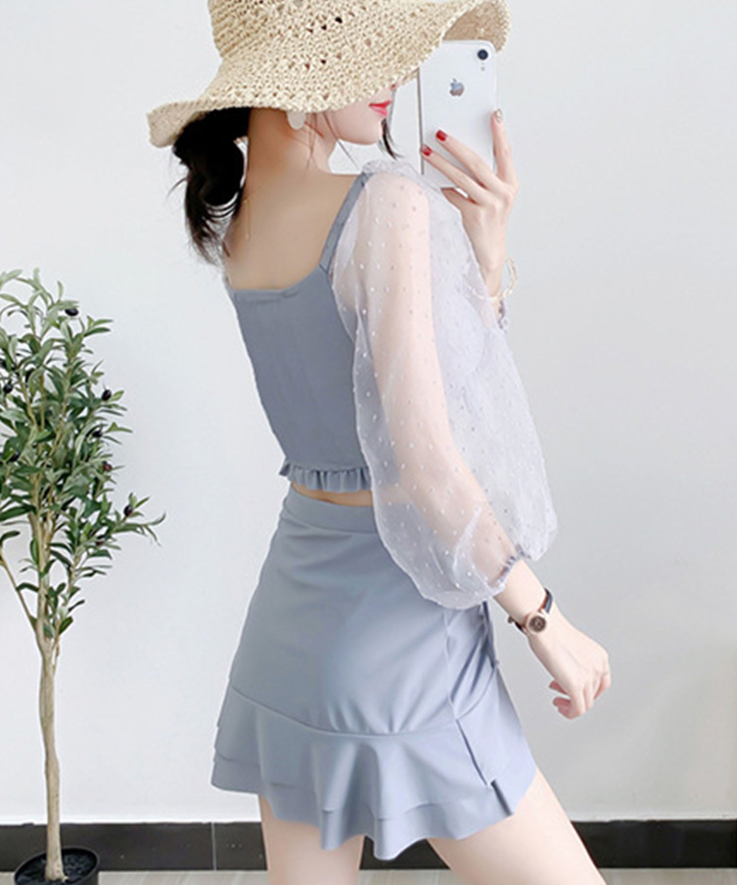カバー面積多めでお洋服感覚で着ることができるアイテムでありながらも、透け感でフェミニンな印象に仕上がるのが魅力的。