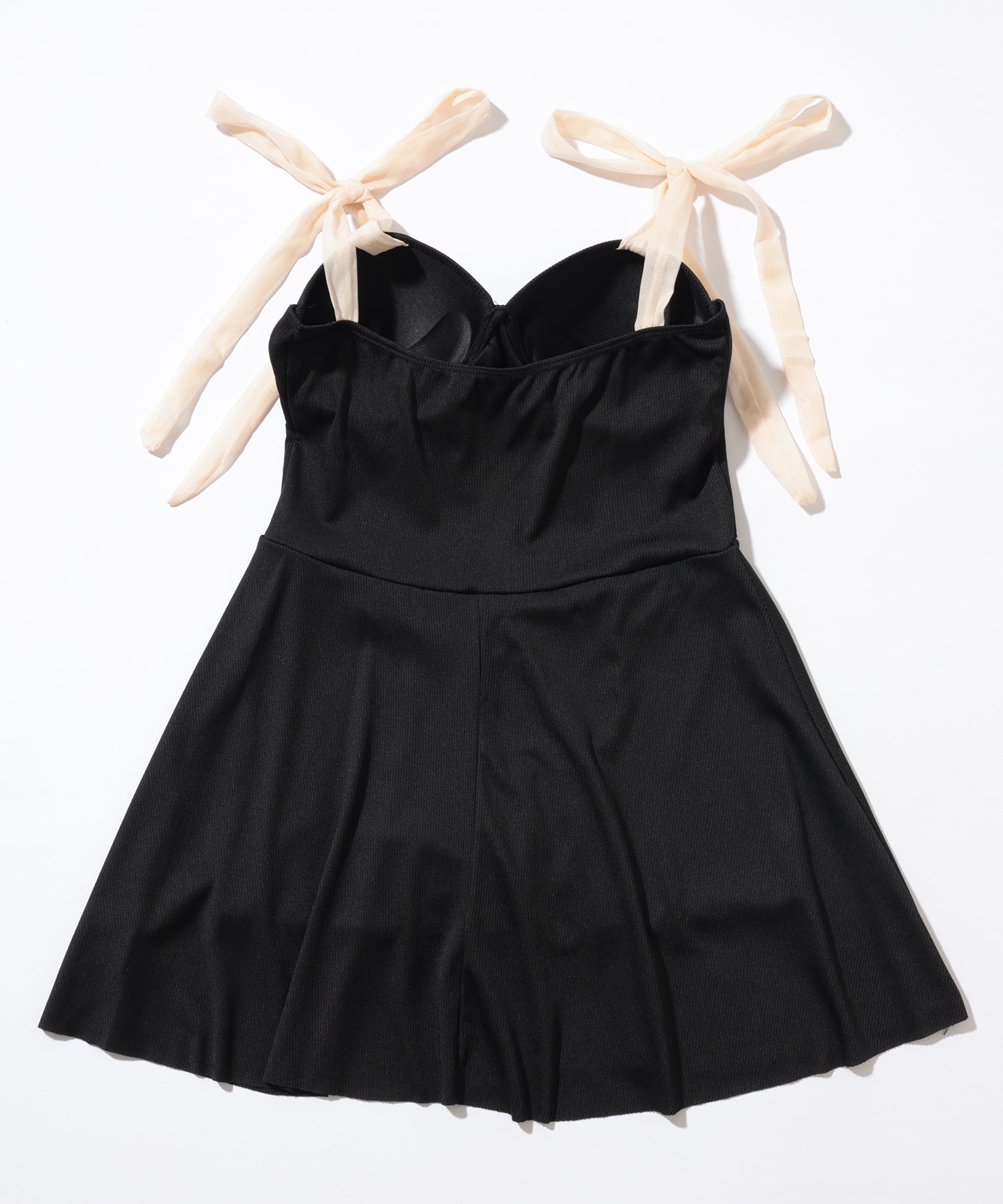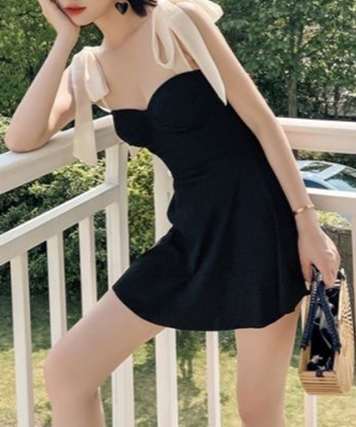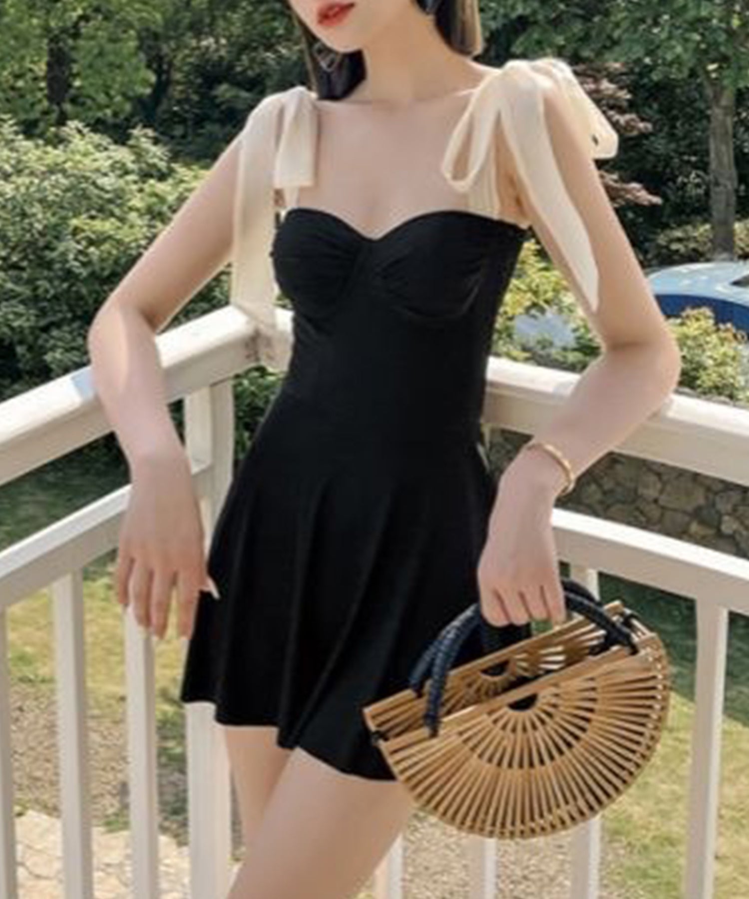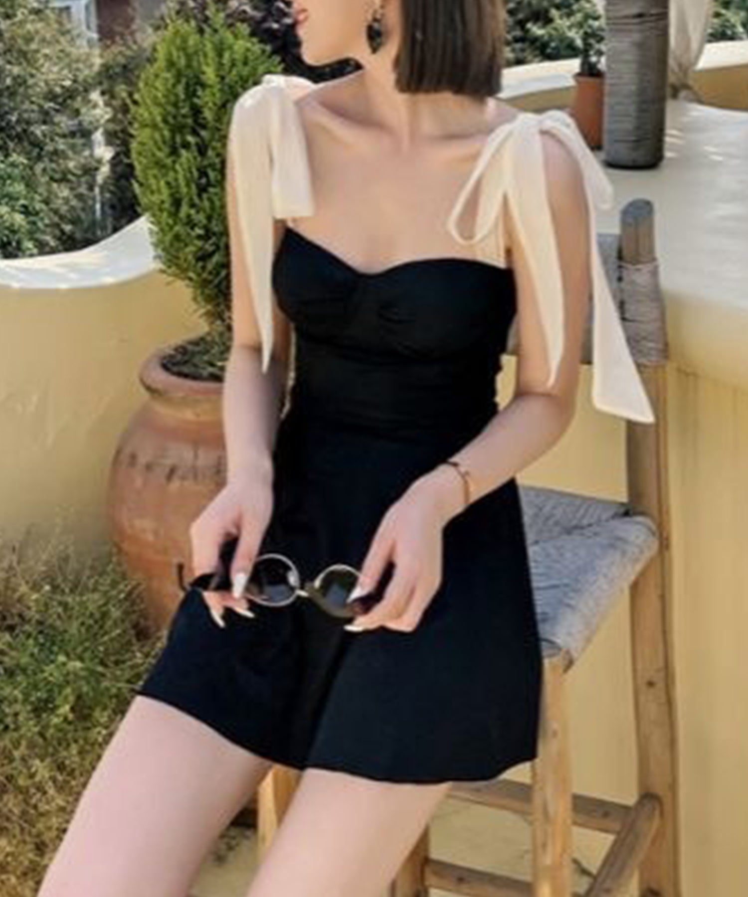 コントラストの効いたリボンショルダーが可愛らしく、シンプルなデザインのアクセントになっています。