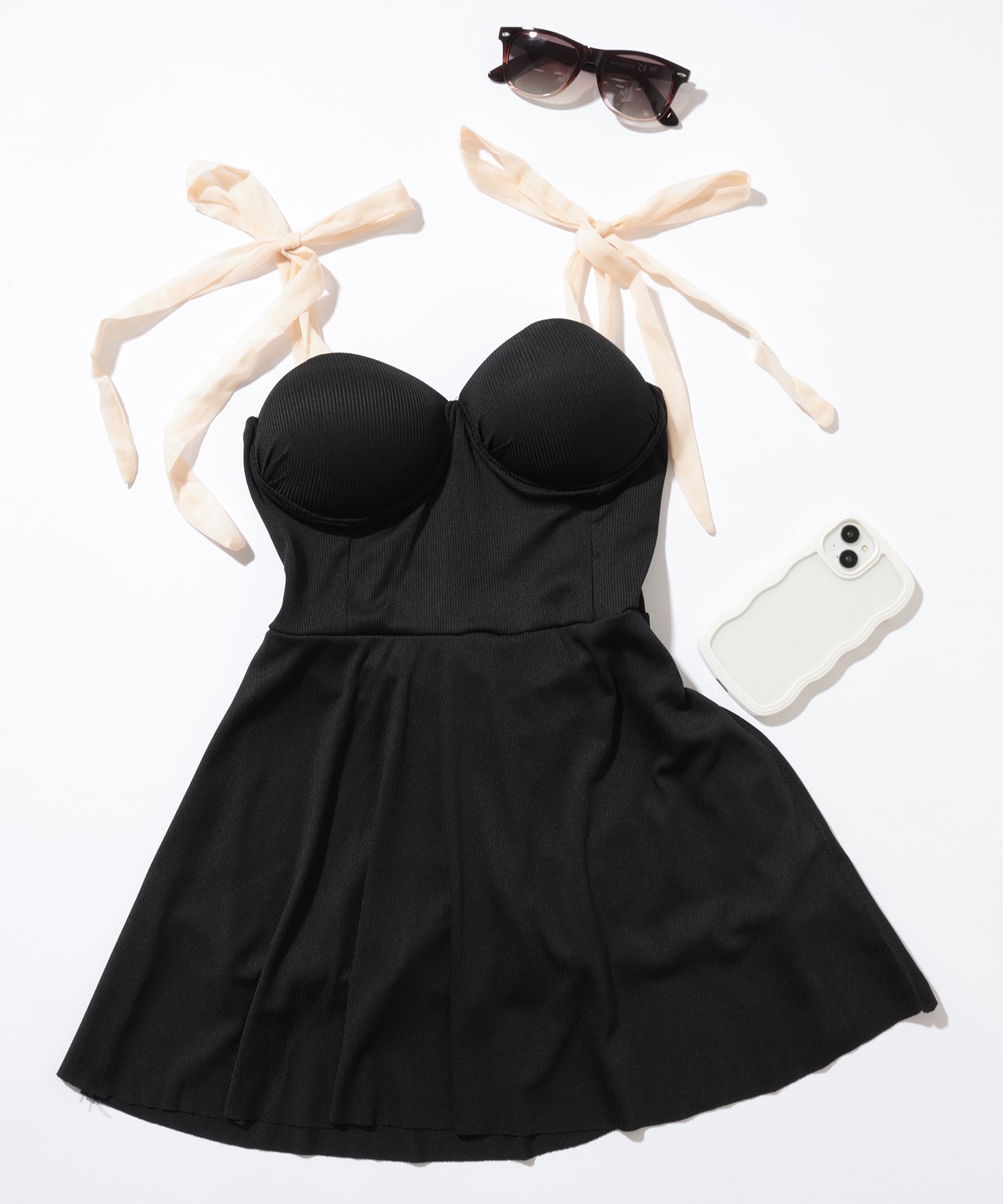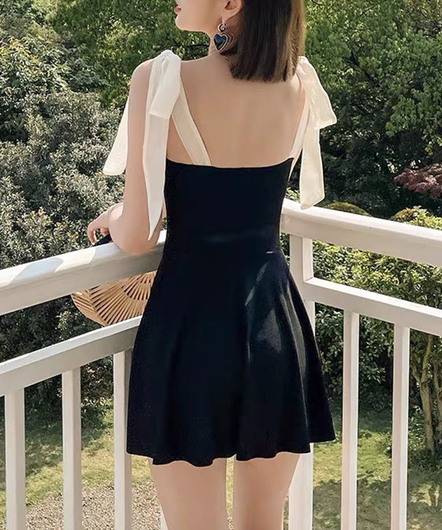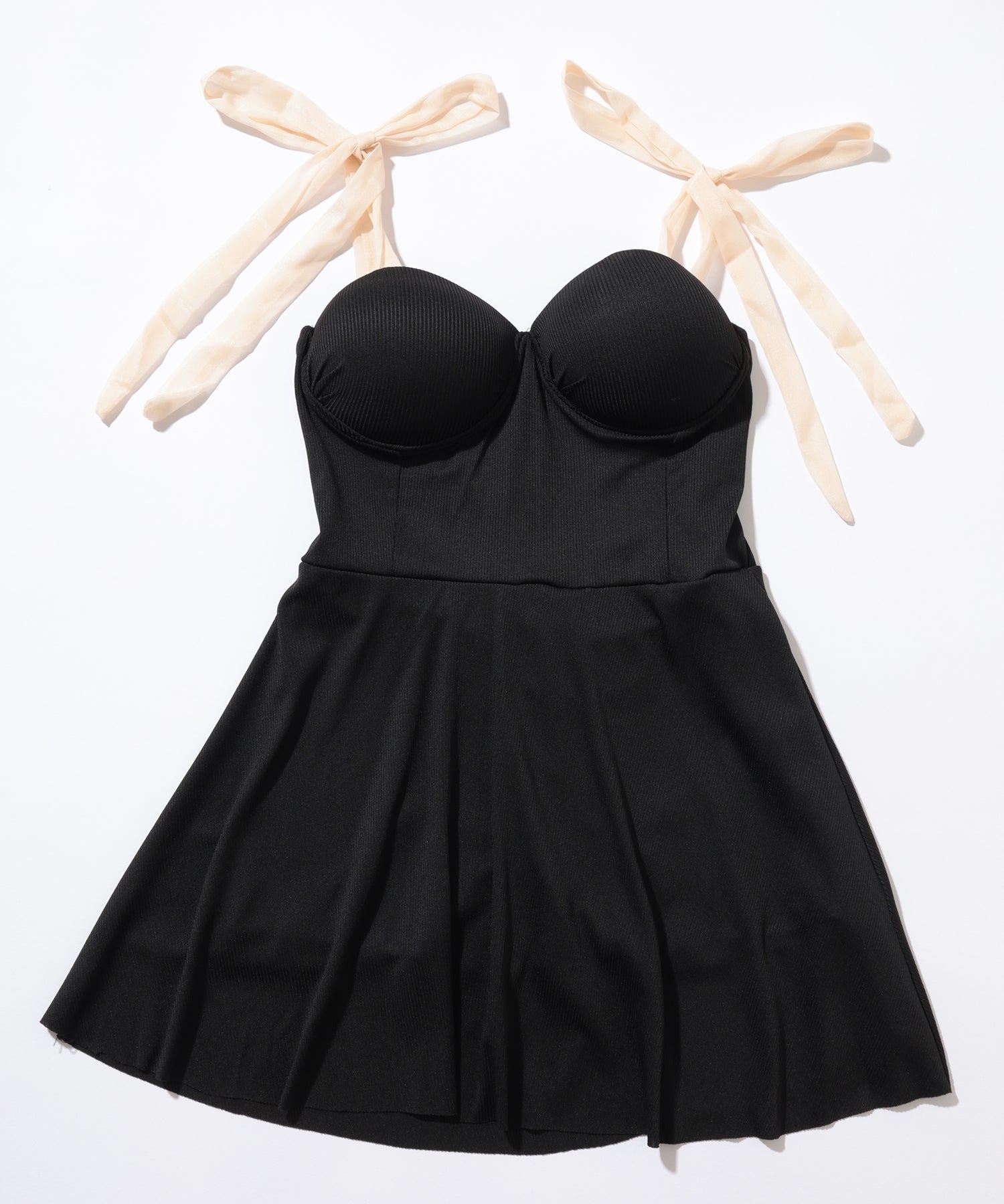 コントラストの効いたリボンショルダーが可愛らしく、シンプルなデザインのアクセントになっています。