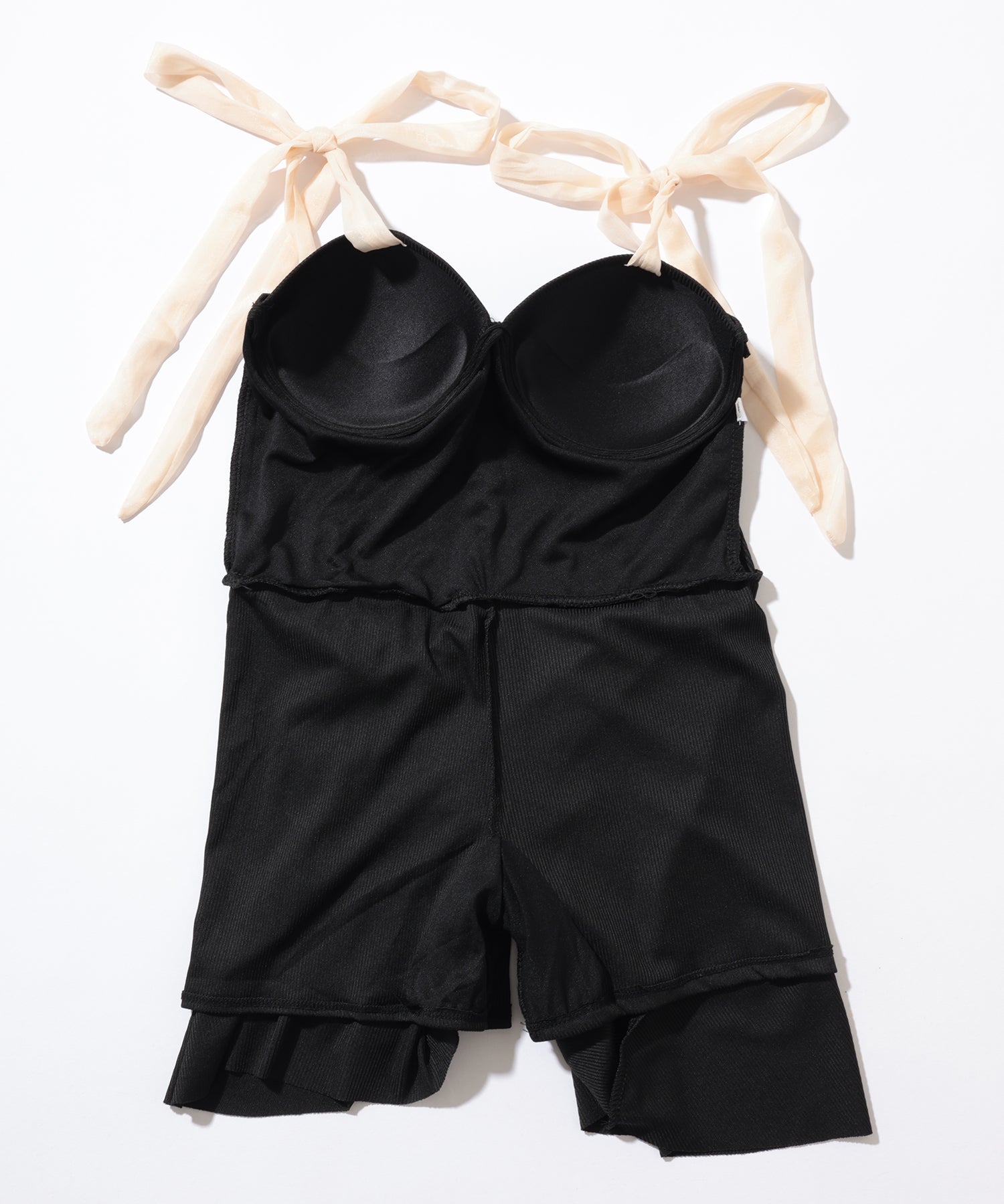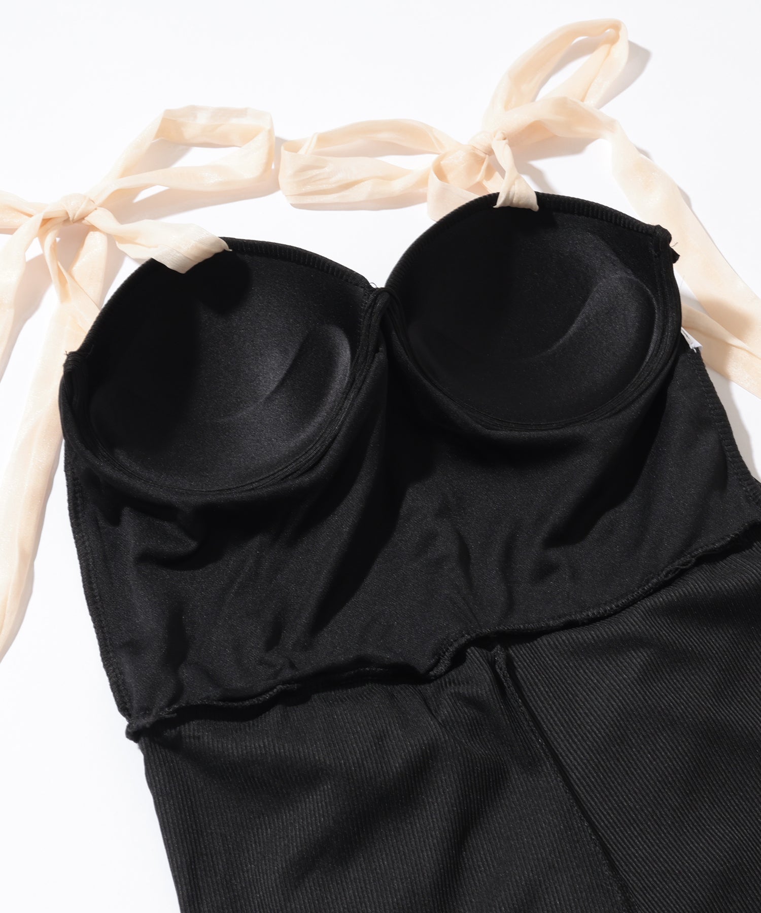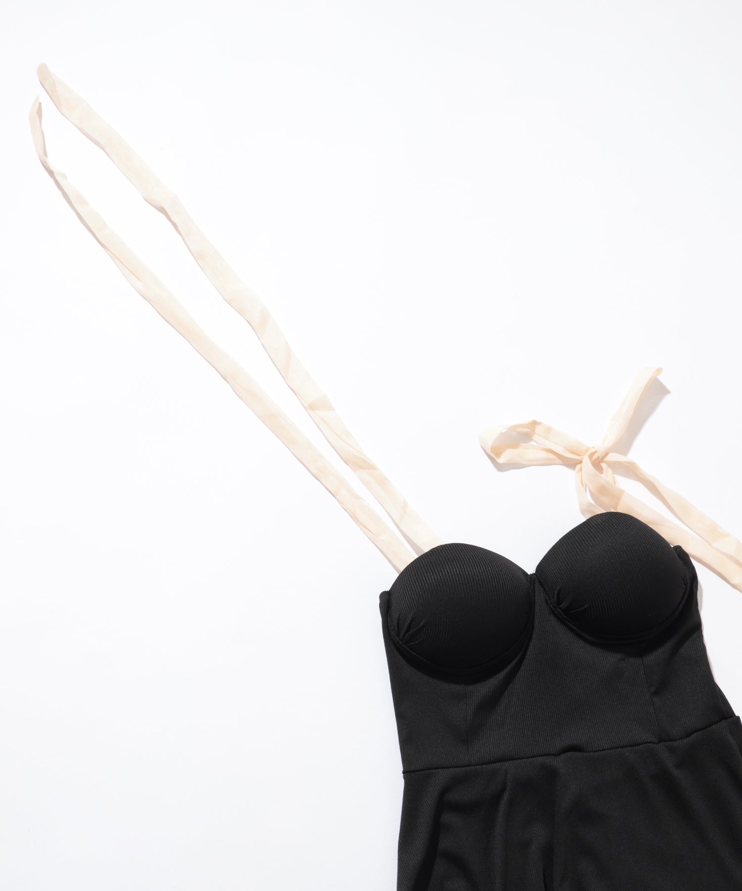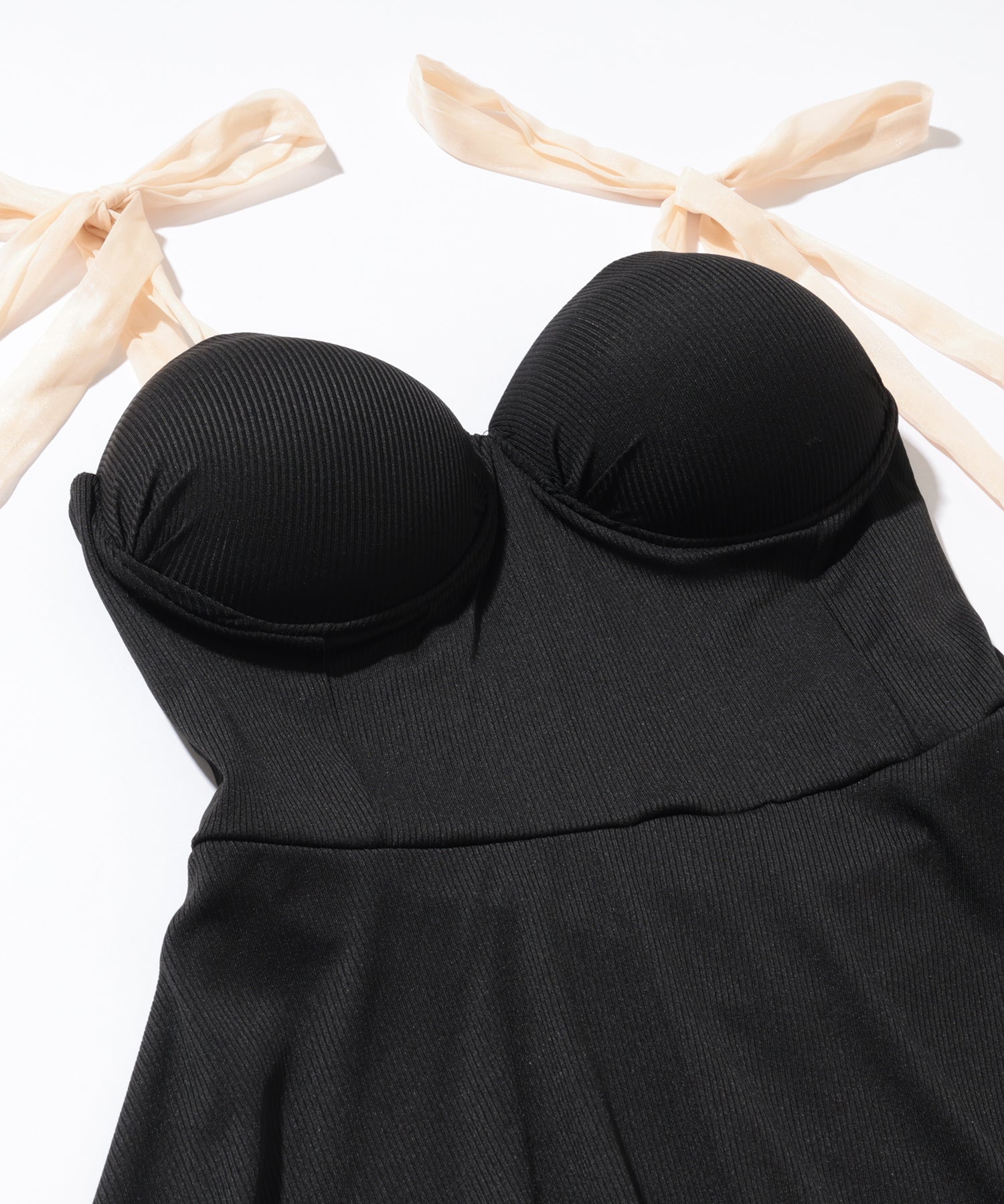 コントラストの効いたリボンショルダーが可愛らしく、シンプルなデザインのアクセントになっています。