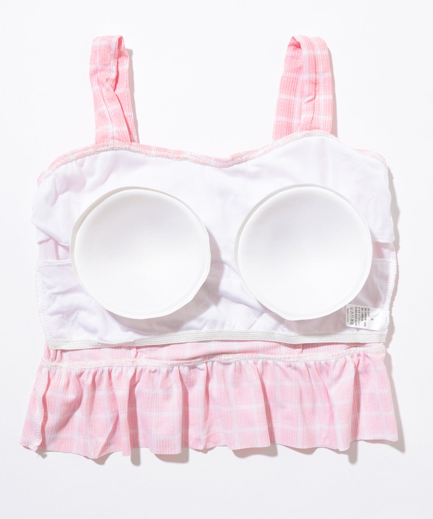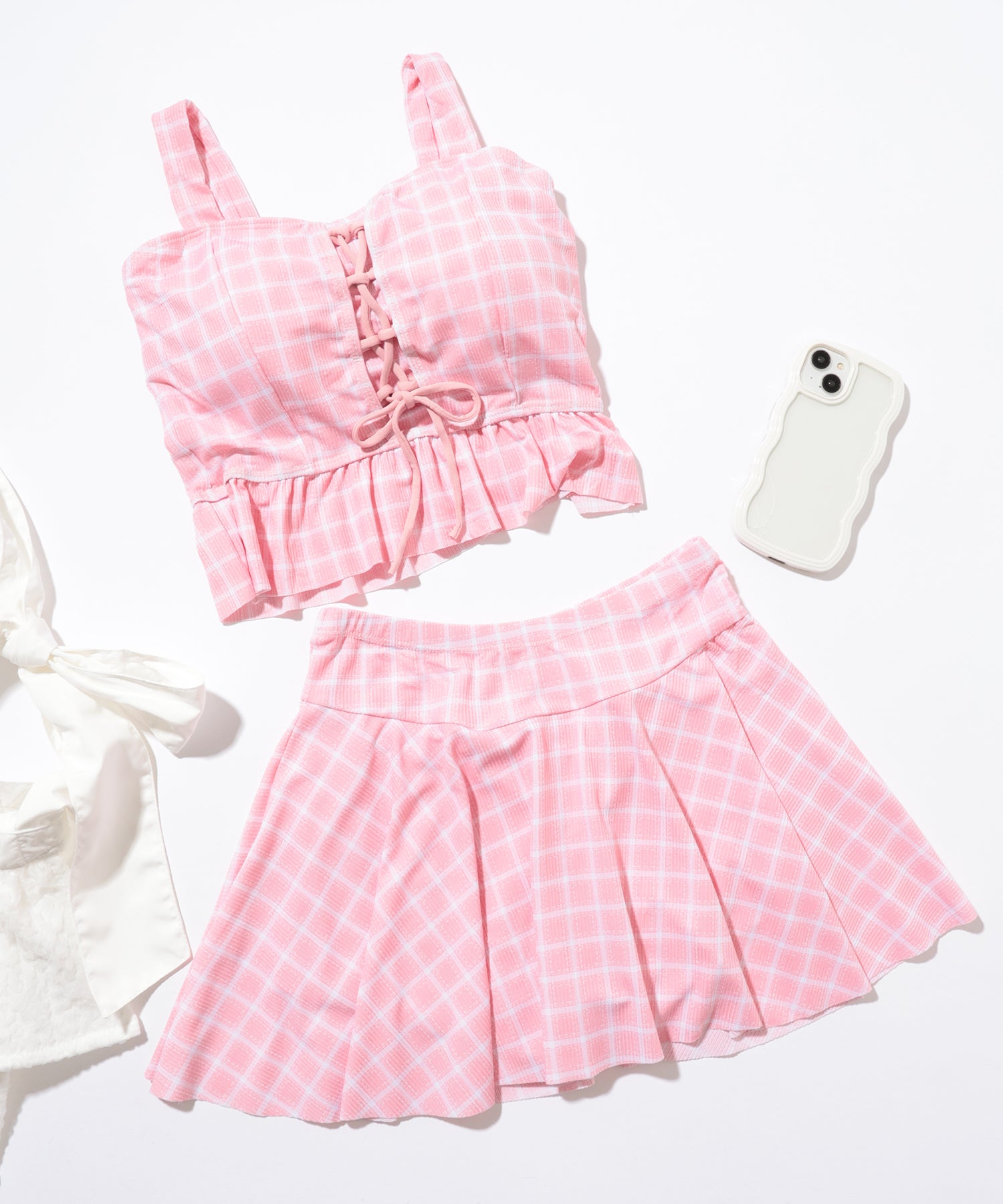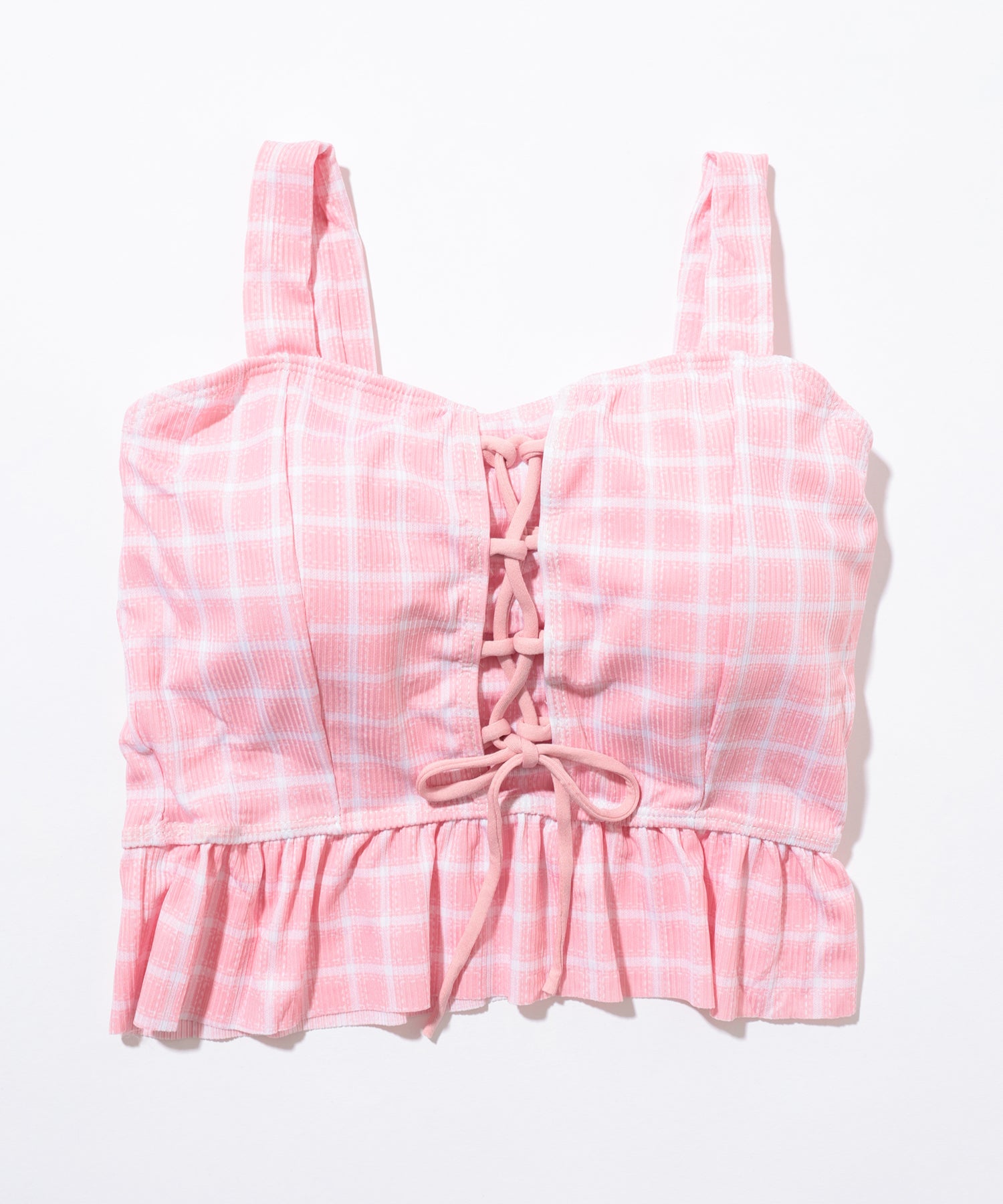 【2点セット】ビスチェ風 フリル レースアップ チェック柄 水着