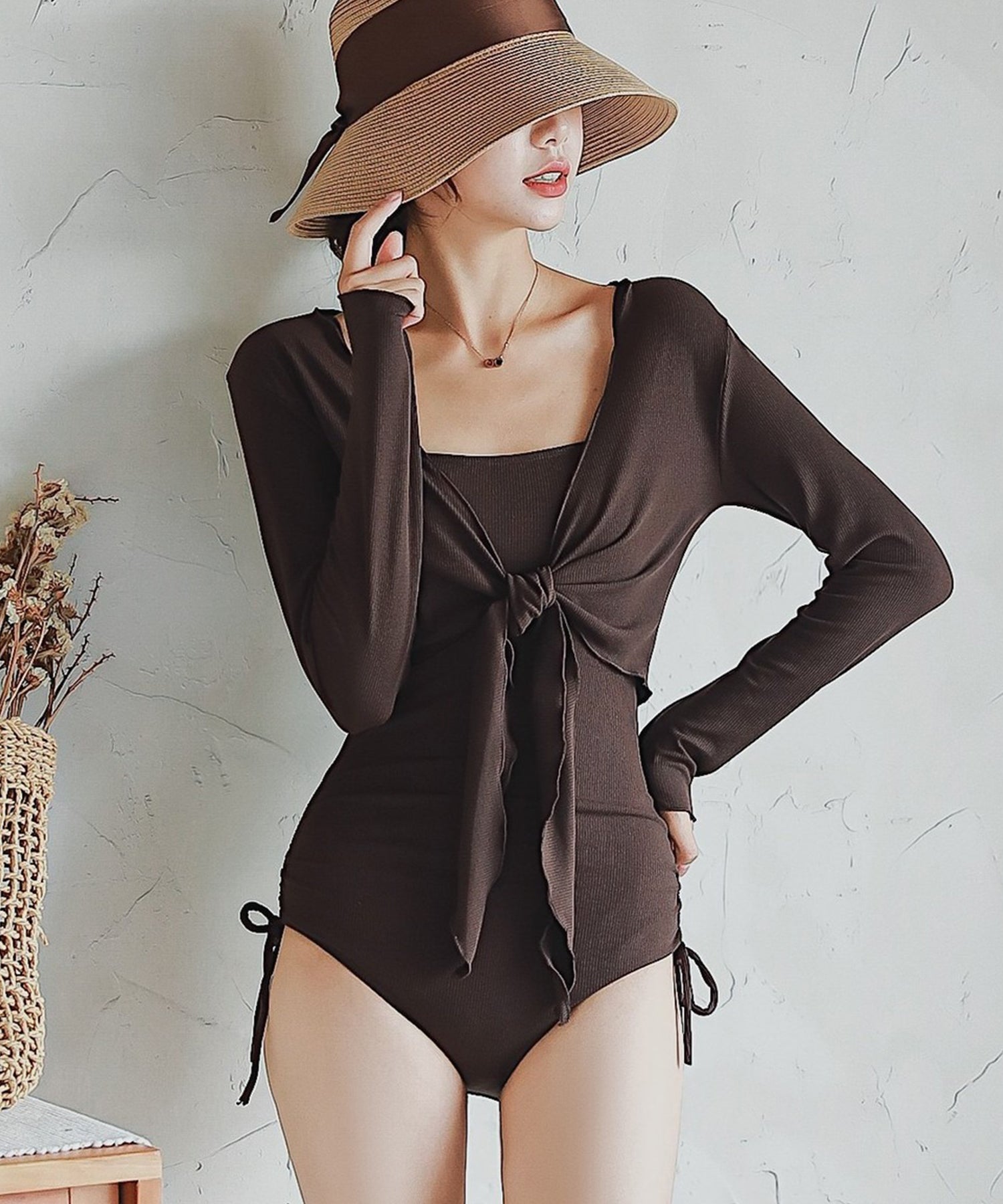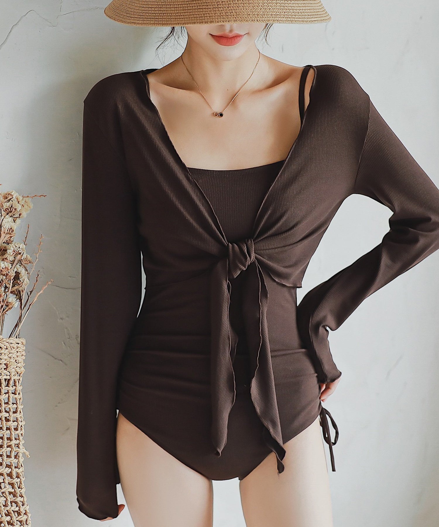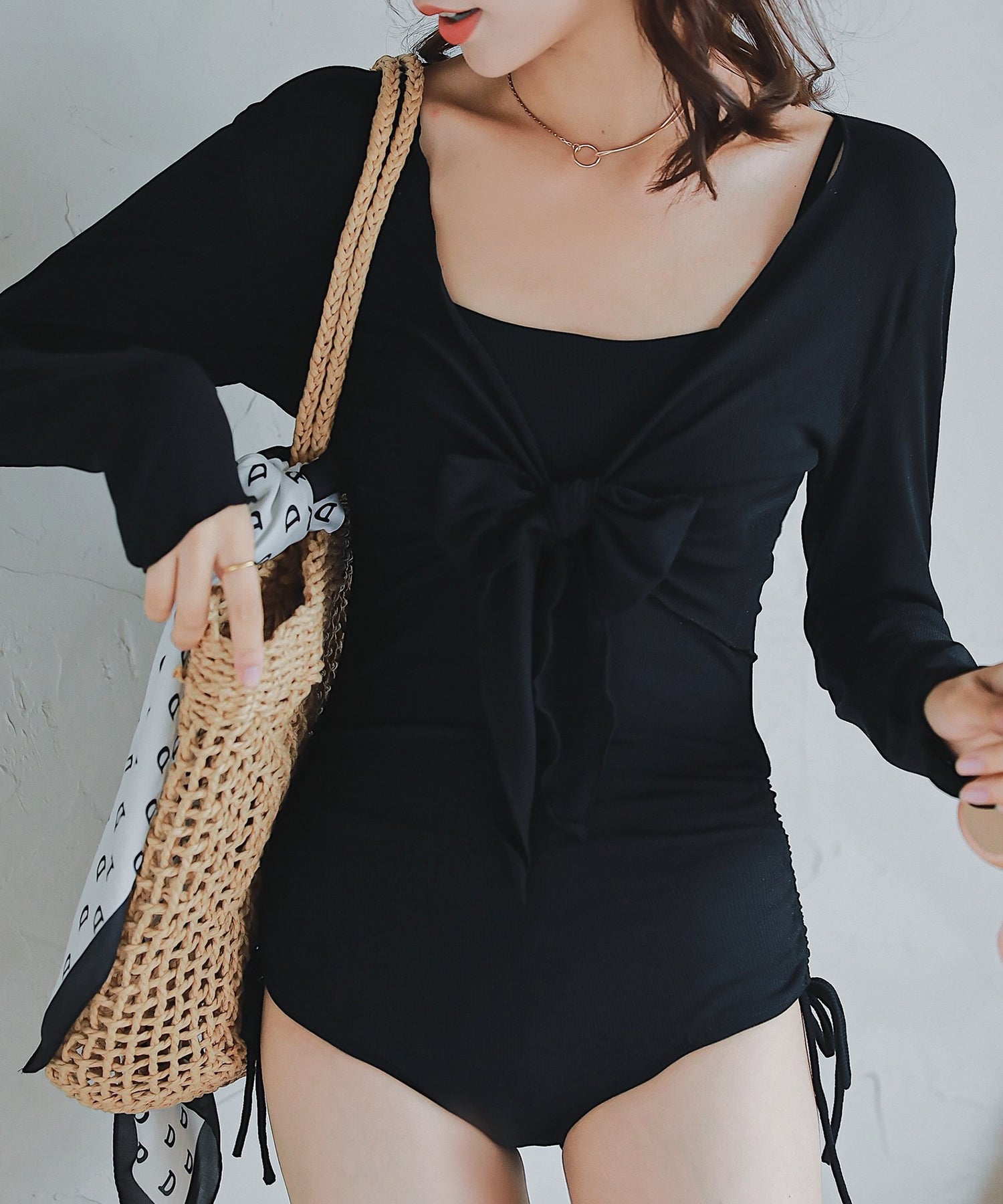 ボレロタイプのカバーアップを重ねれば日焼け予防になるのはもちろん、重心がグッと上がりスタイルアップが叶います。