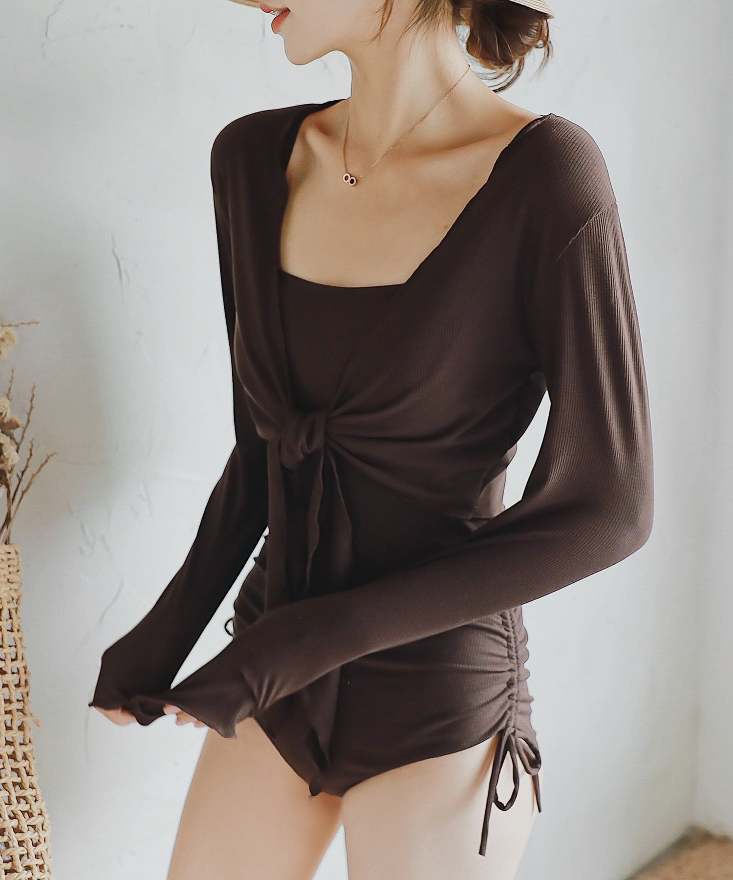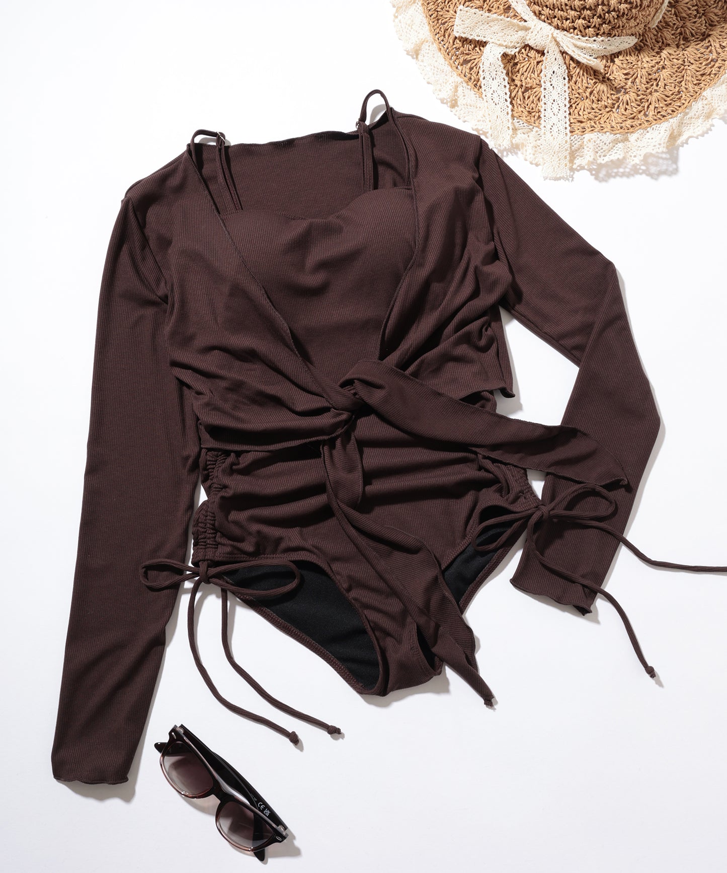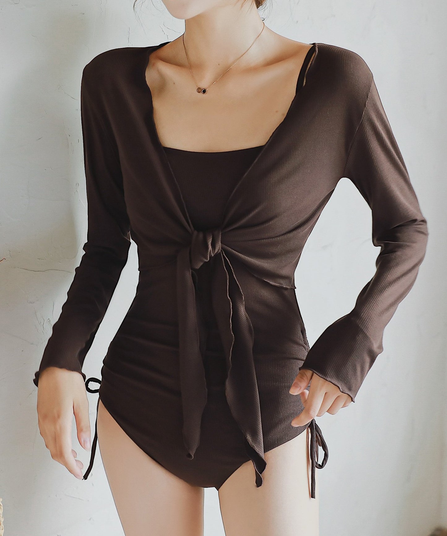 ボレロタイプのカバーアップを重ねれば日焼け予防になるのはもちろん、重心がグッと上がりスタイルアップが叶います。