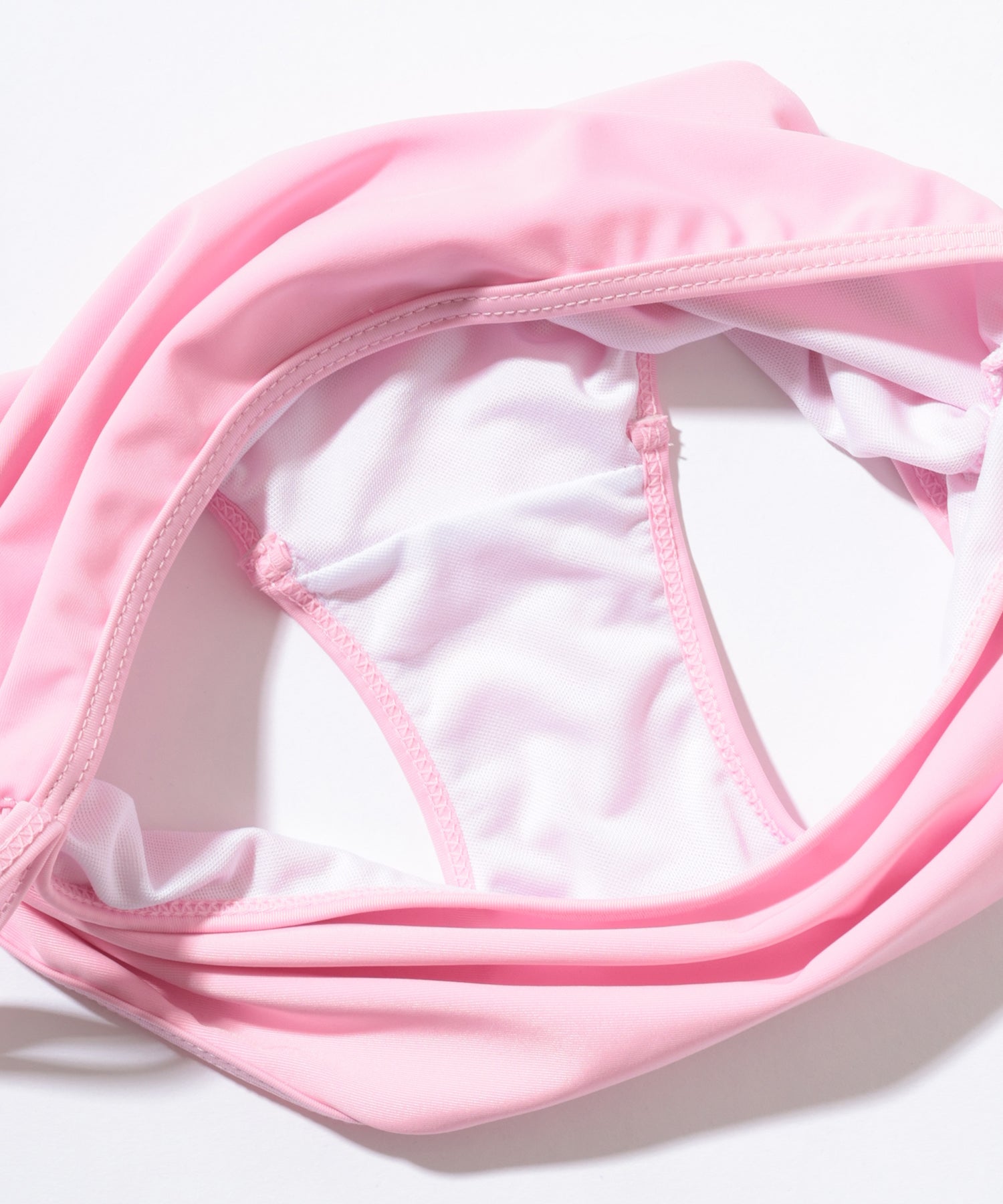 ショーツの穿き口はVカッティングに仕上げることで、ウエストやお腹まわりをスッキリと演出でき、ストラップと相まってスタイルアップ効果にも期待できます。