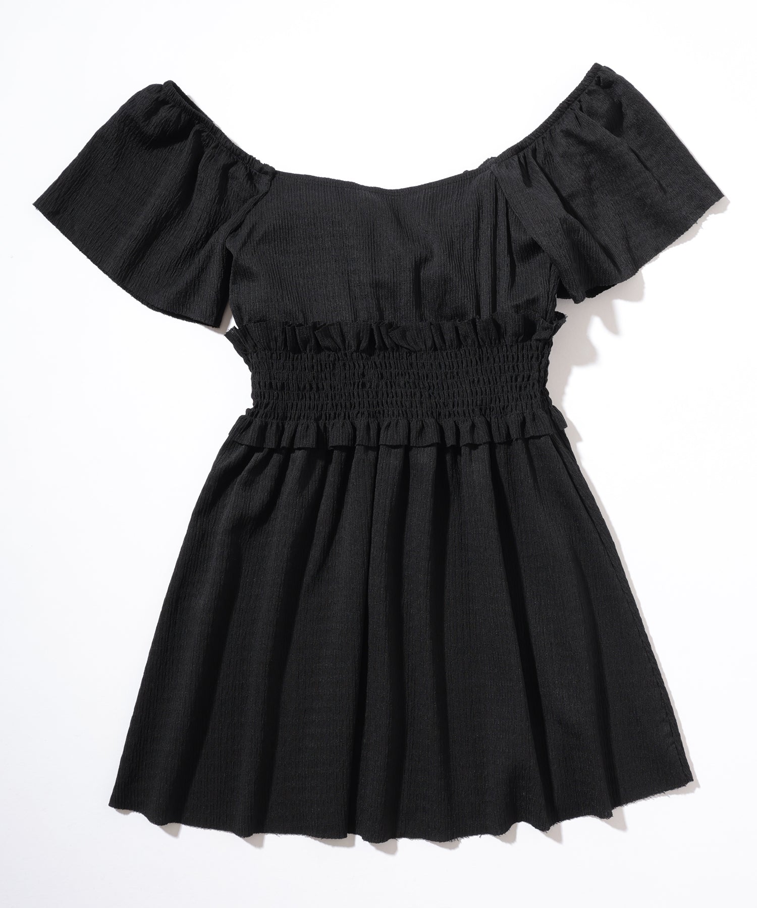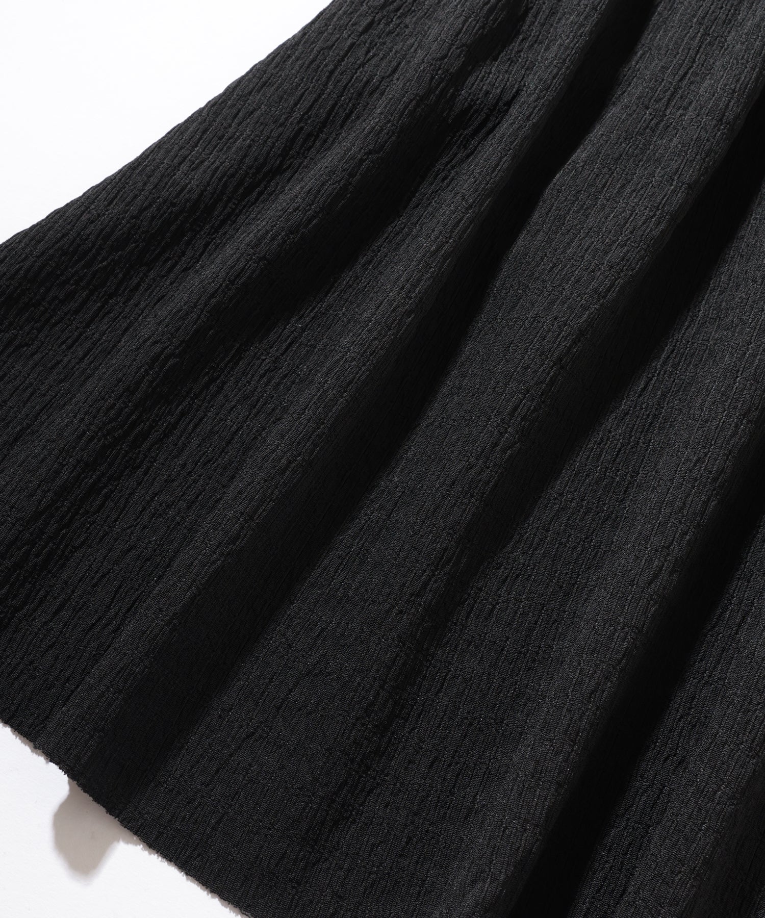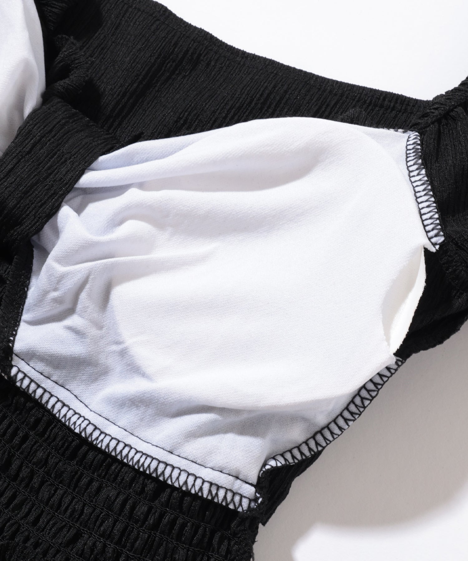 ウエスト部分はシャーリングによって引き締め感があり、自然にくびれを作ってくれるのが嬉しいポイント。