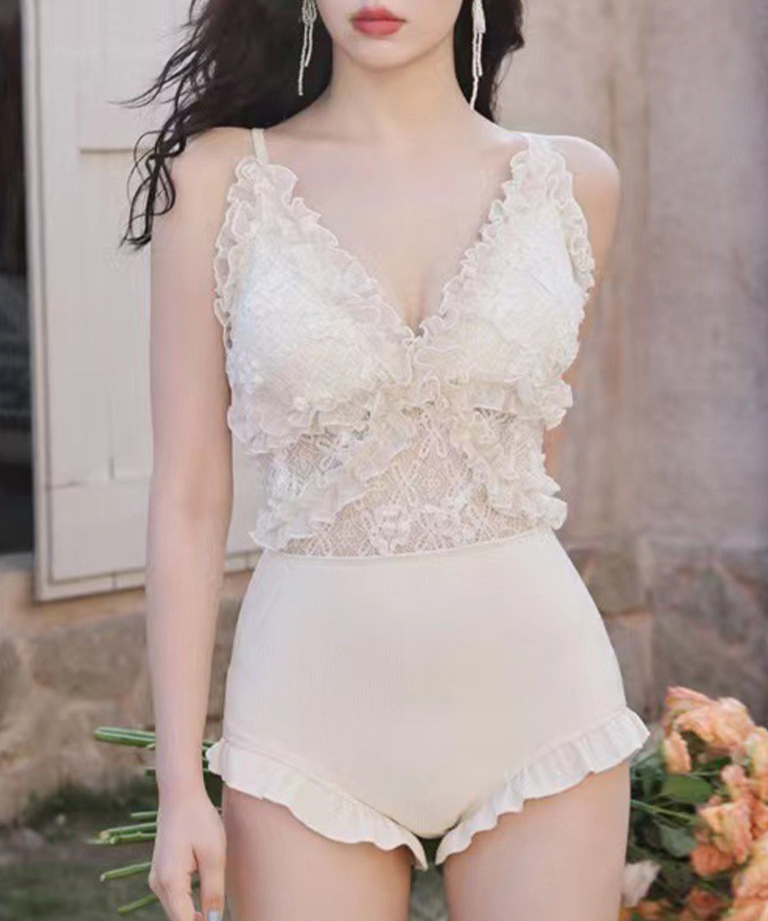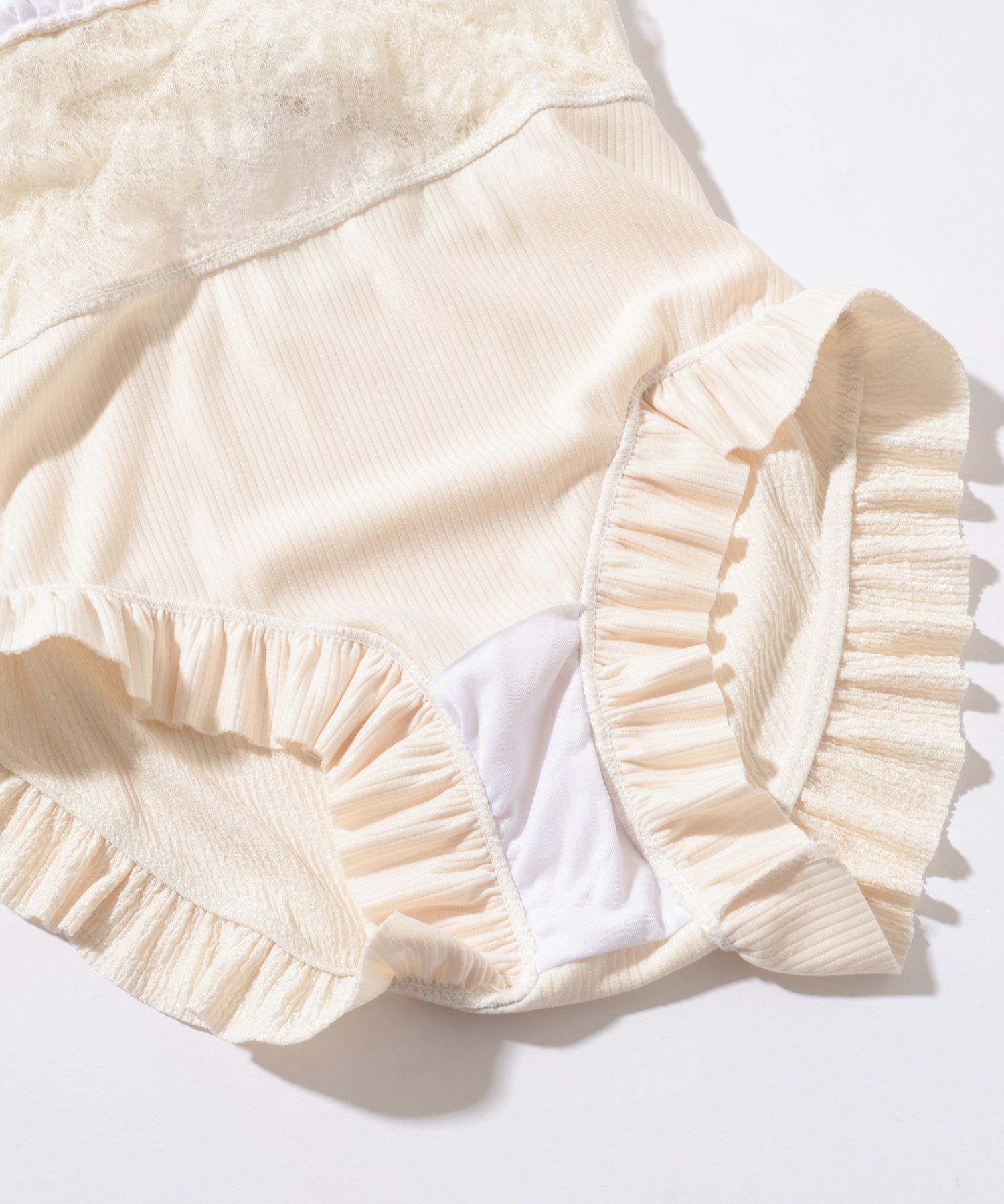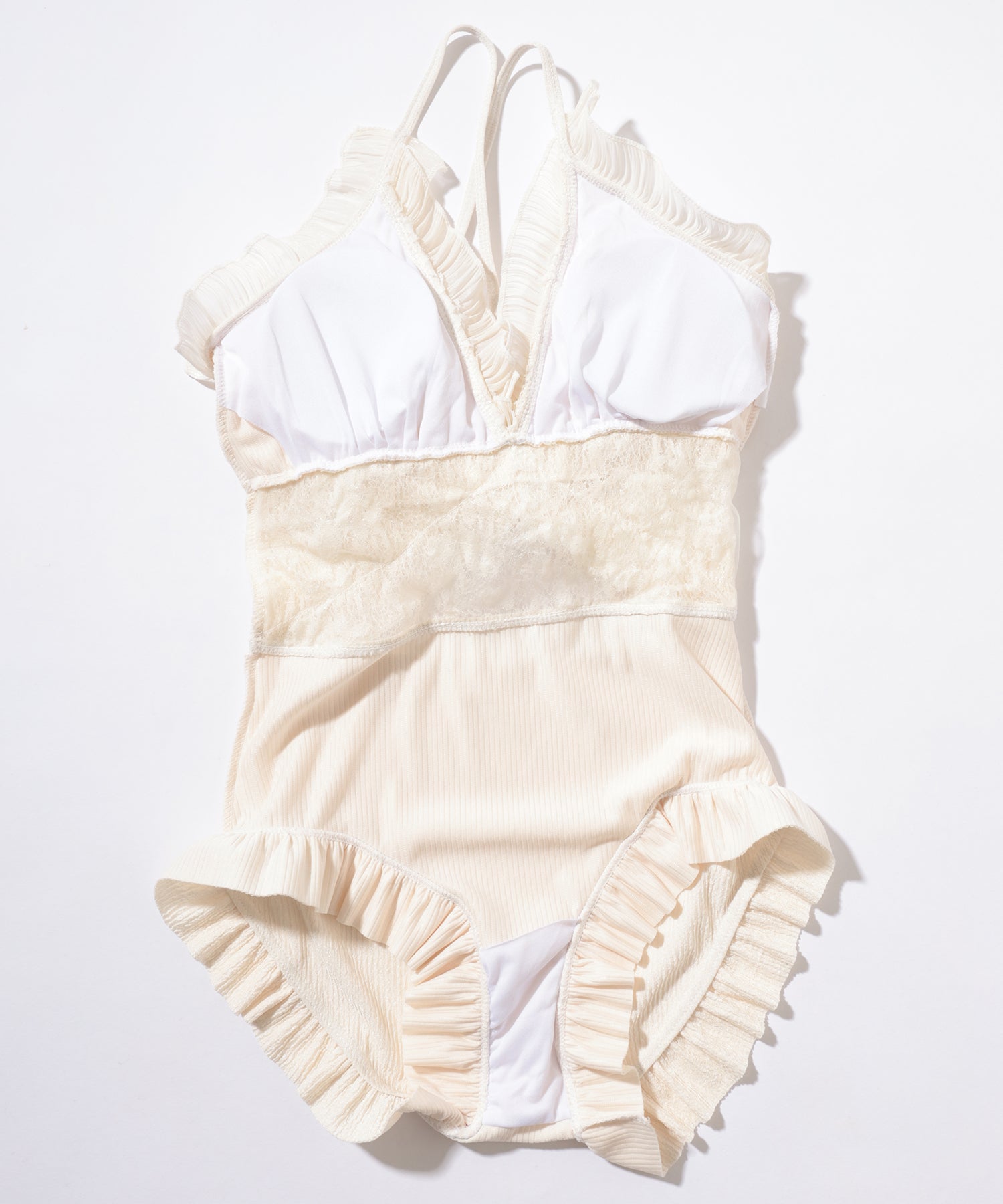 レースとフリルの組み合わせがレディなワンピースタイプの水着。