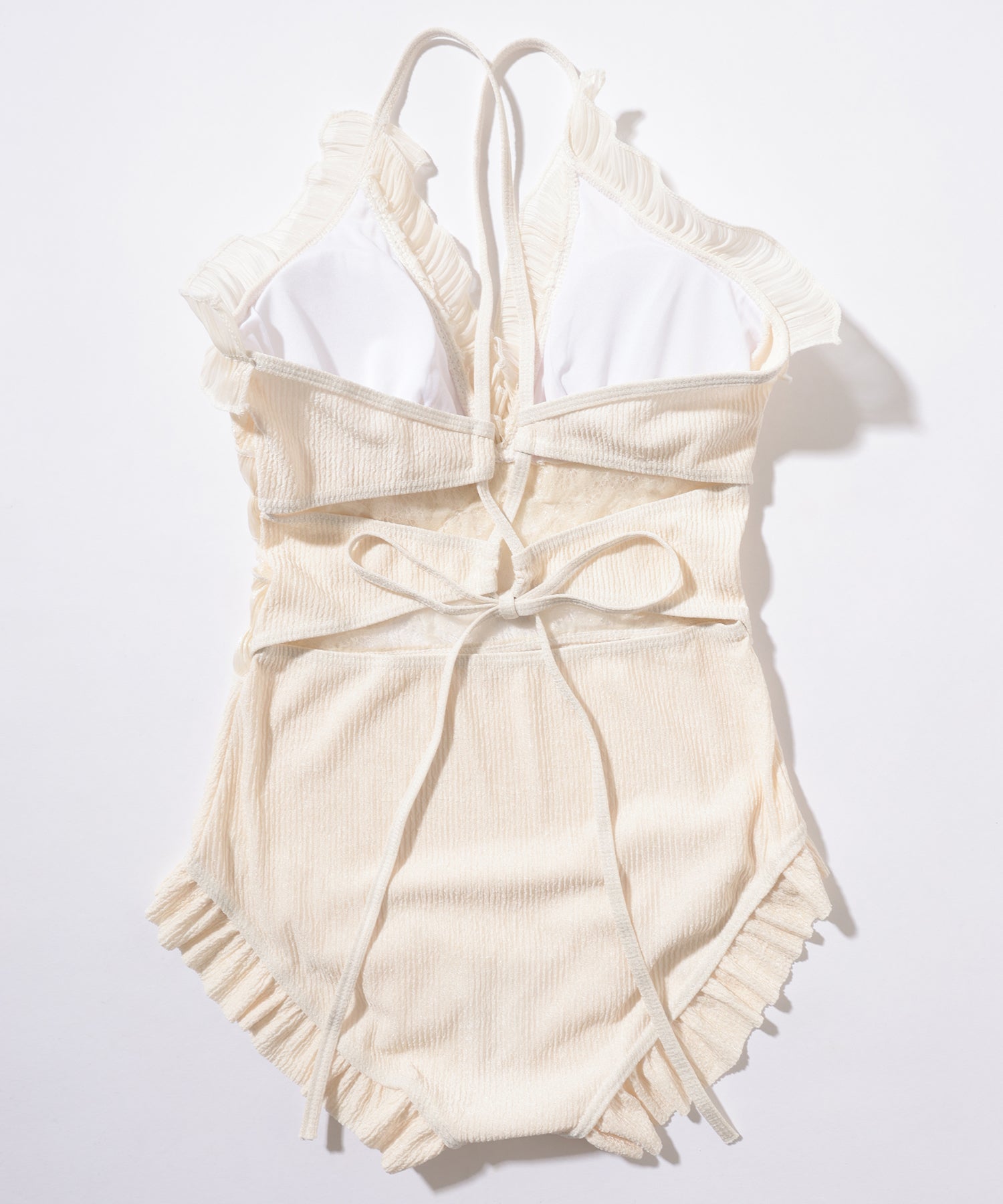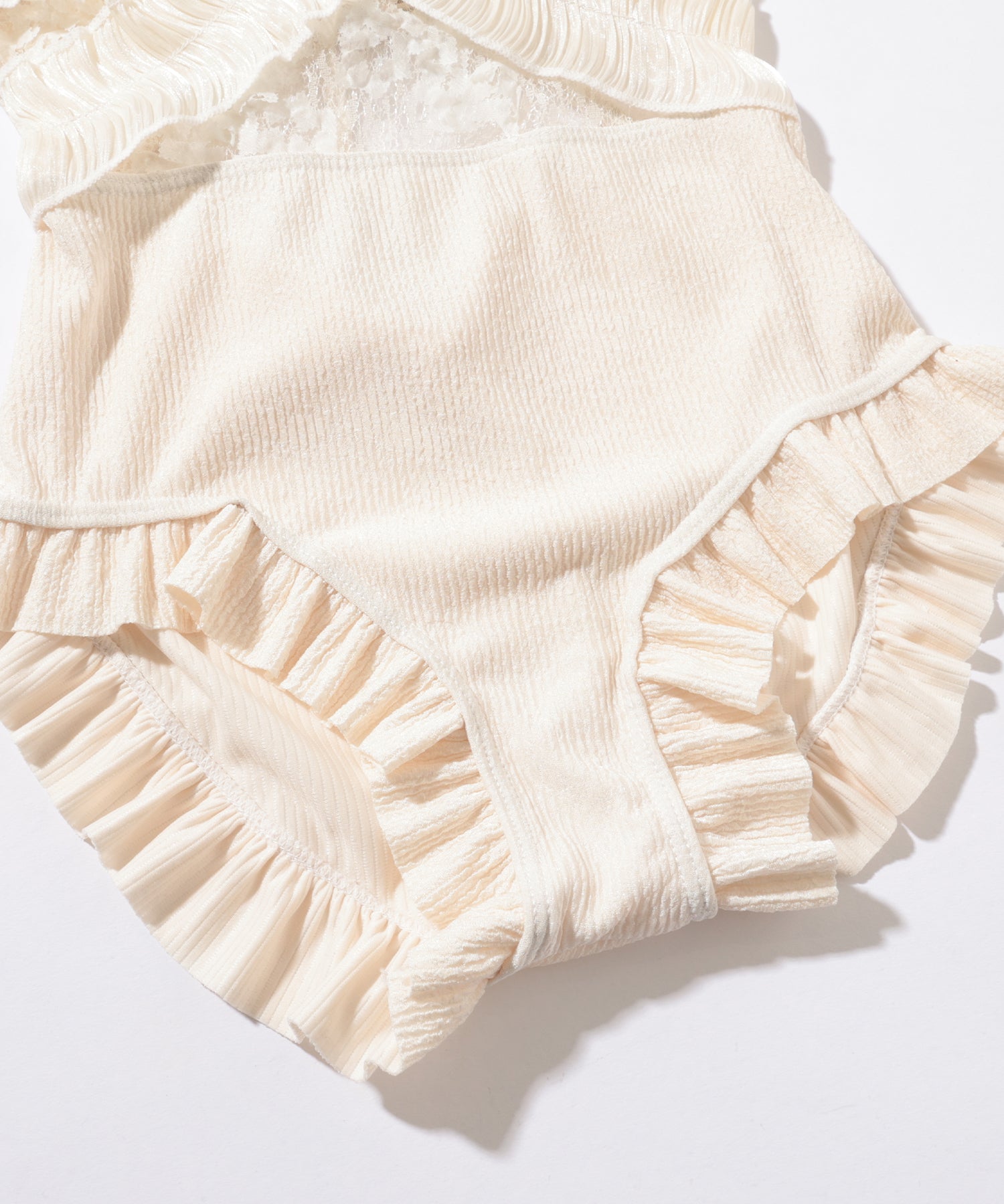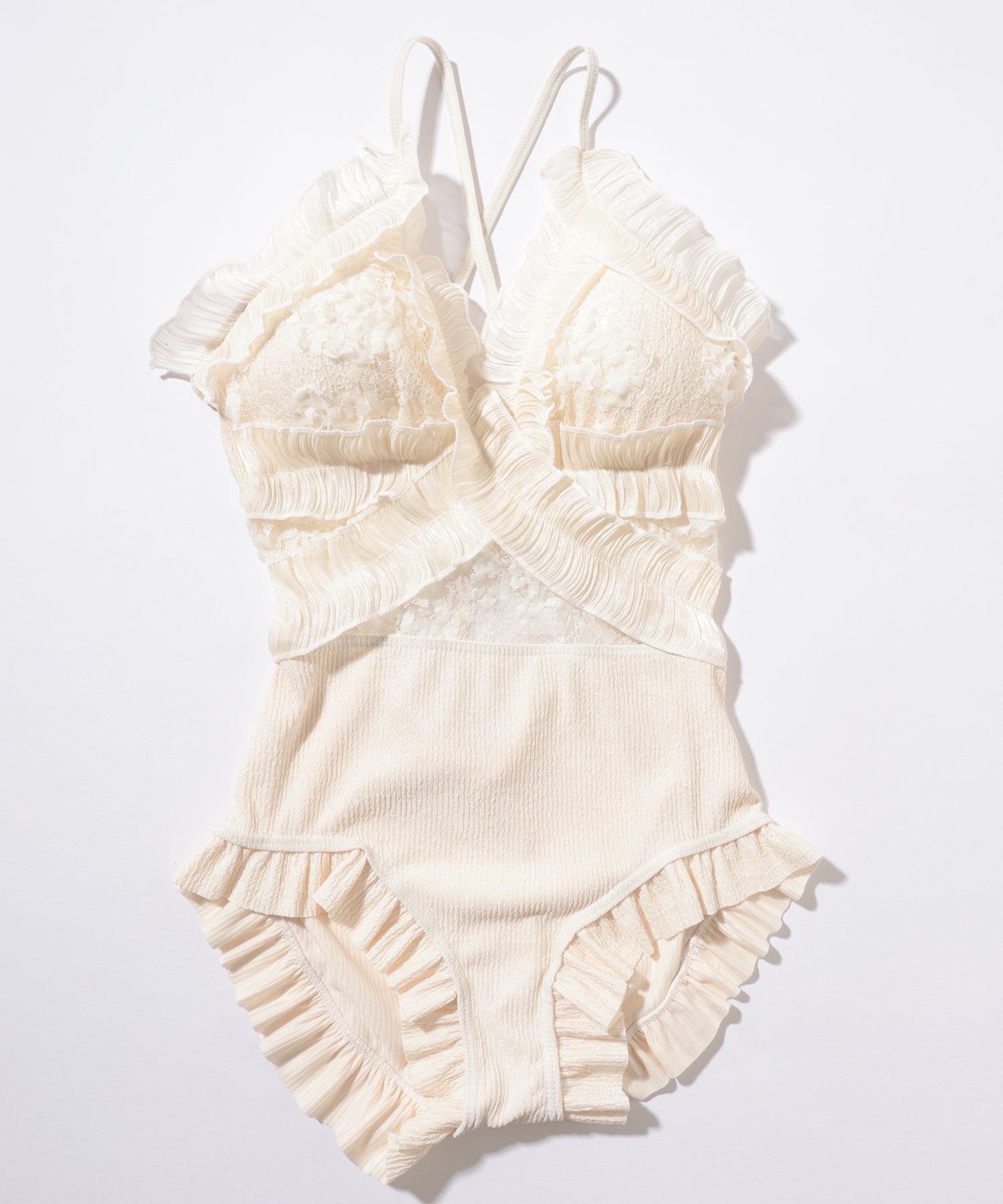 レースとフリルの組み合わせがレディなワンピースタイプの水着。
