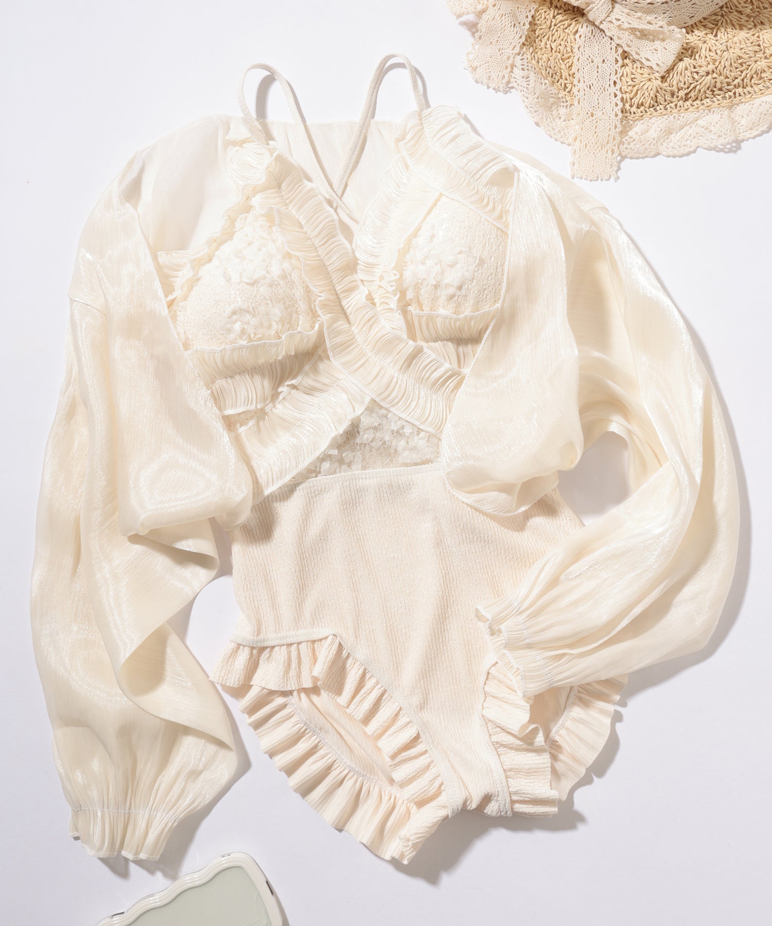 【2点セット】シアー ラッシュガード付き レース フリル ワンピース 水着