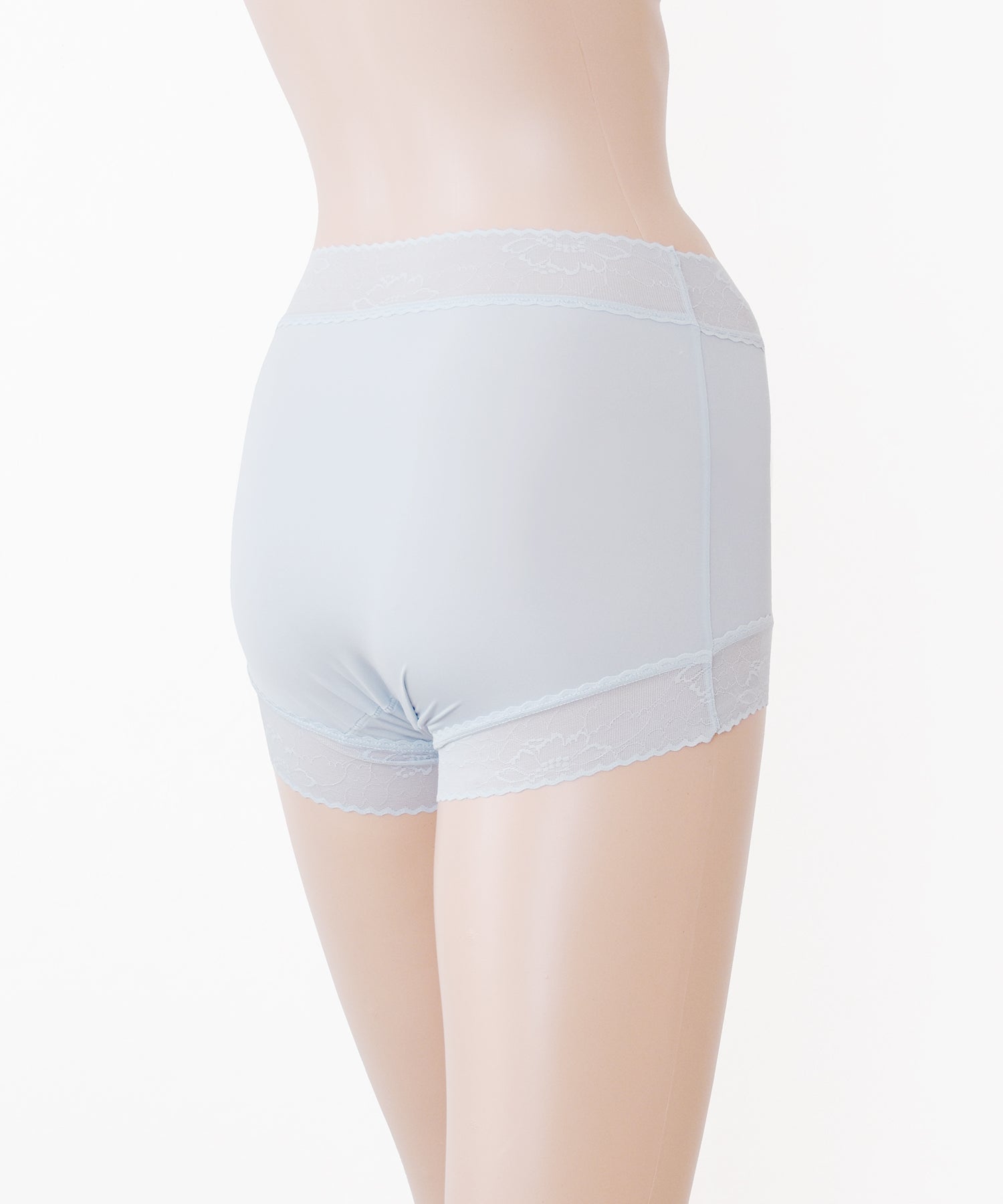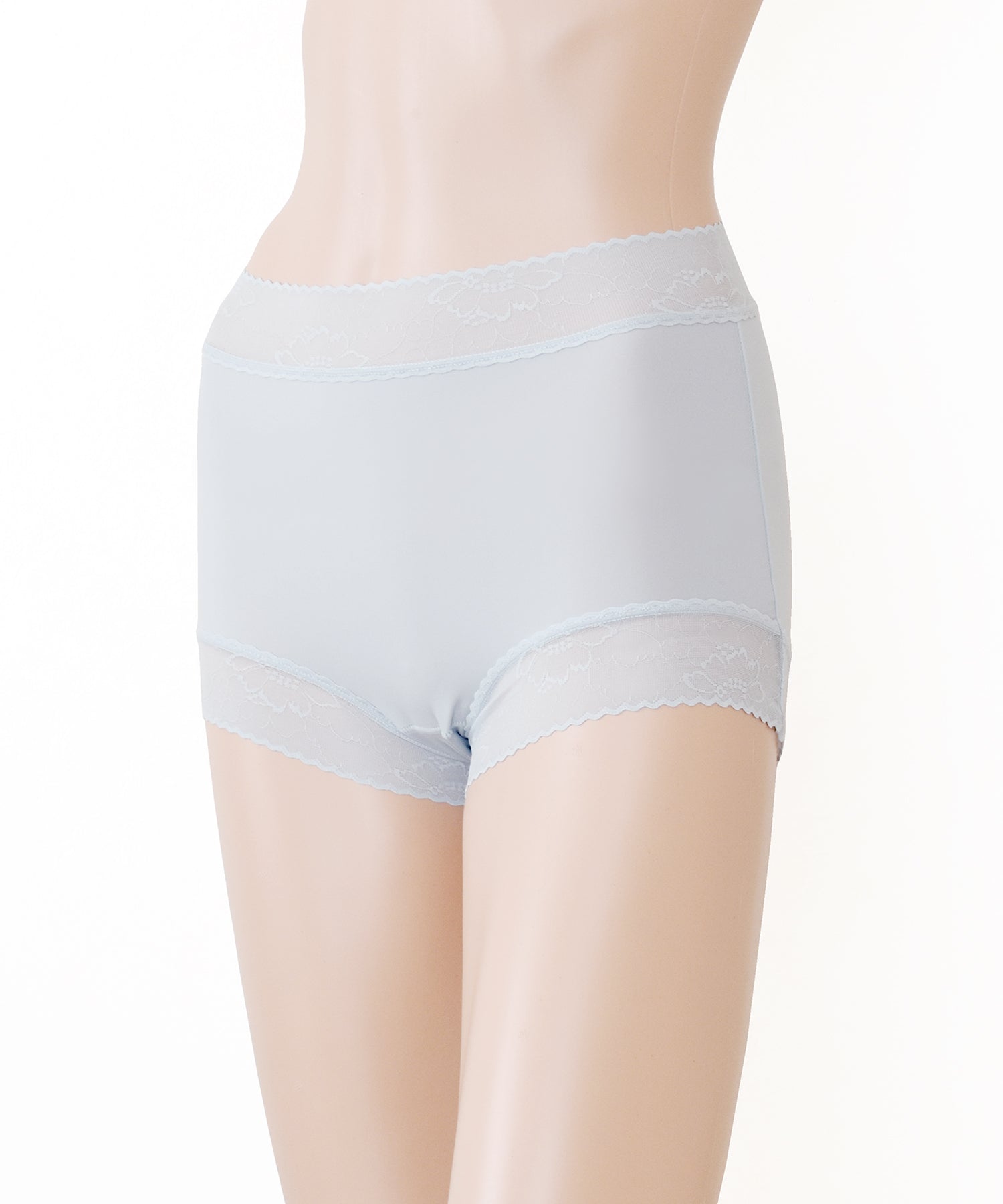 よく伸びる薄手のストレッチ素材でお腹やお尻もらくちん。ウエストやヘム部は響きにくいウエーブレース。安心感のある深ばきボックスタイプ。