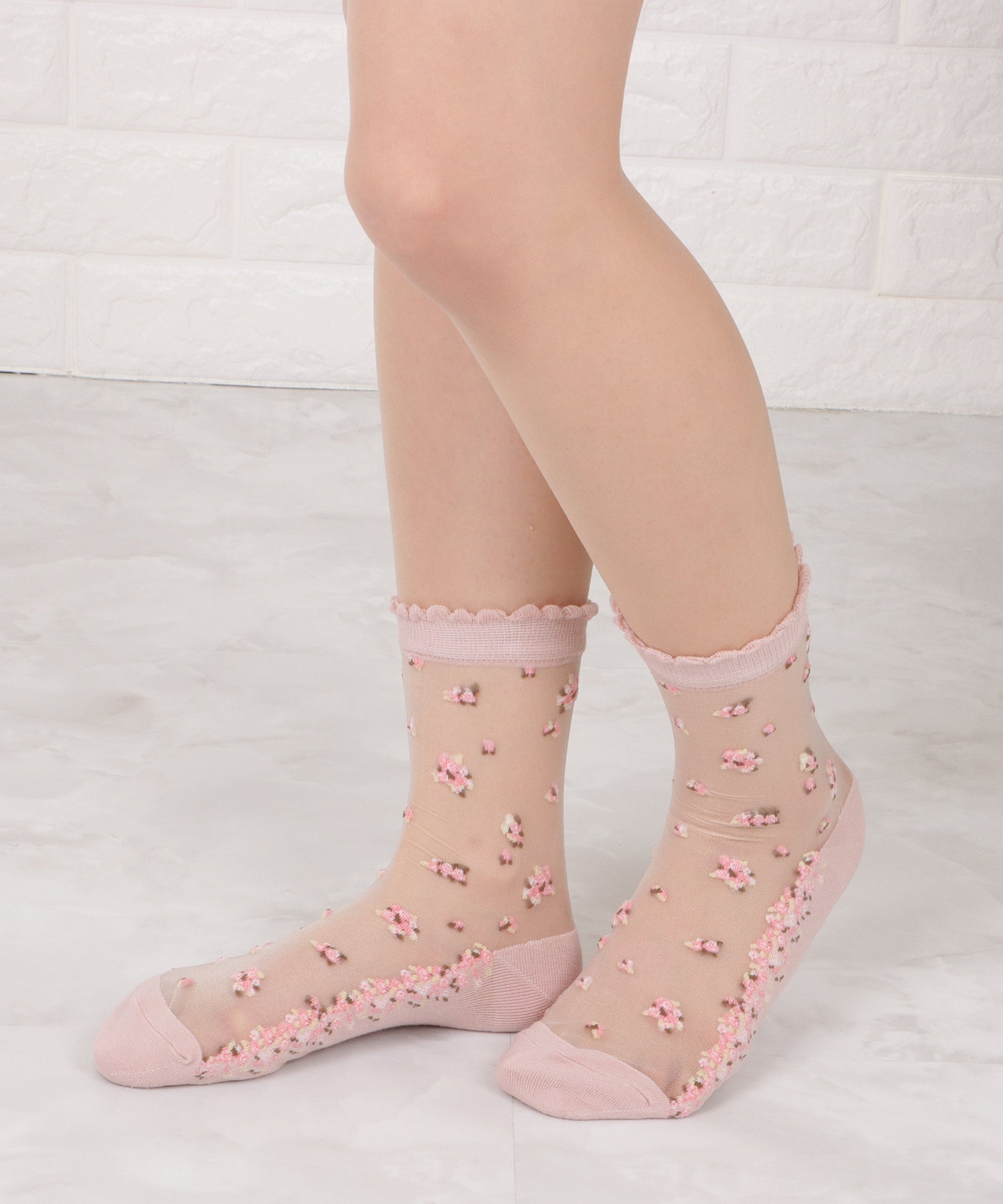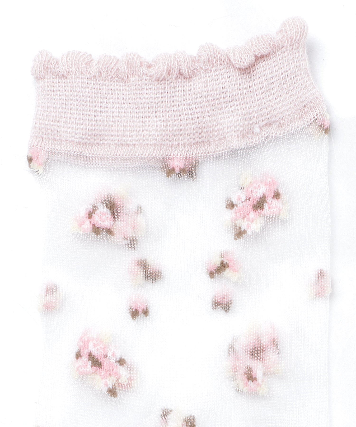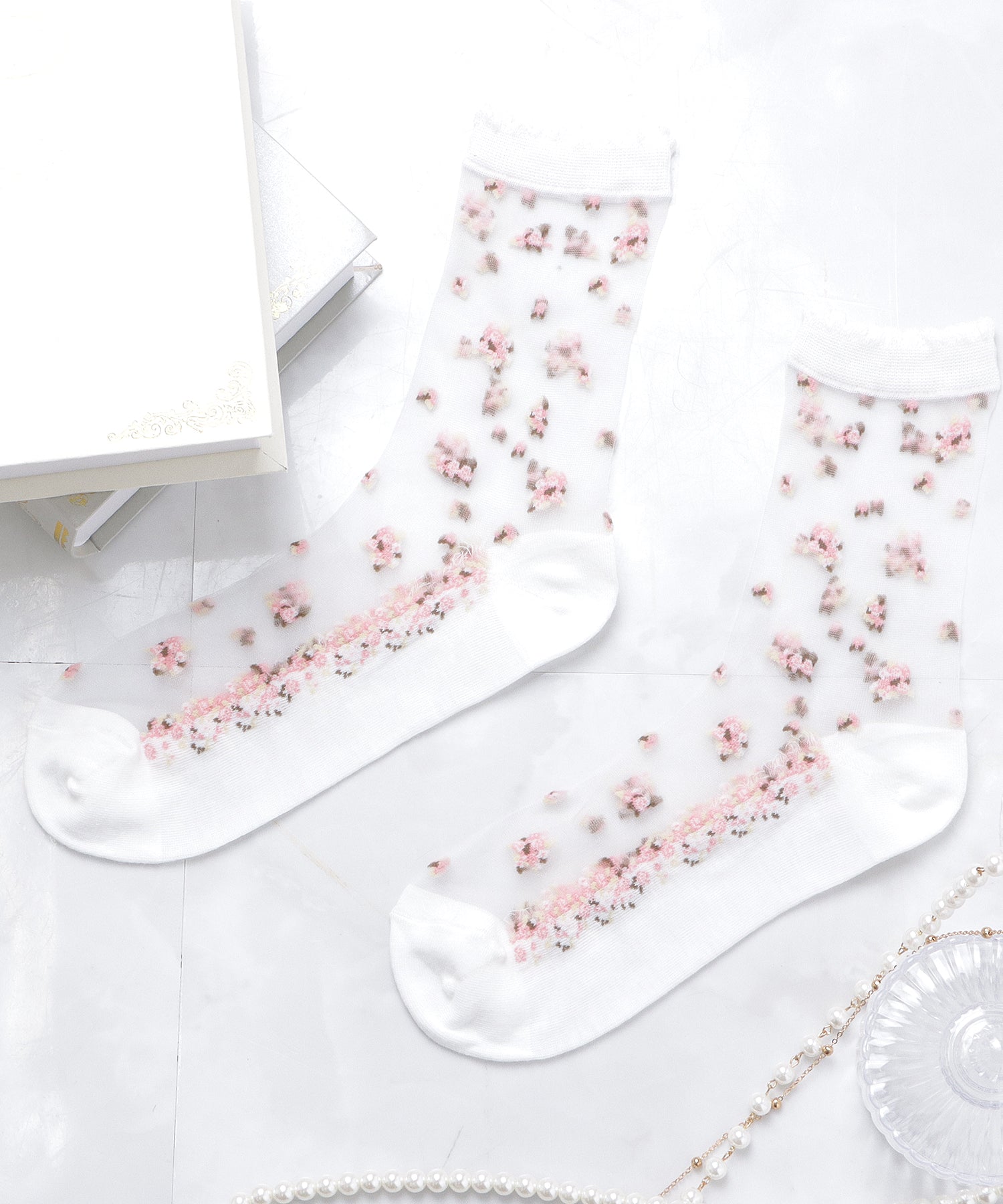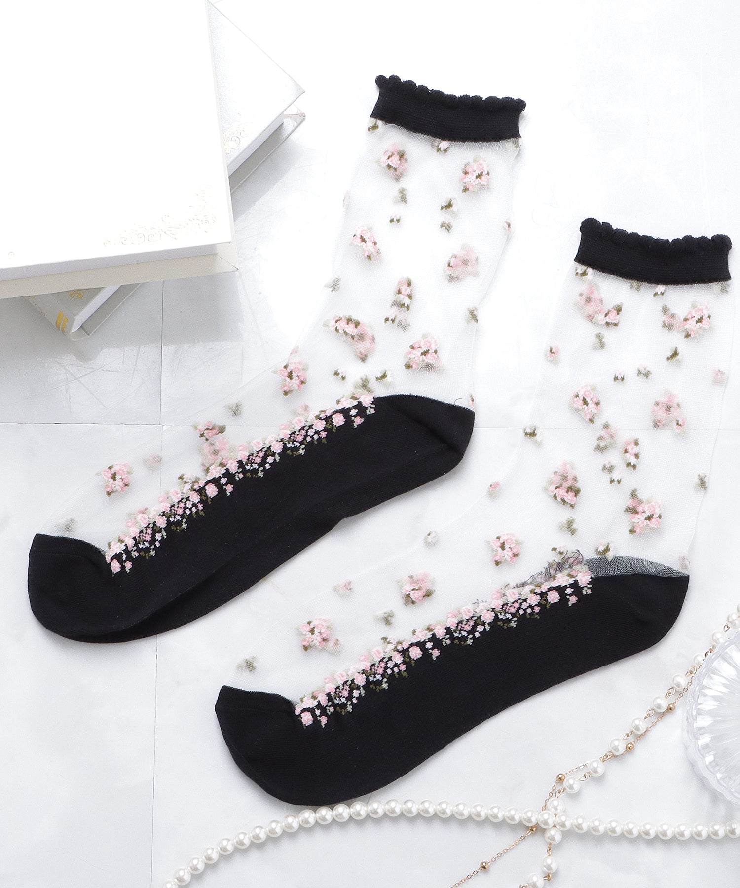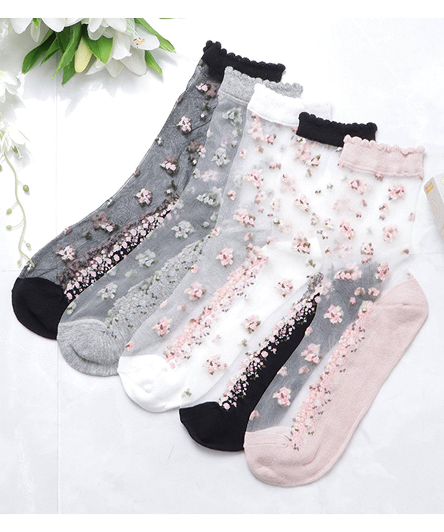上品な透け感のシースルーをベースに、柔らかな小花柄をたくさん散りばめたレディライクなソックス5足セット