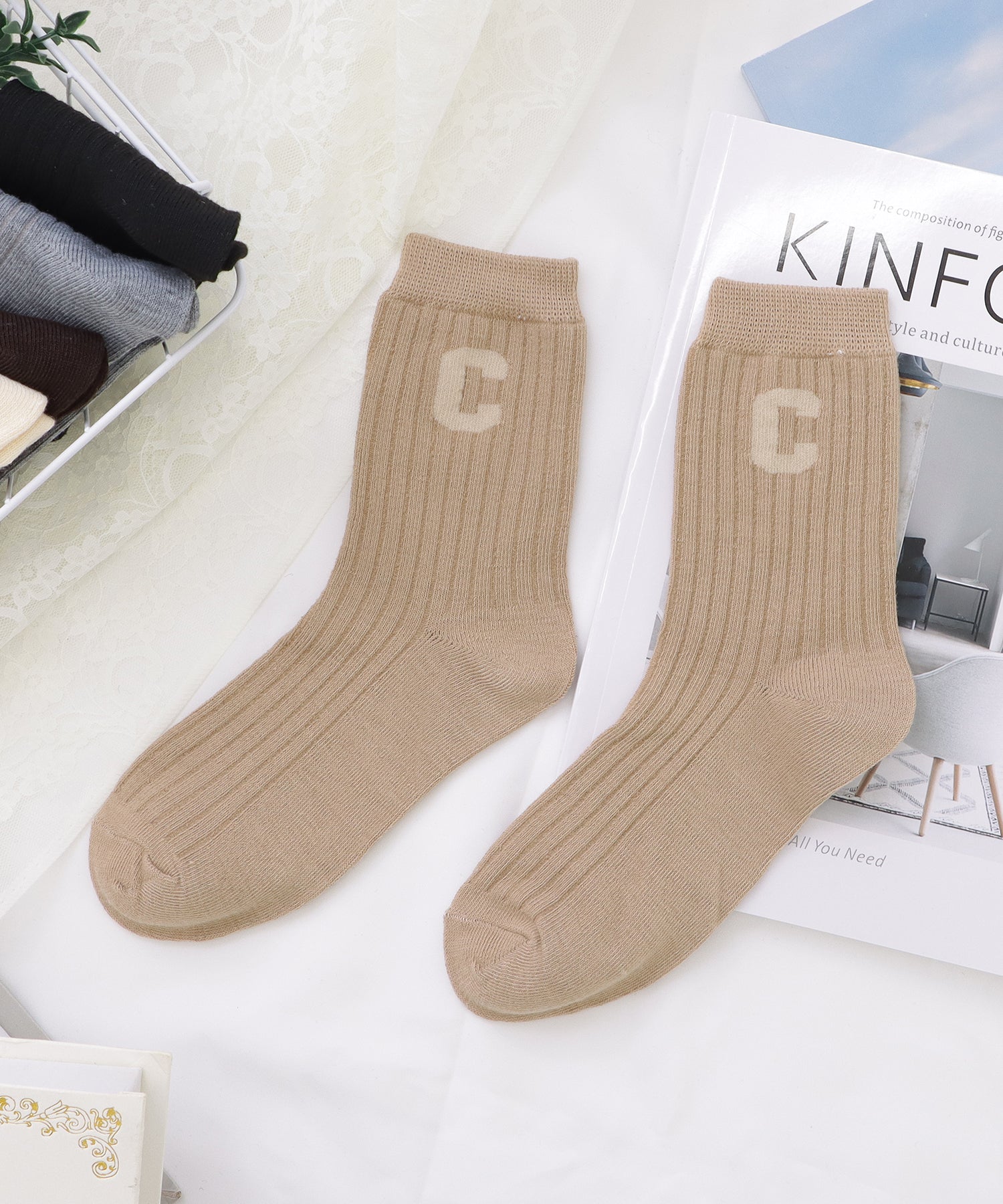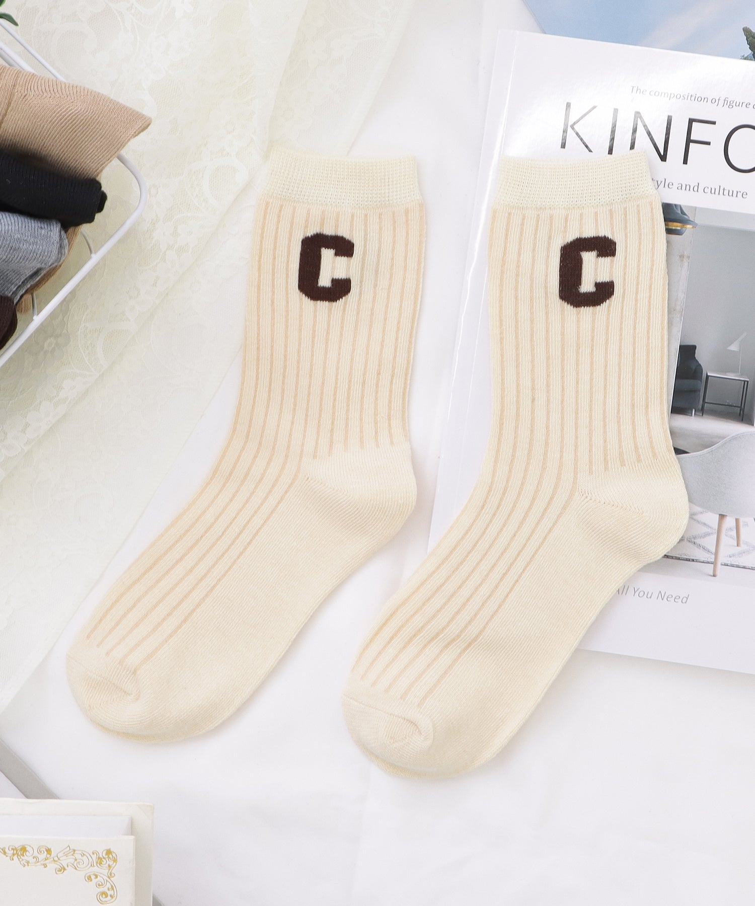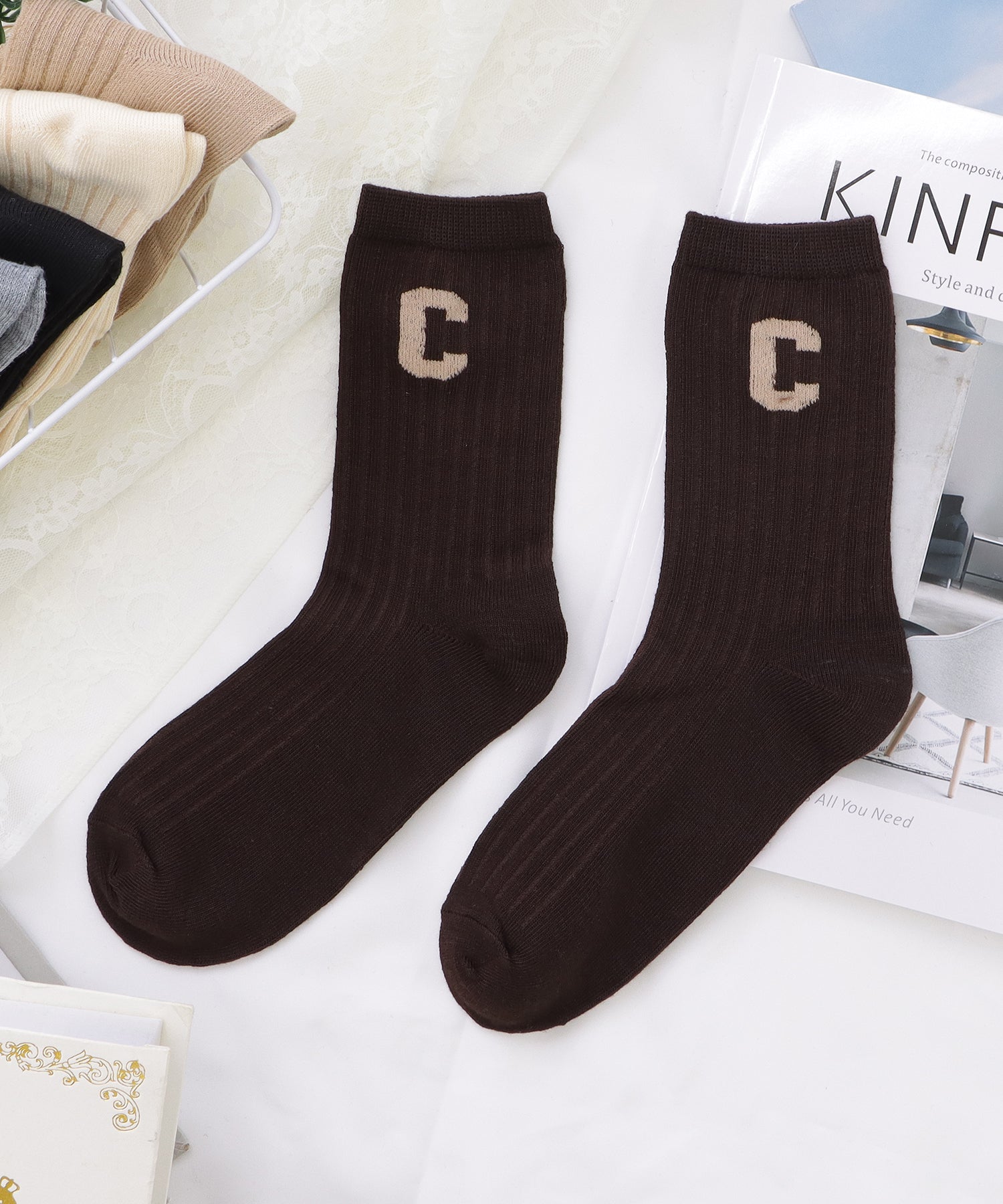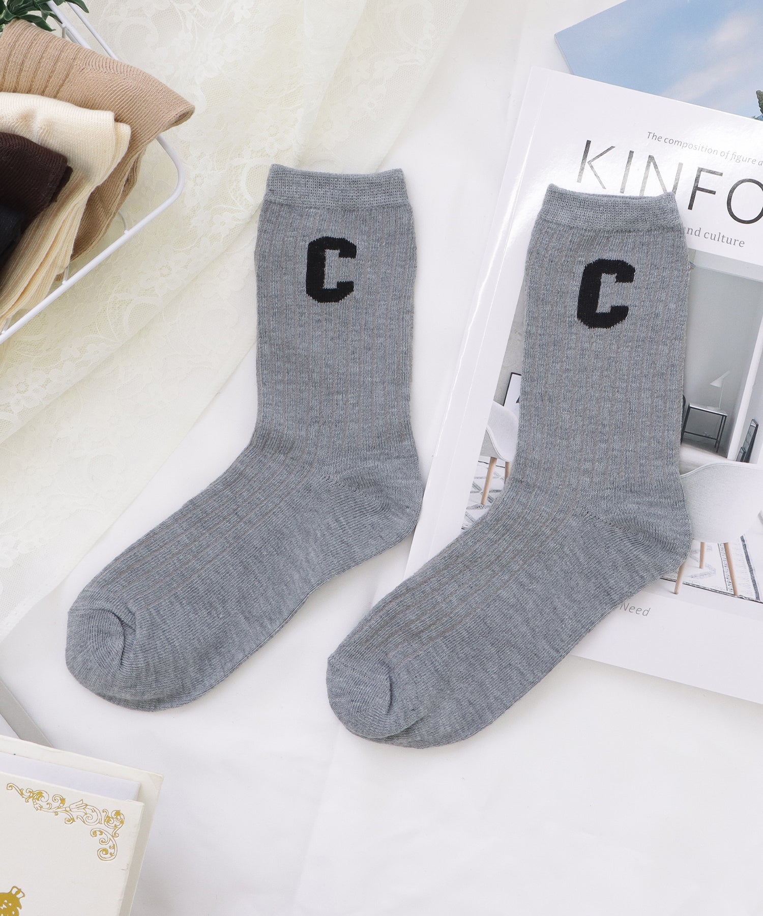 存在感のある「C」のワッペンがアクセントになった靴下