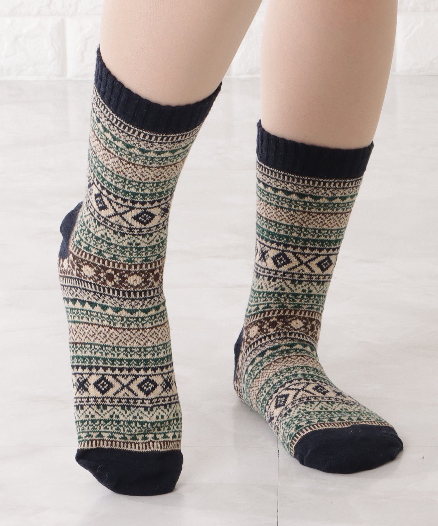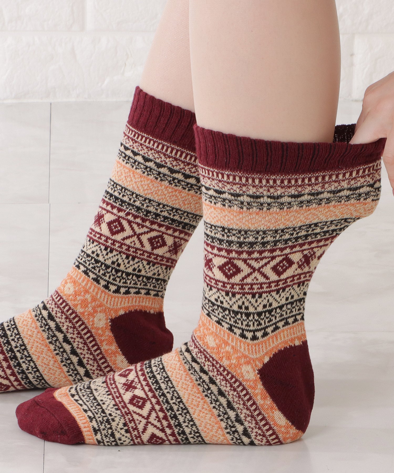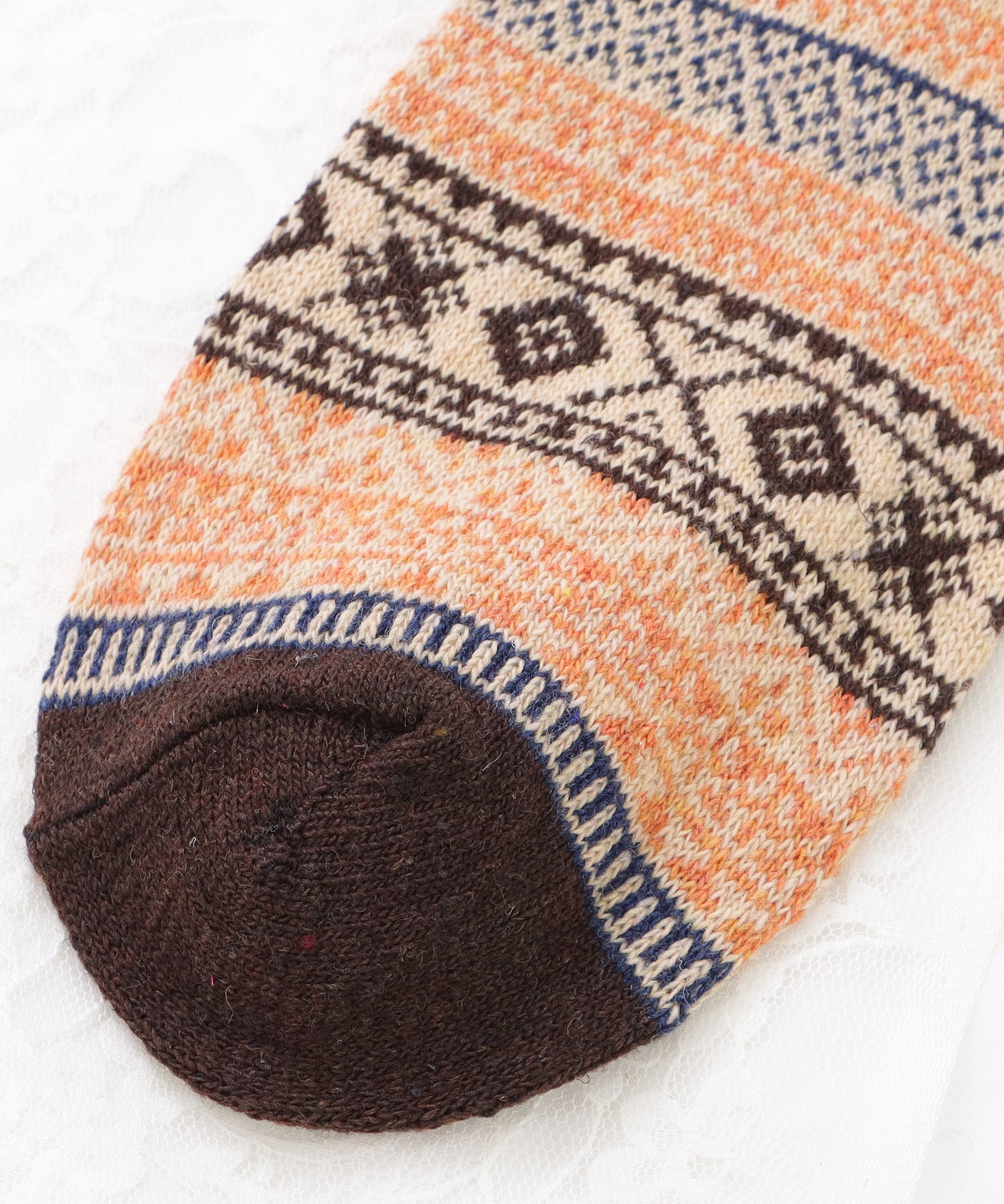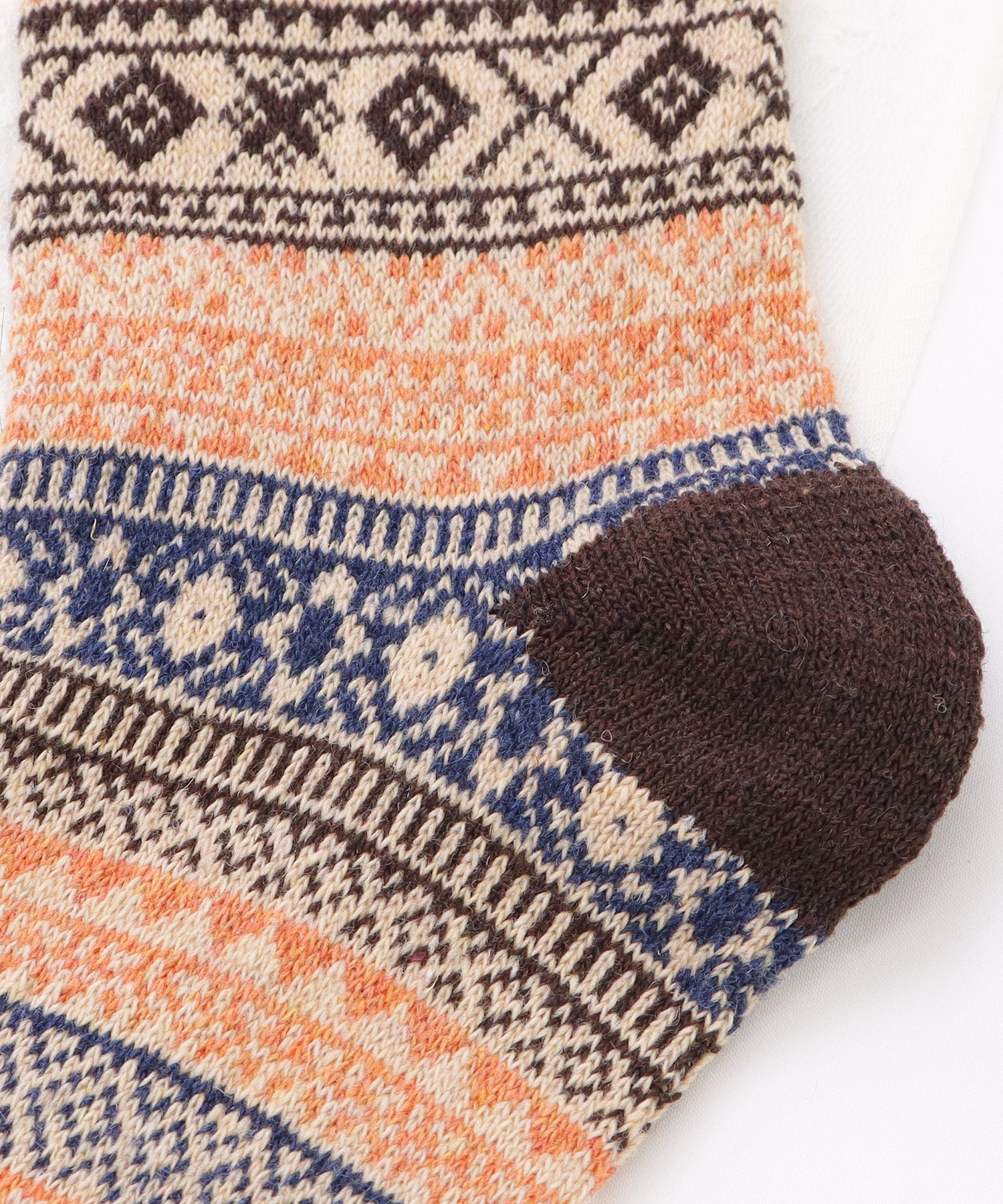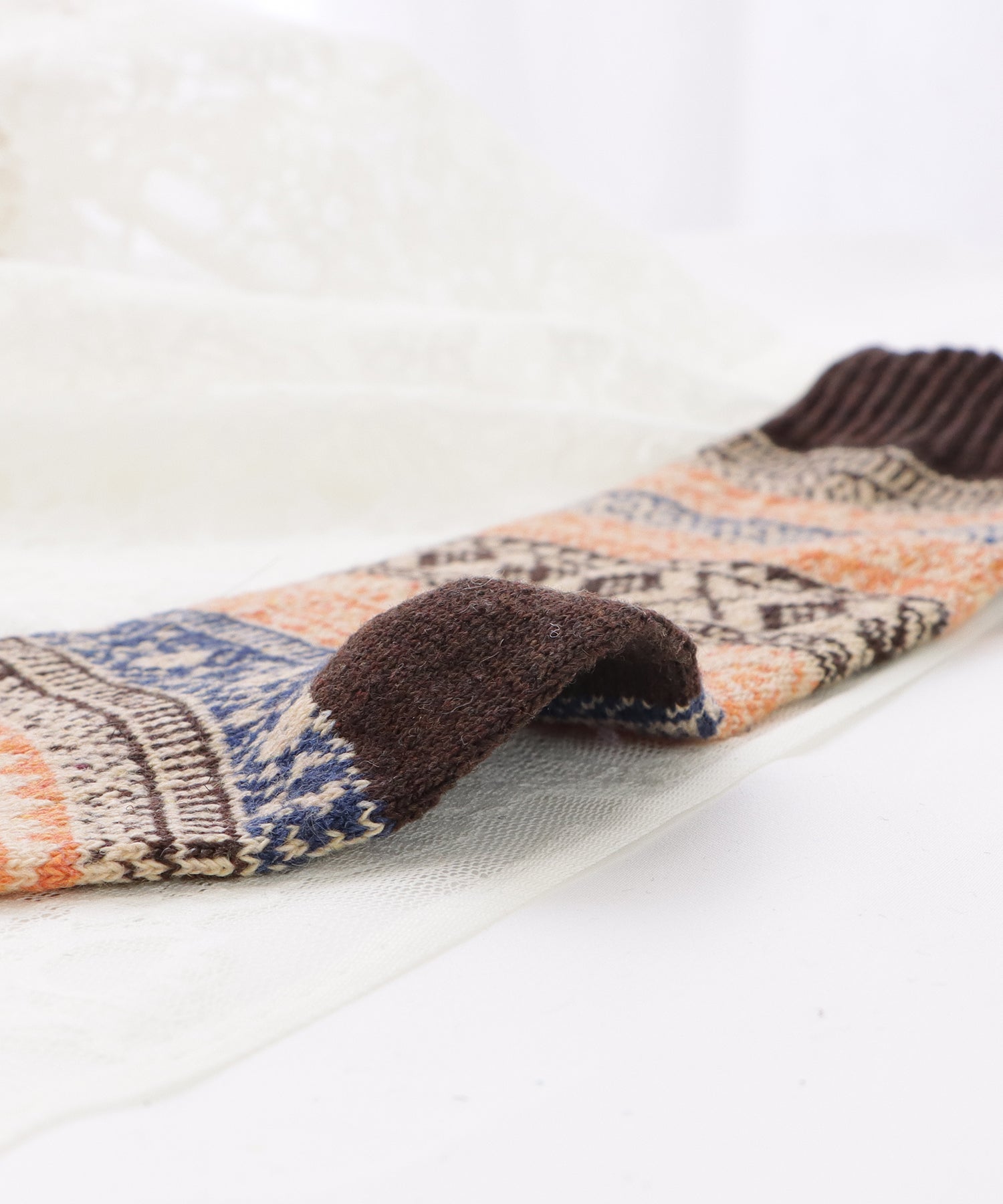 幾何学模様の組み合わせで民族調のルックスに仕上げた靴下。