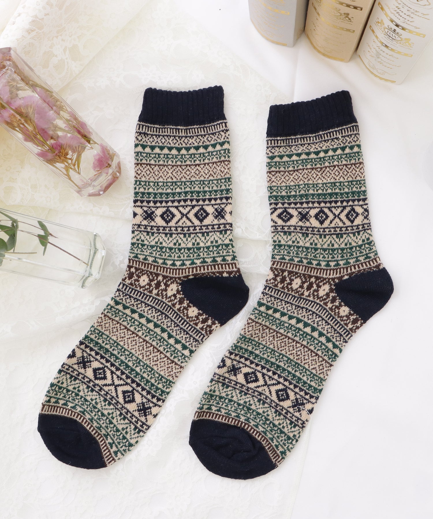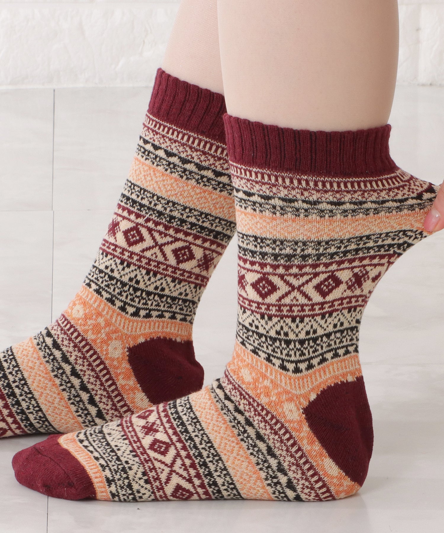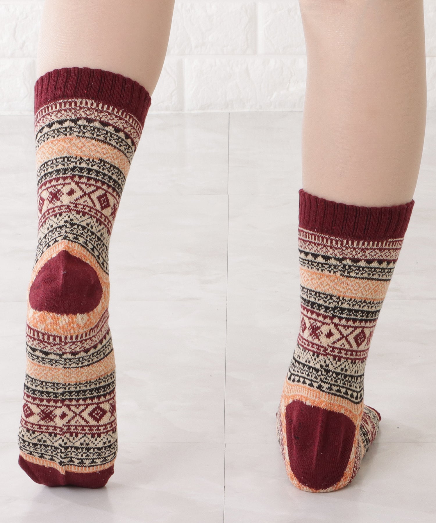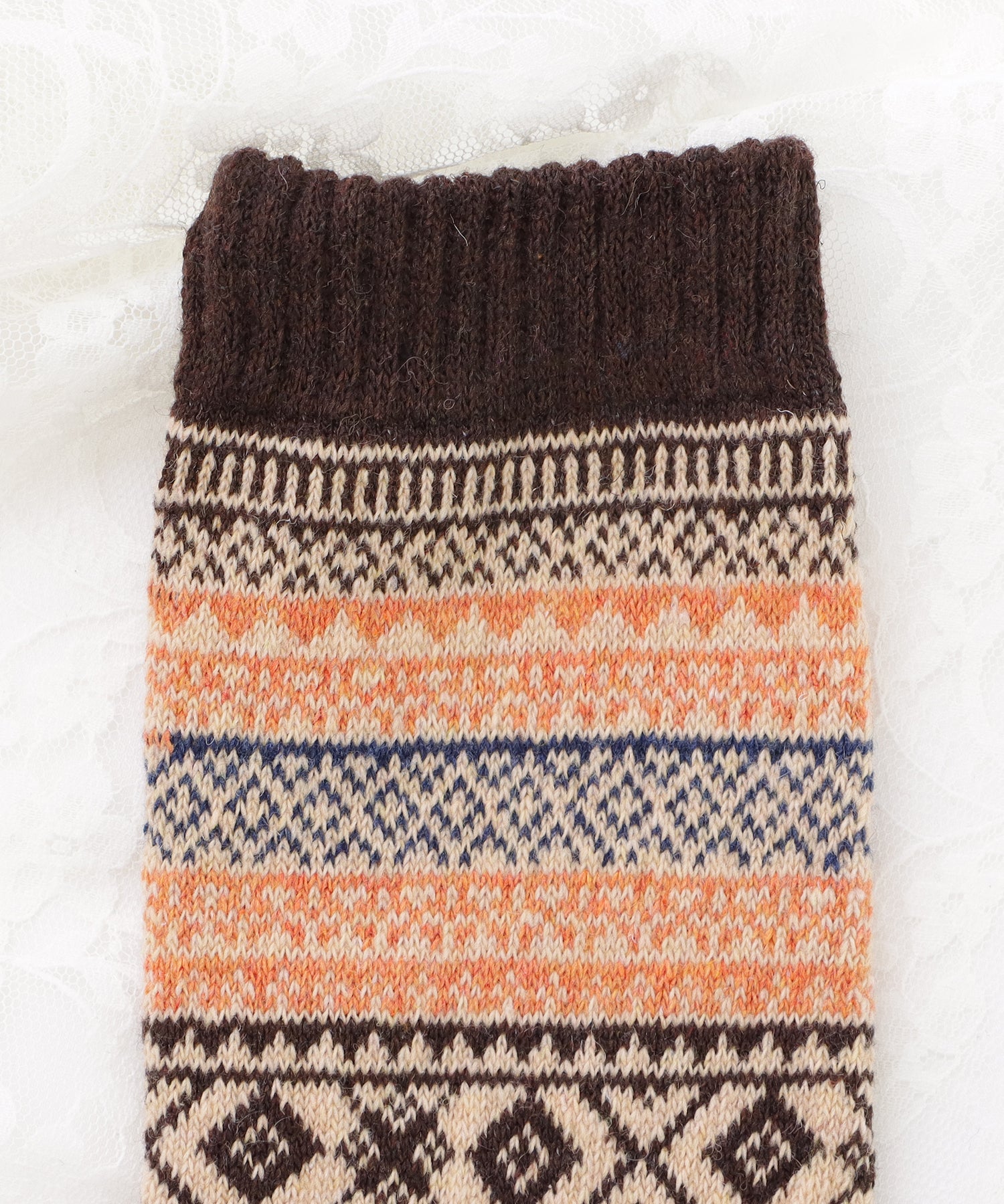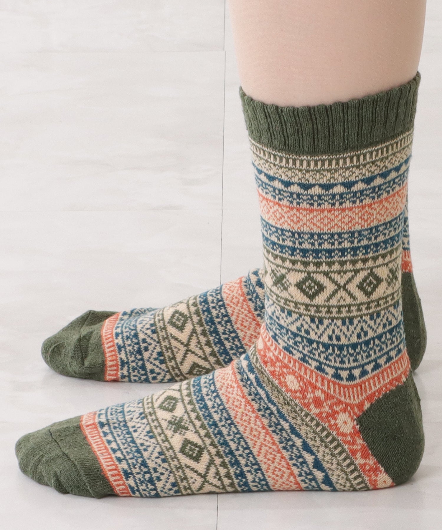 幾何学模様の組み合わせで民族調のルックスに仕上げた靴下。