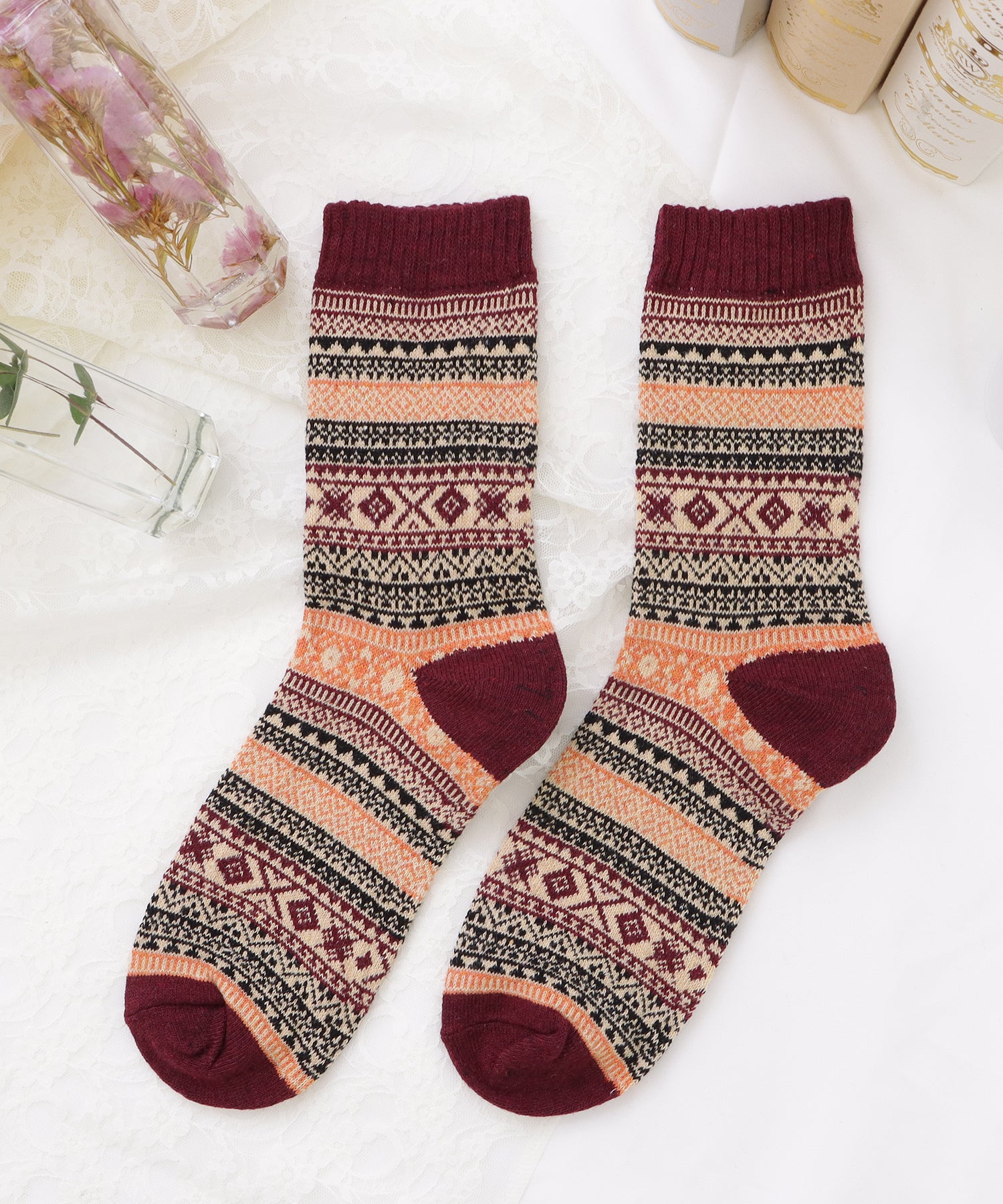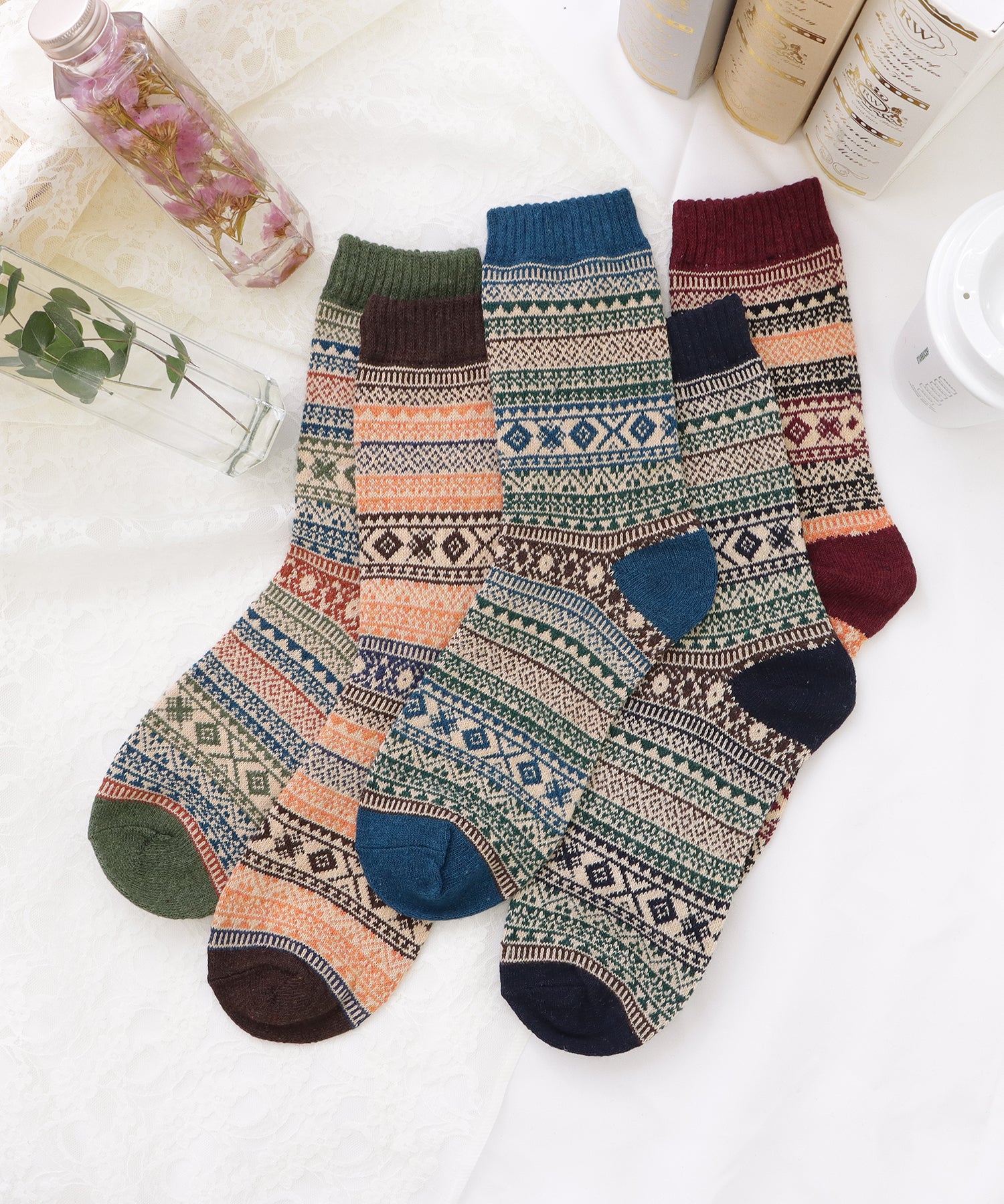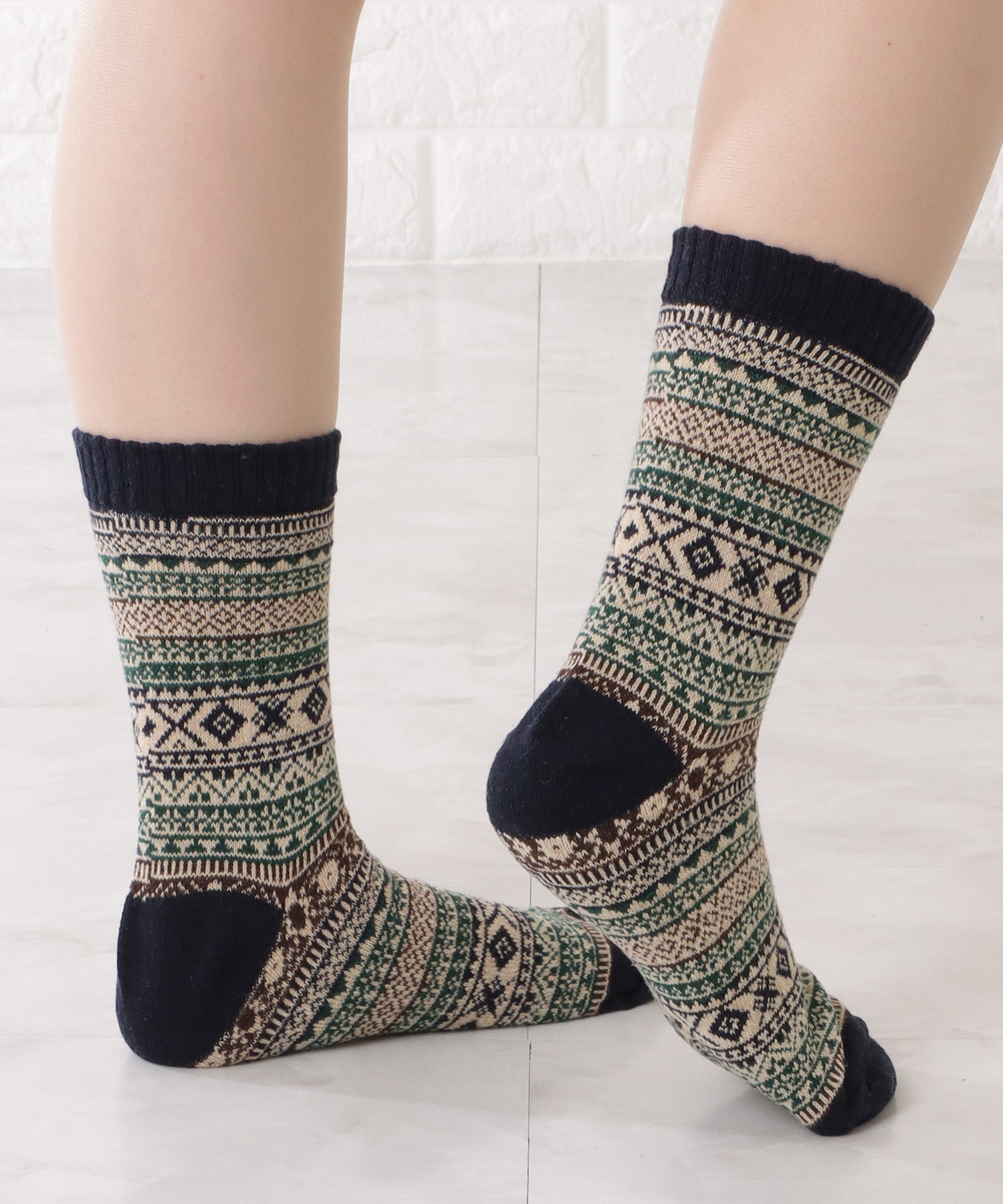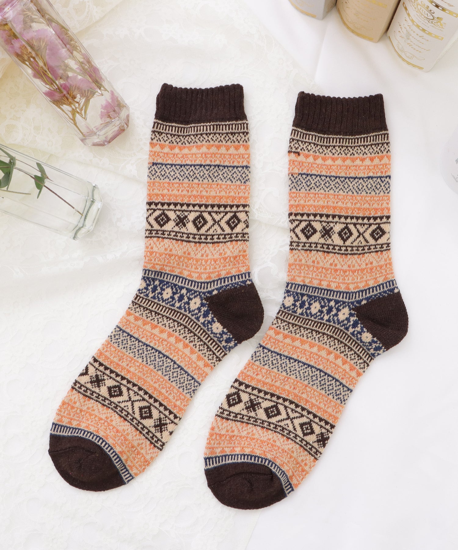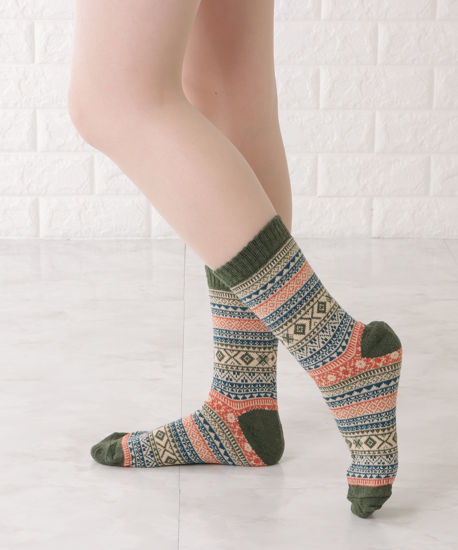 幾何学模様の組み合わせで民族調のルックスに仕上げた靴下。